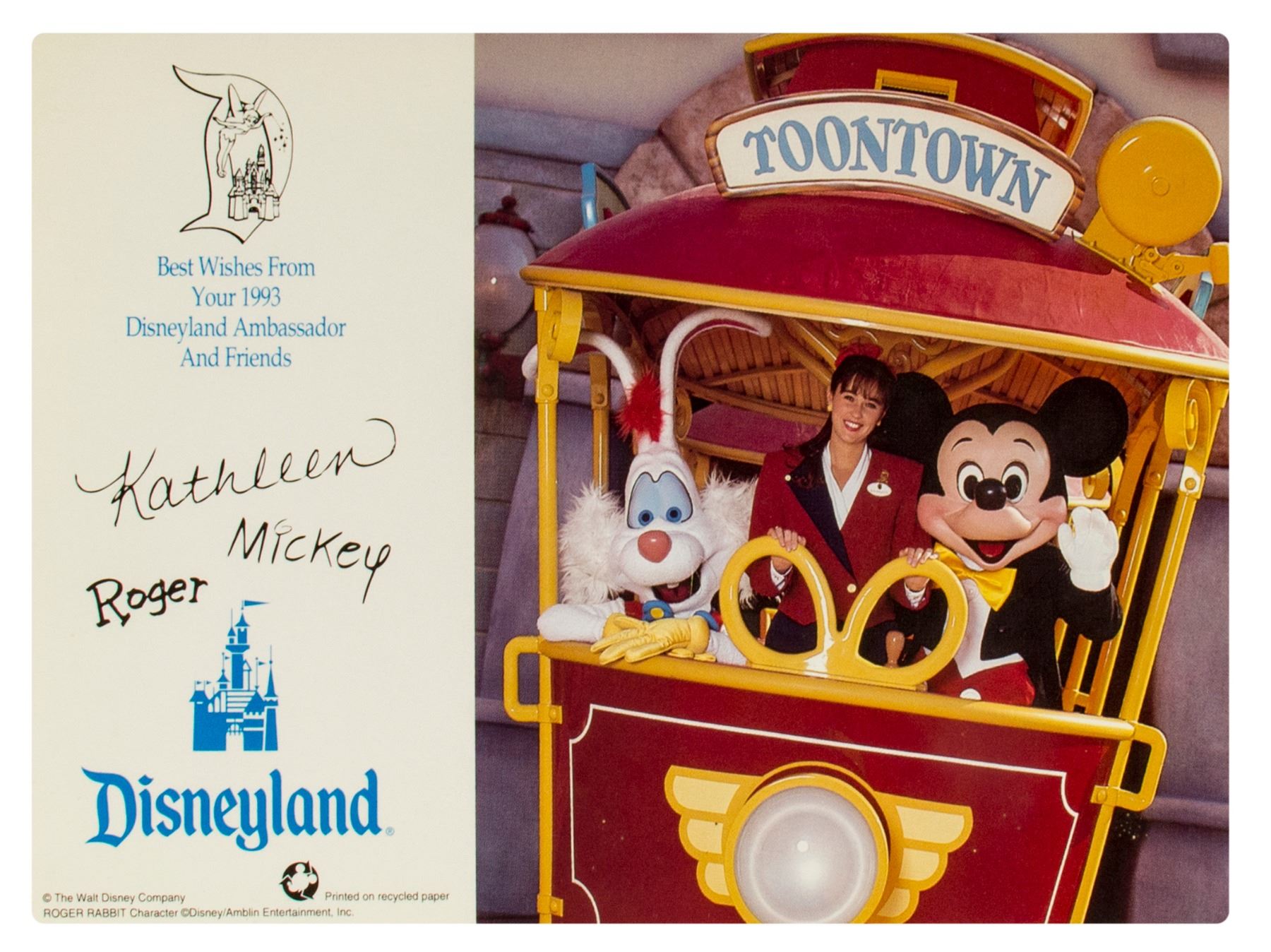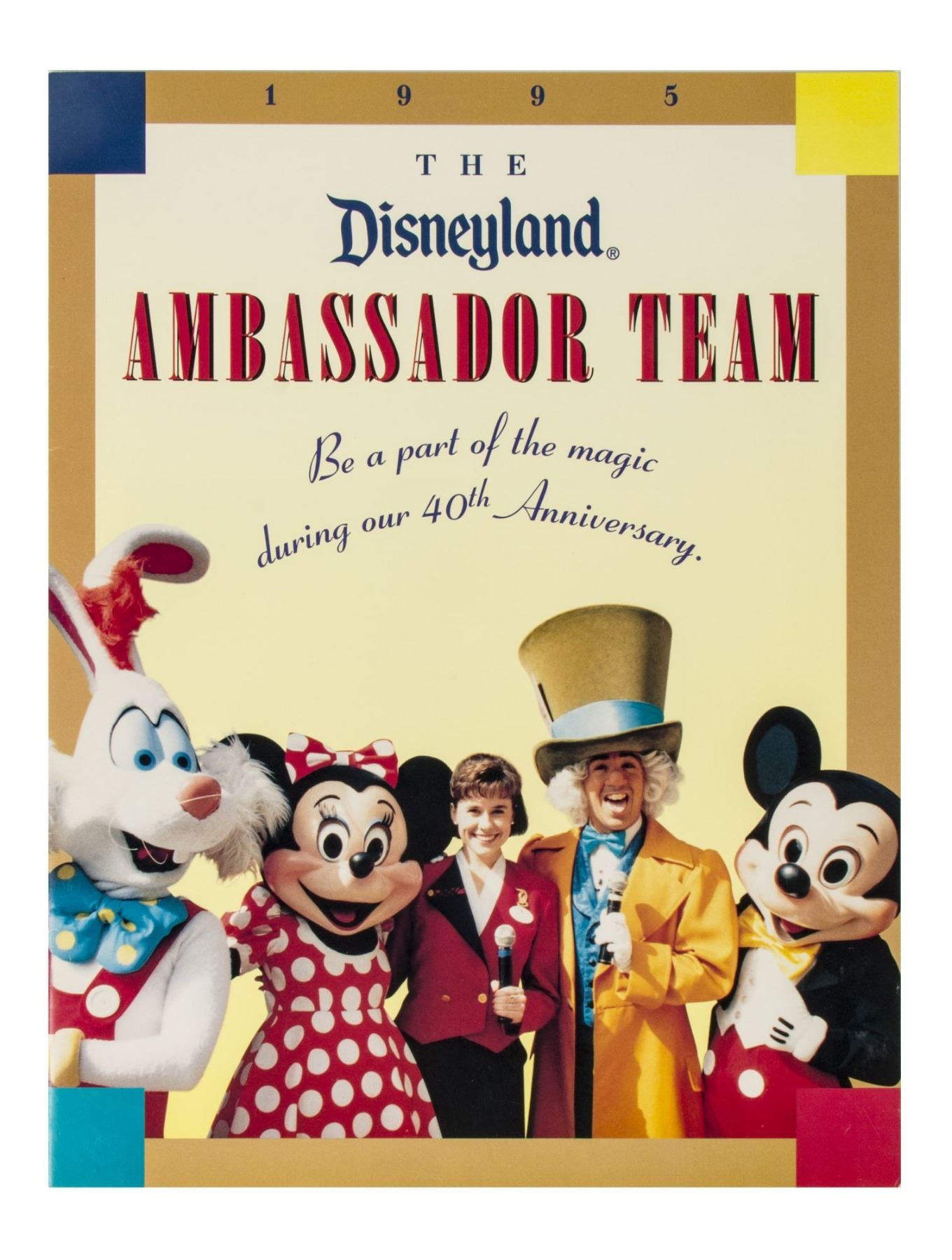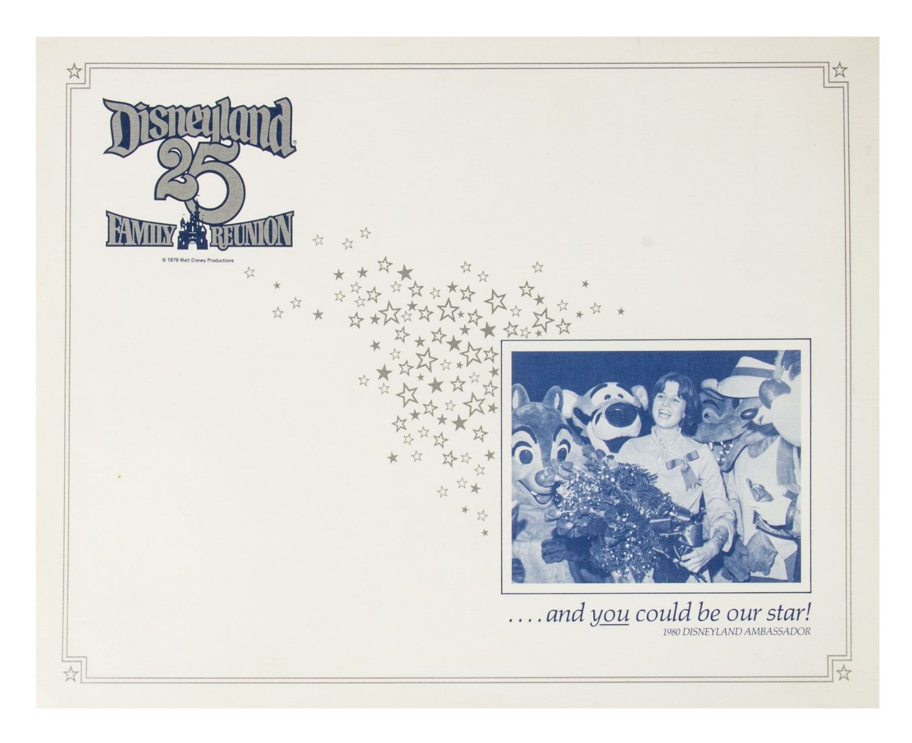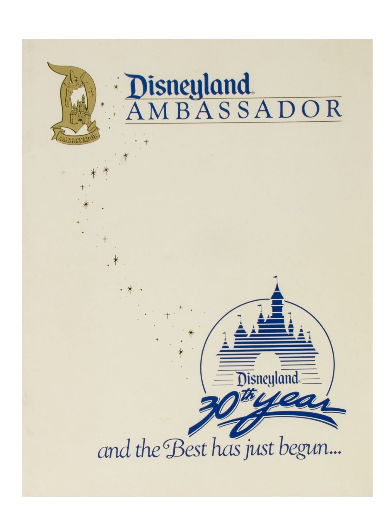 (Disneyland, 1978-95) A large collection of programs, invitations, press releases, and other promotional documents relating to the long-standing tradition of Disneyland Ambassadors. The first Disneyland Ambassador was Julie Reihm in 1965, and since the park's Tencennial Celebration, new Ambassadors have been selected every year. This collection includes (7) brochures with information on the Ambassador Program that encourages the reader to considering becoming a Disneyland Ambassador, (2) Toontown Ambassador photo cards, a Disneyland Ambassador cast member recommendation form with a letter, list of requirements, and the original envelope, an invitation to the Ambassador Silver Jubilee Celebration, a Disneyland Ambassador Silver Jubilee press kit, and a brochure and mail in form for the Ambassador Program from Disneyland's 25th Anniversary. The majority of the documents measure either 11"x8.5" or 12"x9", and the condition is very good overall with minor edge-wear.
