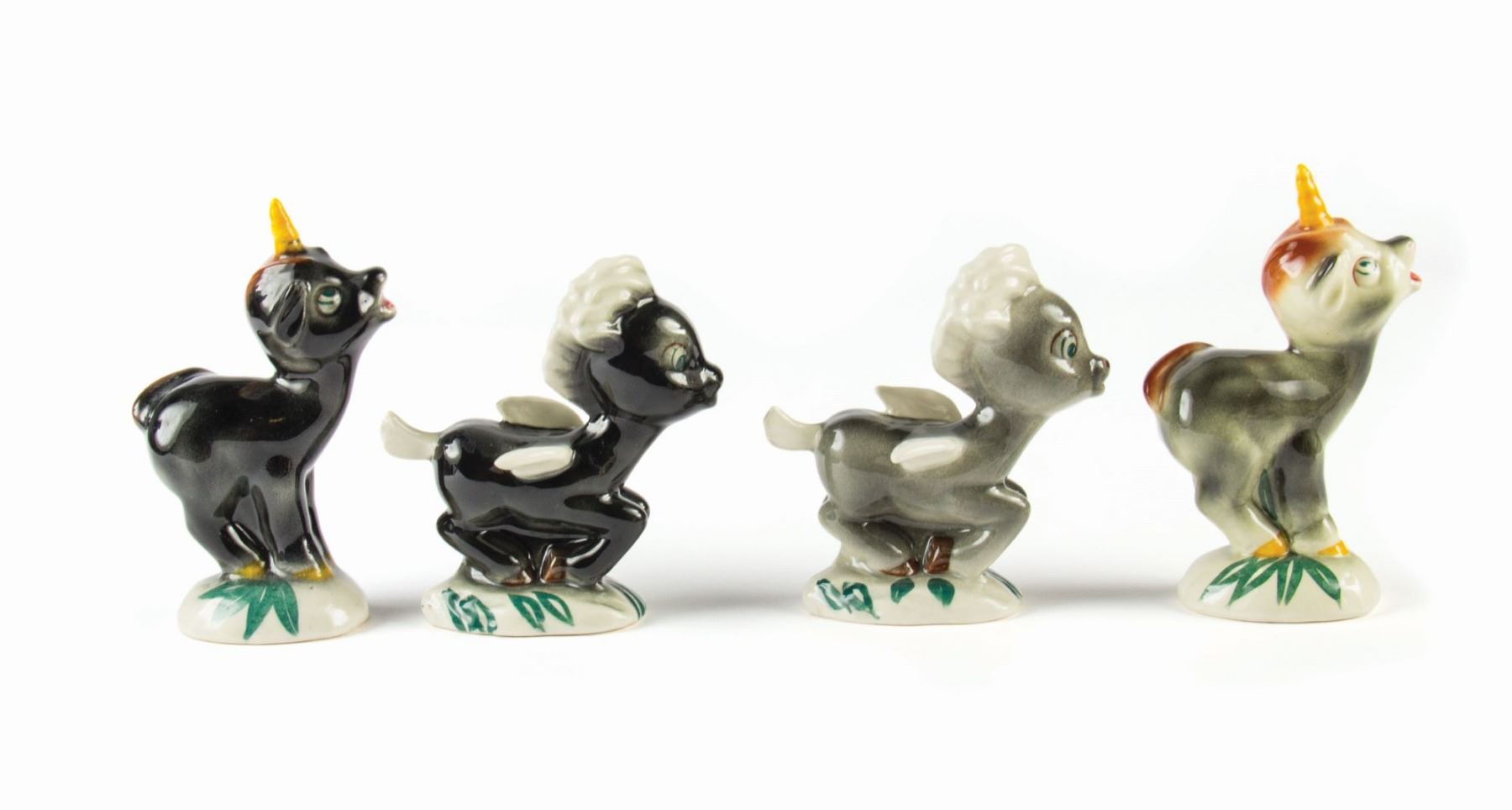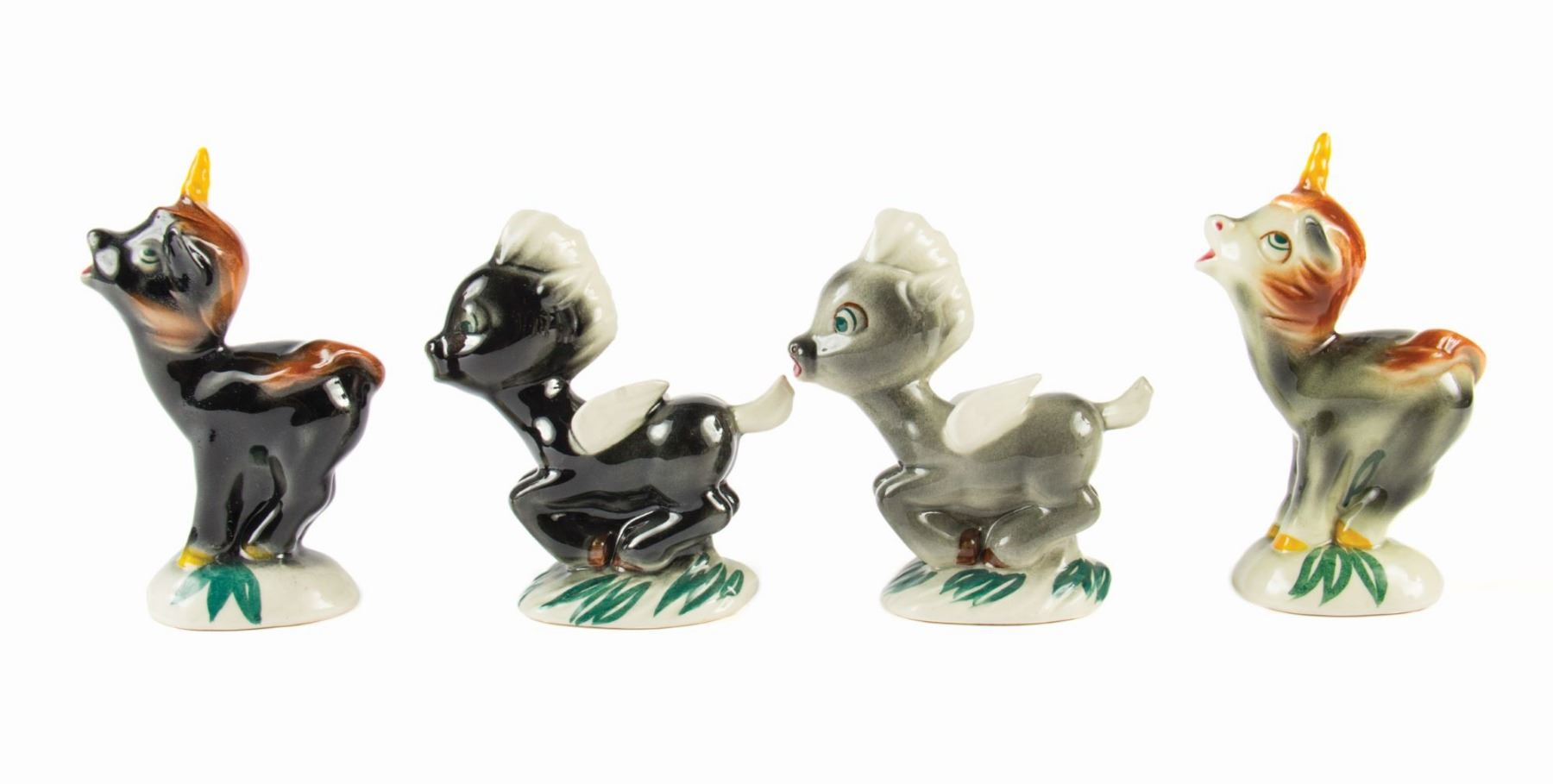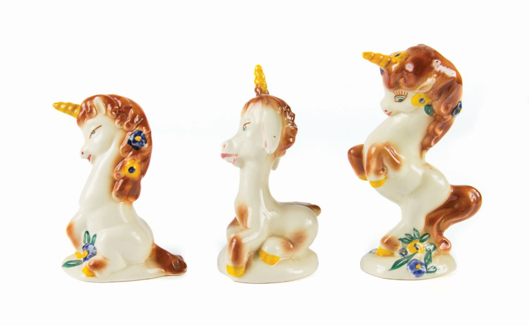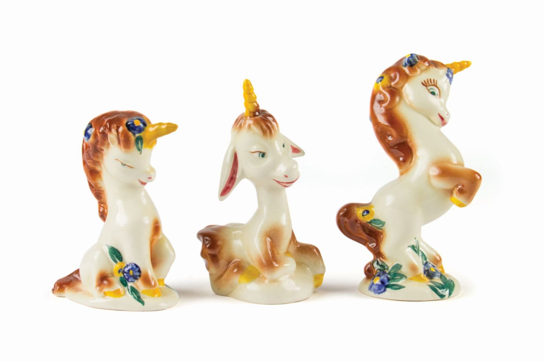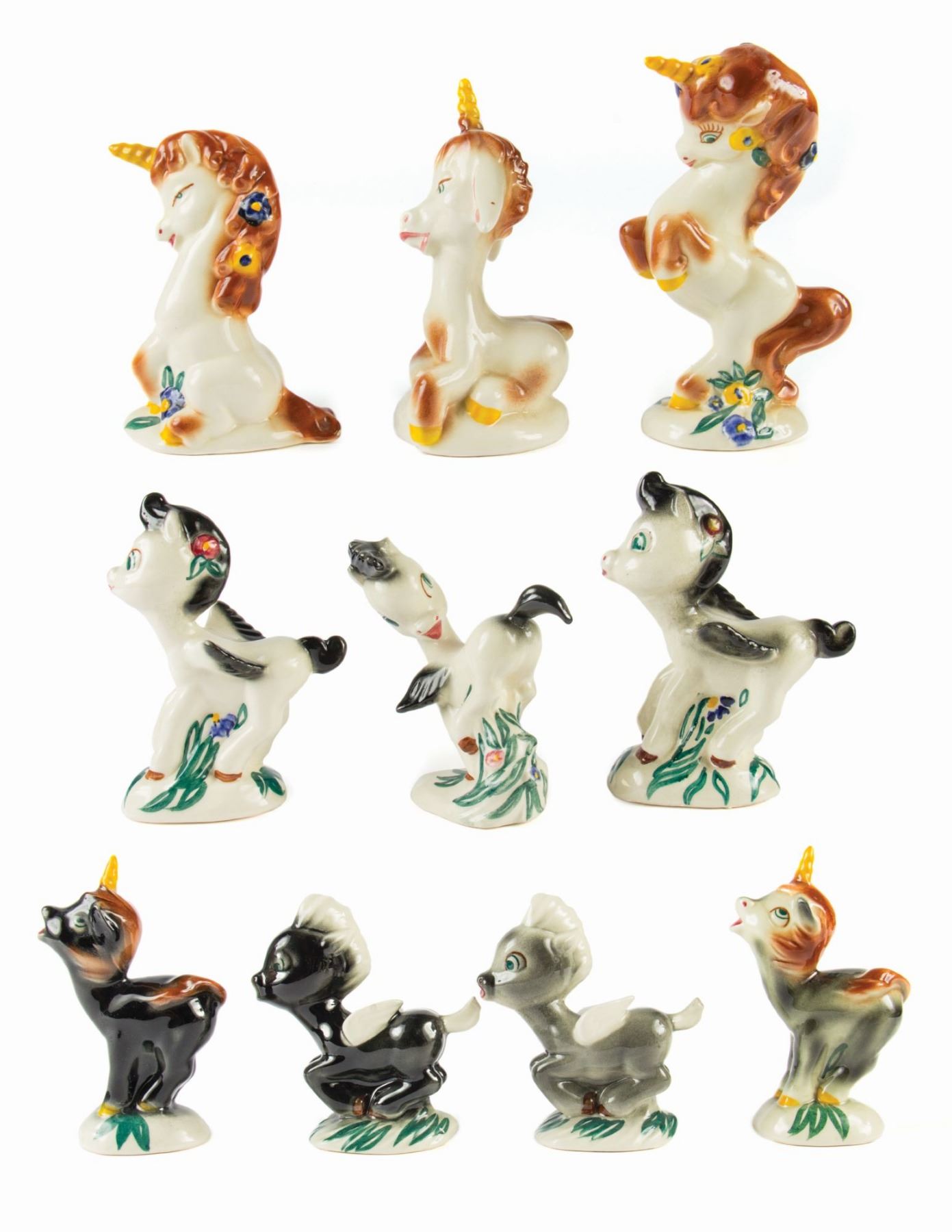 (Vernon Kilns, 1940) An extremely rare collection of (10) Unicorn and Pegasus figures created by Vernon Kilns and inspired by Disney's "Fantasia". The collection depicts a variety of the characters from the film, and these figures measure between 4.5" and 6" tall. The set is in overall very fine condition with little wear, and one of the figures is a duplicate.