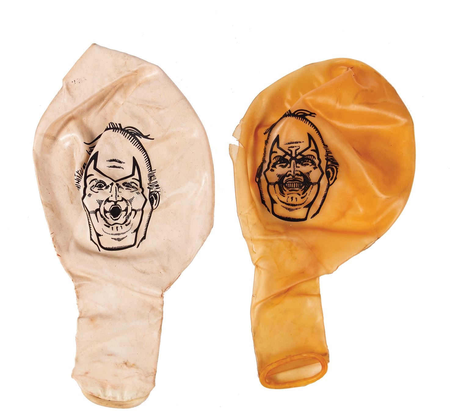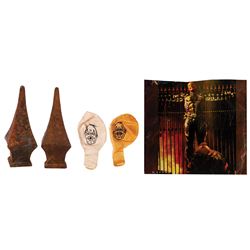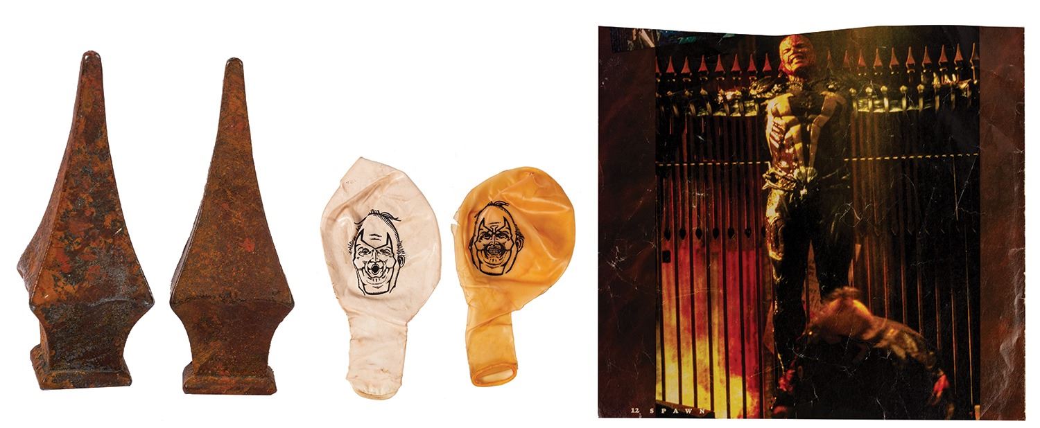 (New Line, 1997) A collection of (2) prop spires and (2) balloons created for the superhero film Spawn. The spires can be seen atop the fence where Spawn becomes trapped by Violator during their fight, and an image of that scene is included. The spires come from the esteemed prop collection of Chris Kiszka. A letter of provenance from Kiszka will be provided to the winning bidder. The spires are approximately 5"x1.75" and the balloons are approximately 5.75" long. The condition of the spires is very good, with some signs of wear and rusting, but it is impossible to tell whether this is from age or is the original screen condition. The balloons are in poor to fair condition, with multiple tears to the latex throughout, although the image on both is undamaged.