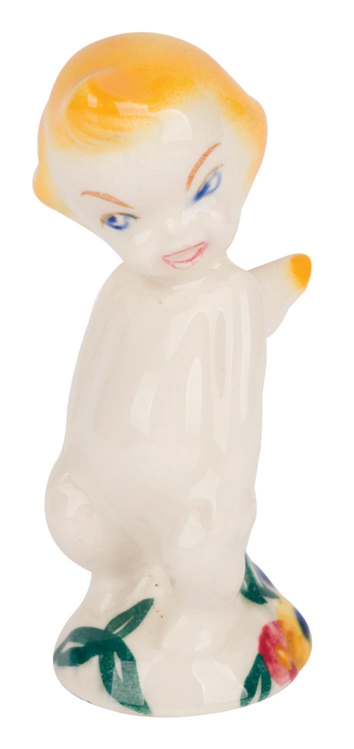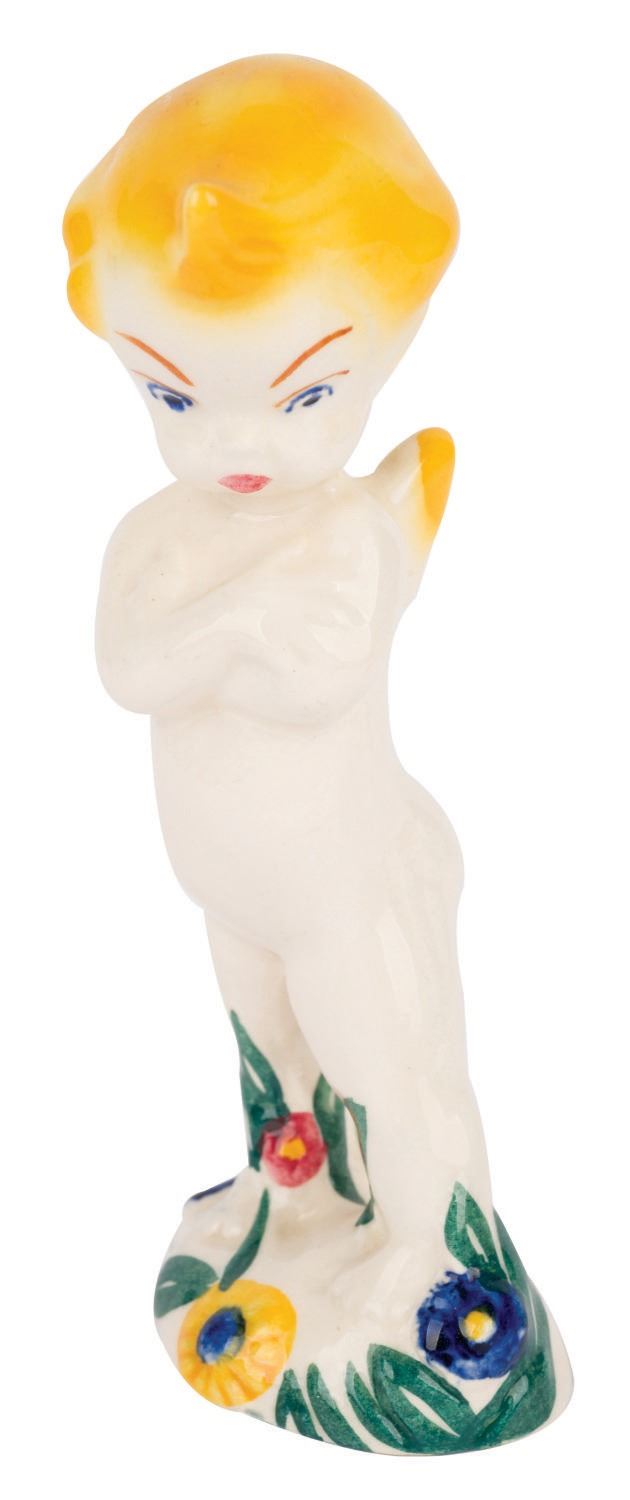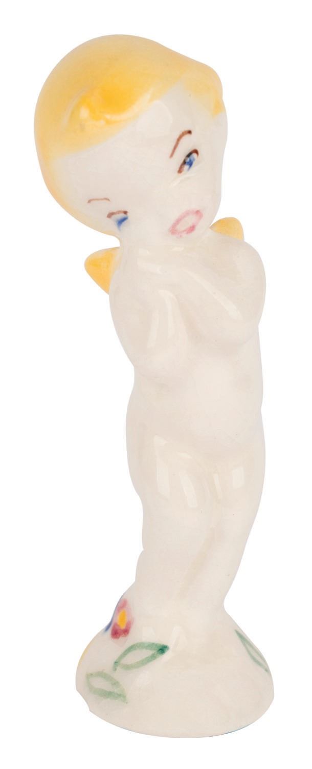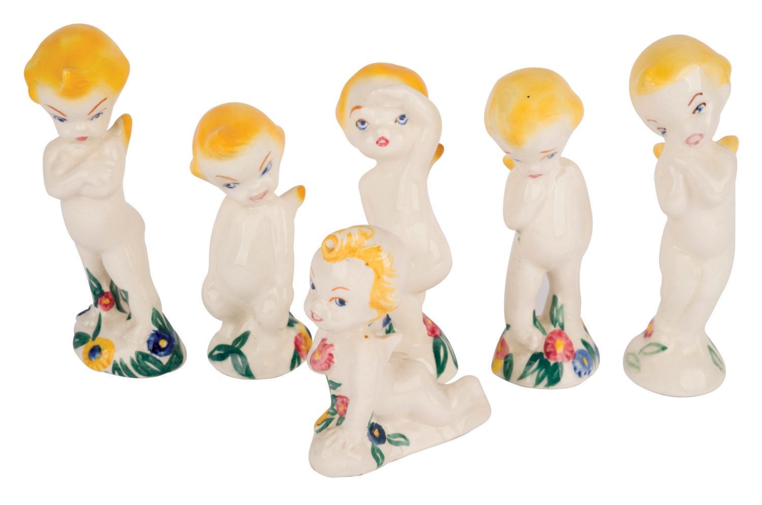 (Vernon Kilns, 1940) A rare collection of (6) painted glazed ceramic Cherub figurines created by Vernon Kilns and based on the Pastoral Symphony sequence of "Fantasia." Measuring between 3.25" and 4.75" tall, the set features the cherubs in various charming poses reminiscent of the film. The collection is in overall very fine condition, with only one figure exhibiting crazing. The shortest kneeling figure appears to be an early production sample, with a unique paint scheme, glazing, and hand notations of "#77H" on the base and "Timothy" inside.