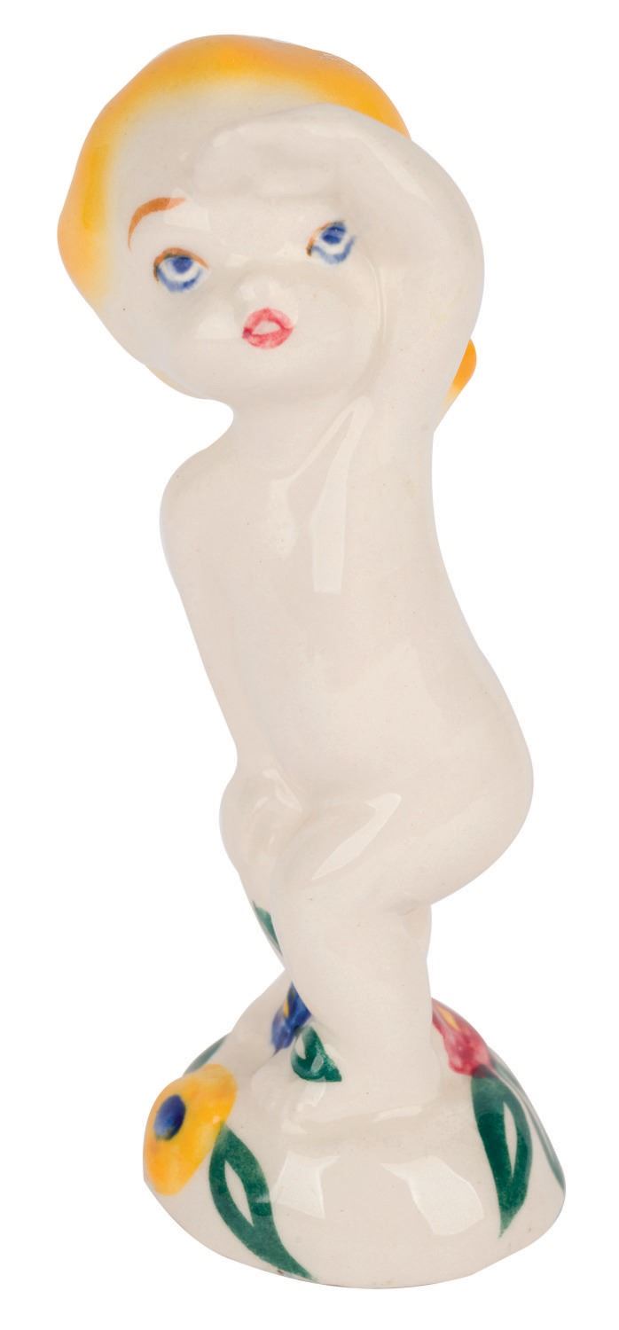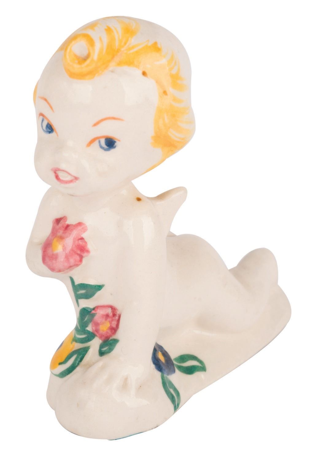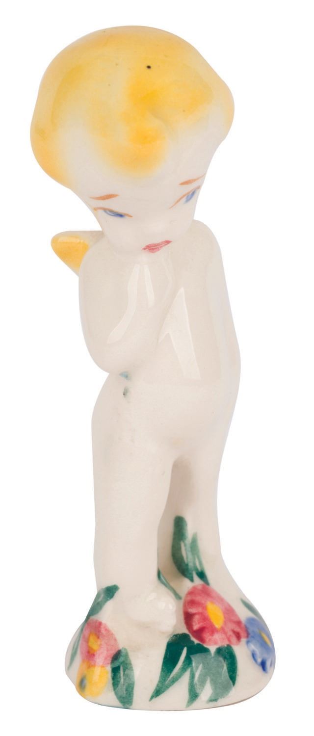 (Vernon Kilns, 1940) A rare collection of (6) painted glazed ceramic Cherub figurines created by Vernon Kilns and based on the Pastoral Symphony sequence of "Fantasia." Measuring between 3.25" and 4.75" tall, the set features the cherubs in various charming poses reminiscent of the film. The collection is in overall very fine condition, with only one figure exhibiting crazing. The shortest kneeling figure appears to be an early production sample, with a unique paint scheme, glazing, and hand notations of "#77H" on the base and "Timothy" inside.