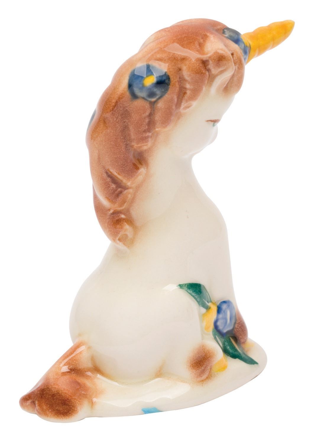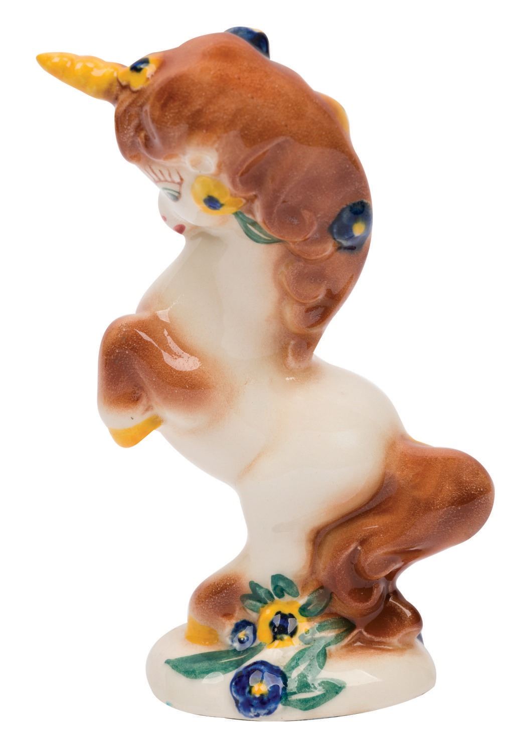 (Vernon Kilns, 1940) A beautiful set of three painted glazed ceramic Unicorns produced by Vernon Kilns in 1940. Based on Disney's "Fantasia," the Unicorns range from 4.5" to 5.5" tall. All three are in fine condition with light wear.