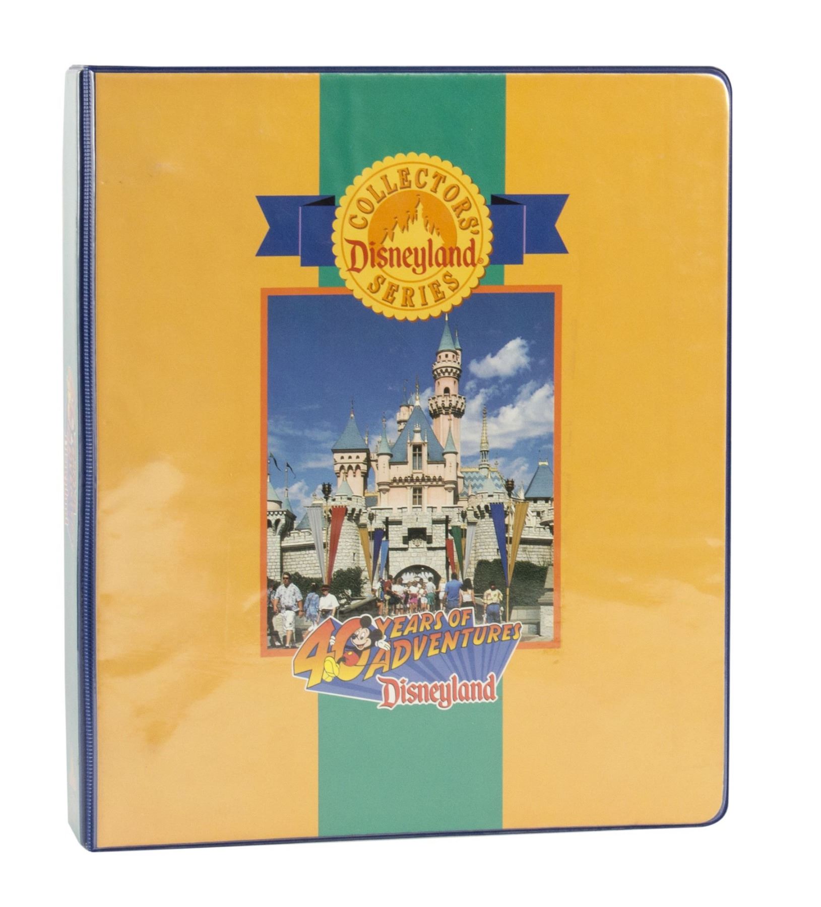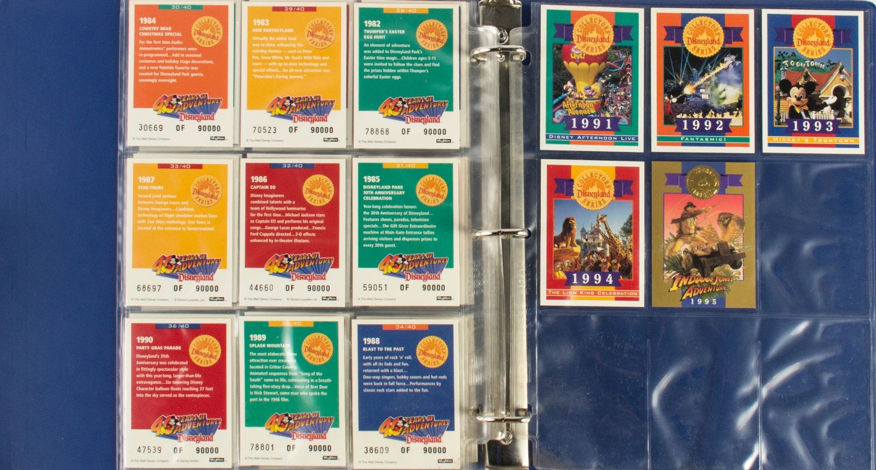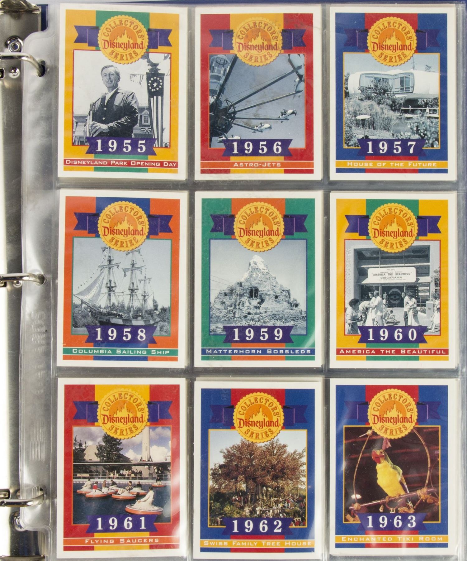 (Disneyland, 1995) A complete set of 41 Disneyland Collector's Series trading cards created to celebrate the park's 40th anniversary and to promote the new "Indiana Jones Adventure" attraction. There is one card for each year that Disneyland has been open, and each card is numbered within an edition of 90,000. This set includes the rare additional gold Indiana Jones card, numbered 175251/210000. This set comes in sleeves within a special Collector's Series binder which measures 11.5"x10" and 2" thick. This set is in very good condition with minimal wear.