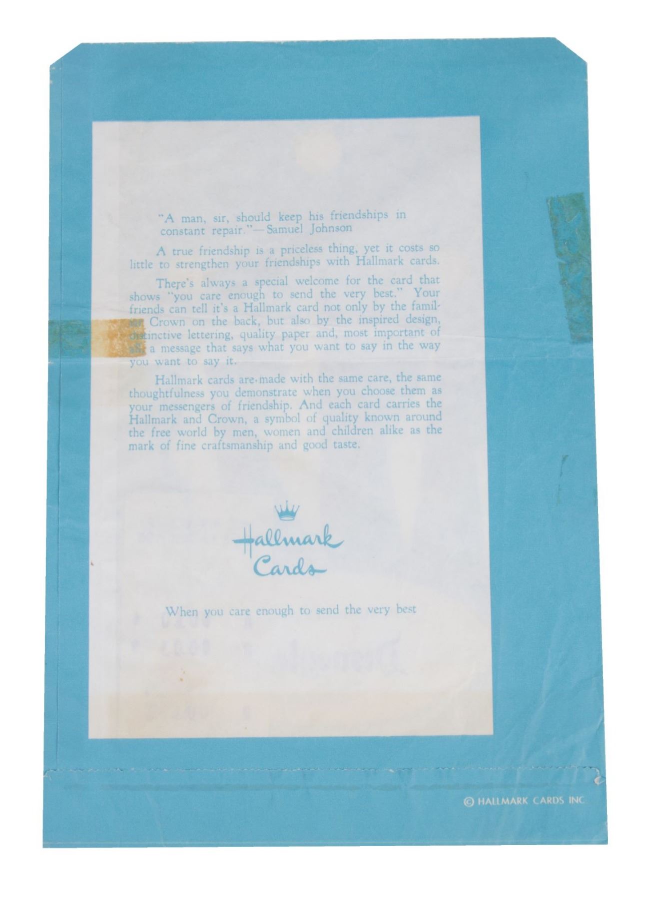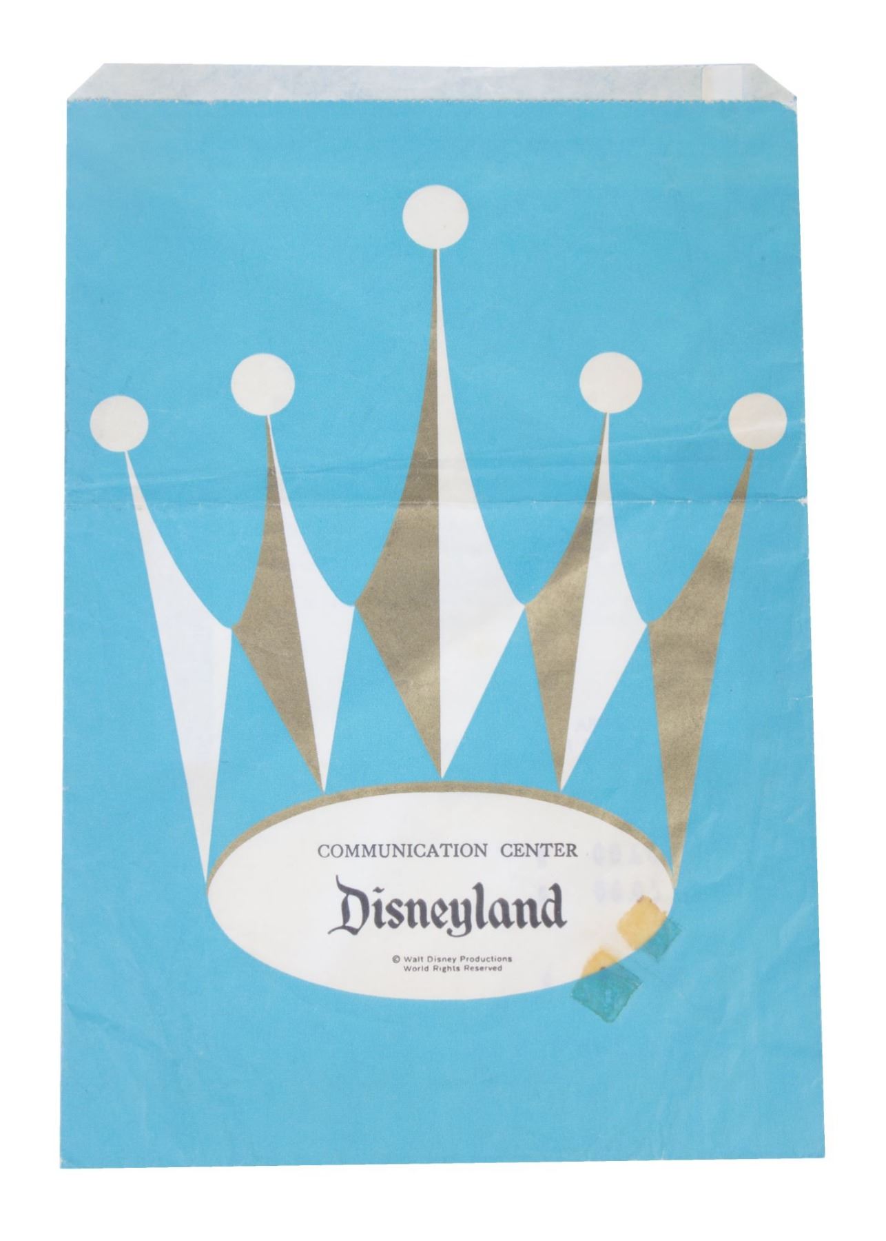 (Disneyland, 1964) A very scarce shopping bag from Disneyland's "Communication Center" on Main Street. The "Communication Center" was sponsored by Hallmark, and this bag features Hallmark's familiar crown logo and the title "Communication Center - Disneyland". The bag includes the original sales receipt which dates the bag to Aug 12, 1964. Measuring 10.25"x7", the bag is in good condition with some horizontal creasing and a few spots of tape discoloration.