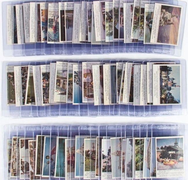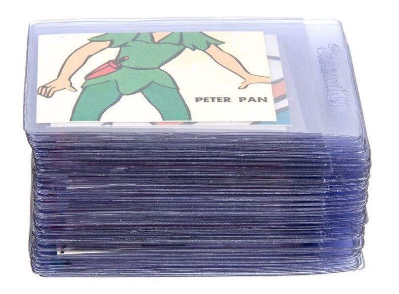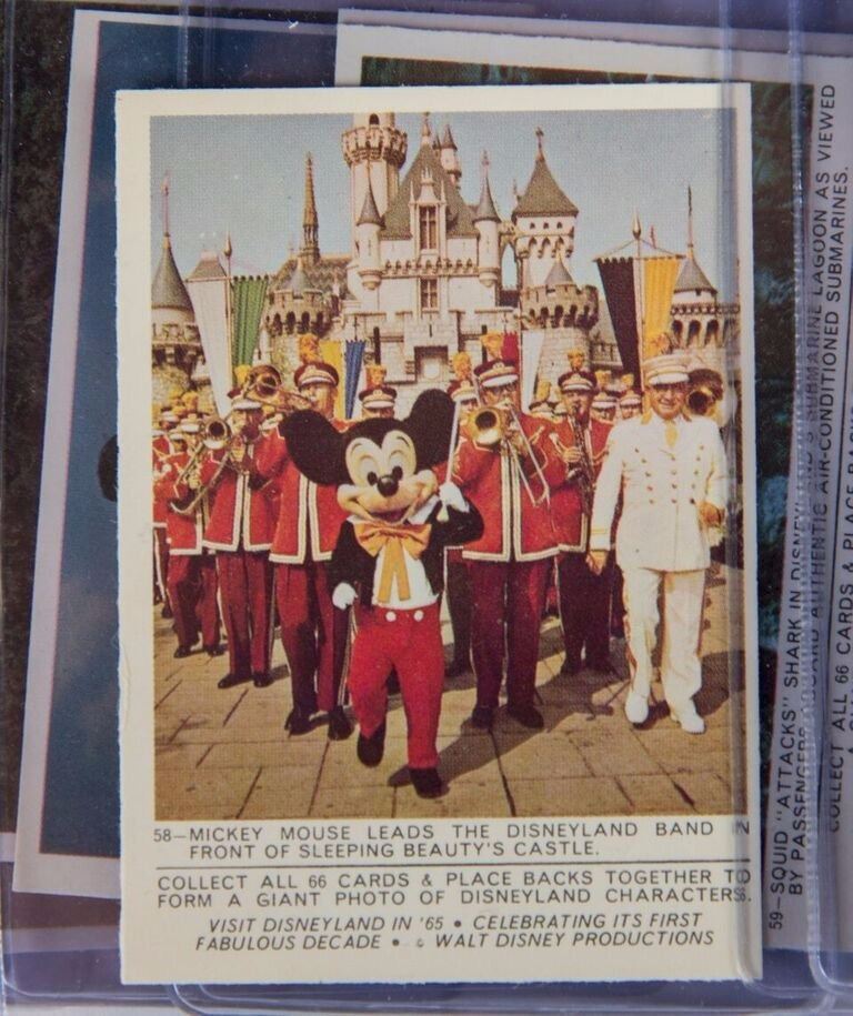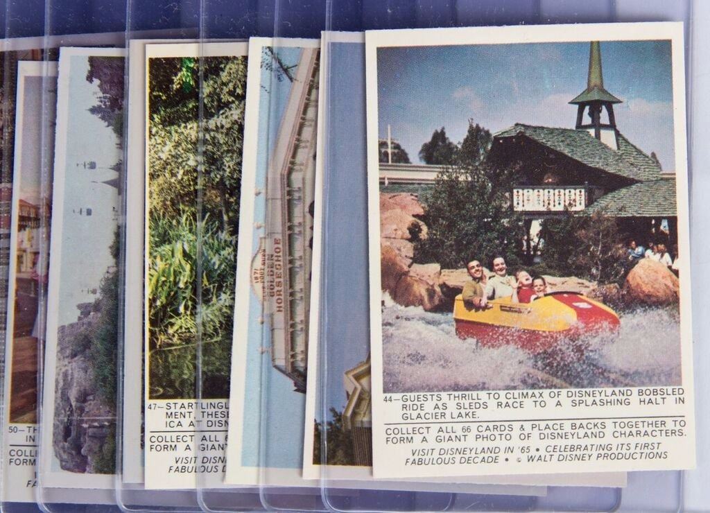 (Disneyland, 1965) A complete set of (66) Donruss Disneyland trading cards. When placed together, the backs of the cards form a giant photo featuring Disneyland characters. Each card comes in a protective hard-plastic sleeve. The cards measure 2.5"x3.5" each and the set is in very good condition.