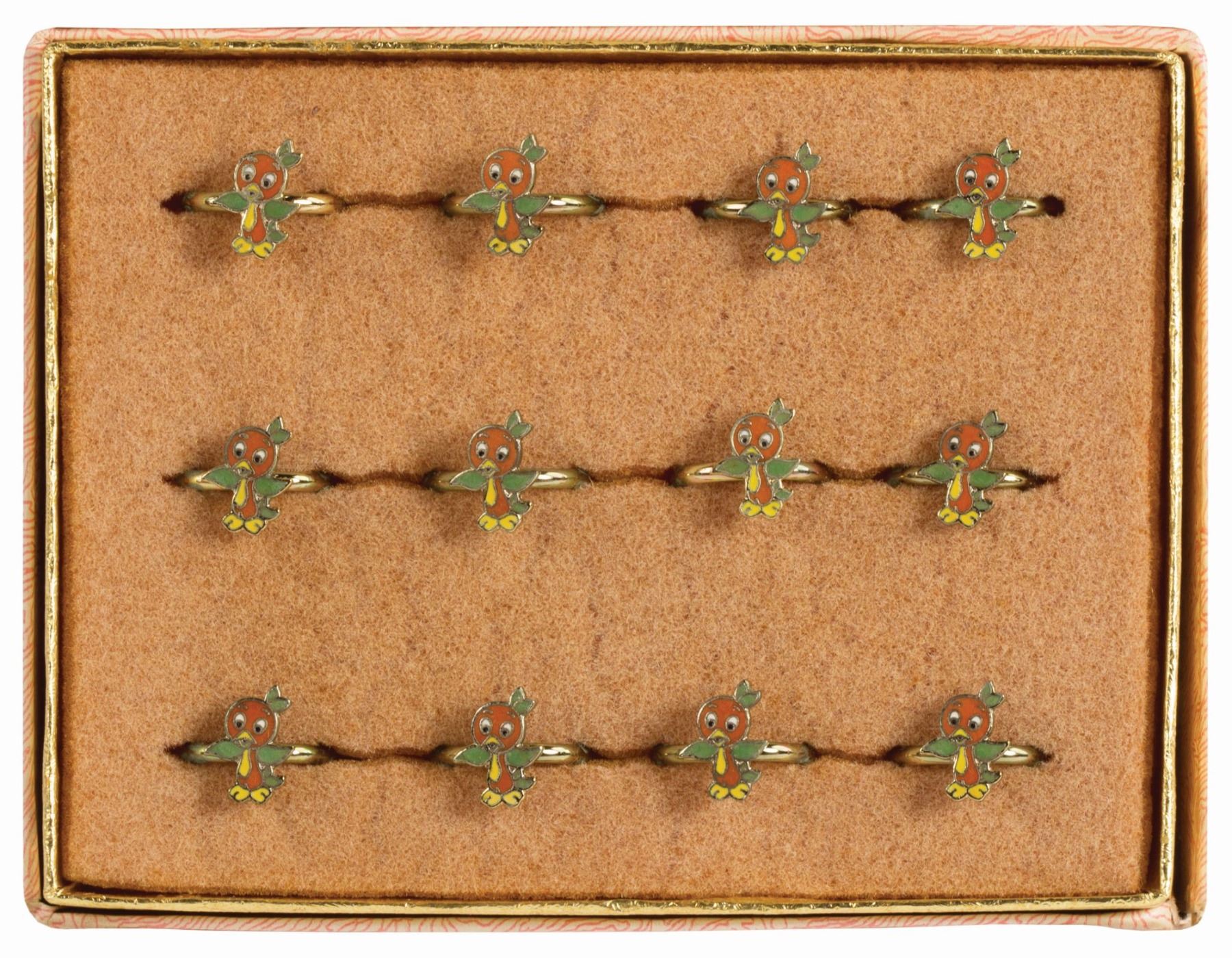 (Walt Disney World, c.1970s) A complete Orange Bird themed store display that includes (12) adjustable rings. These jewelry items beautifully capture this beloved mascot, and measure 0.6" in diameter. The condition is very good with minor wear to the display frame.