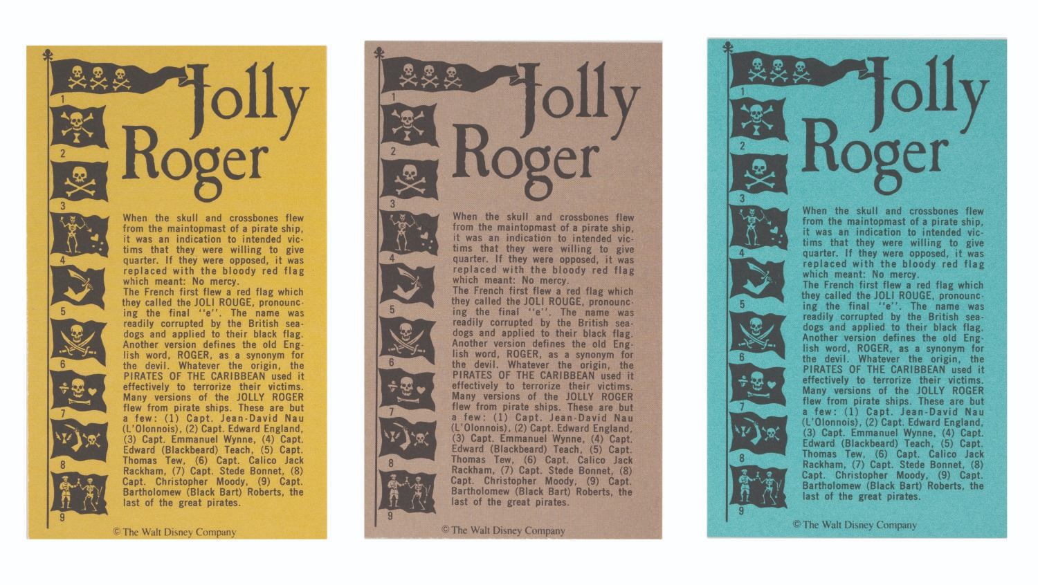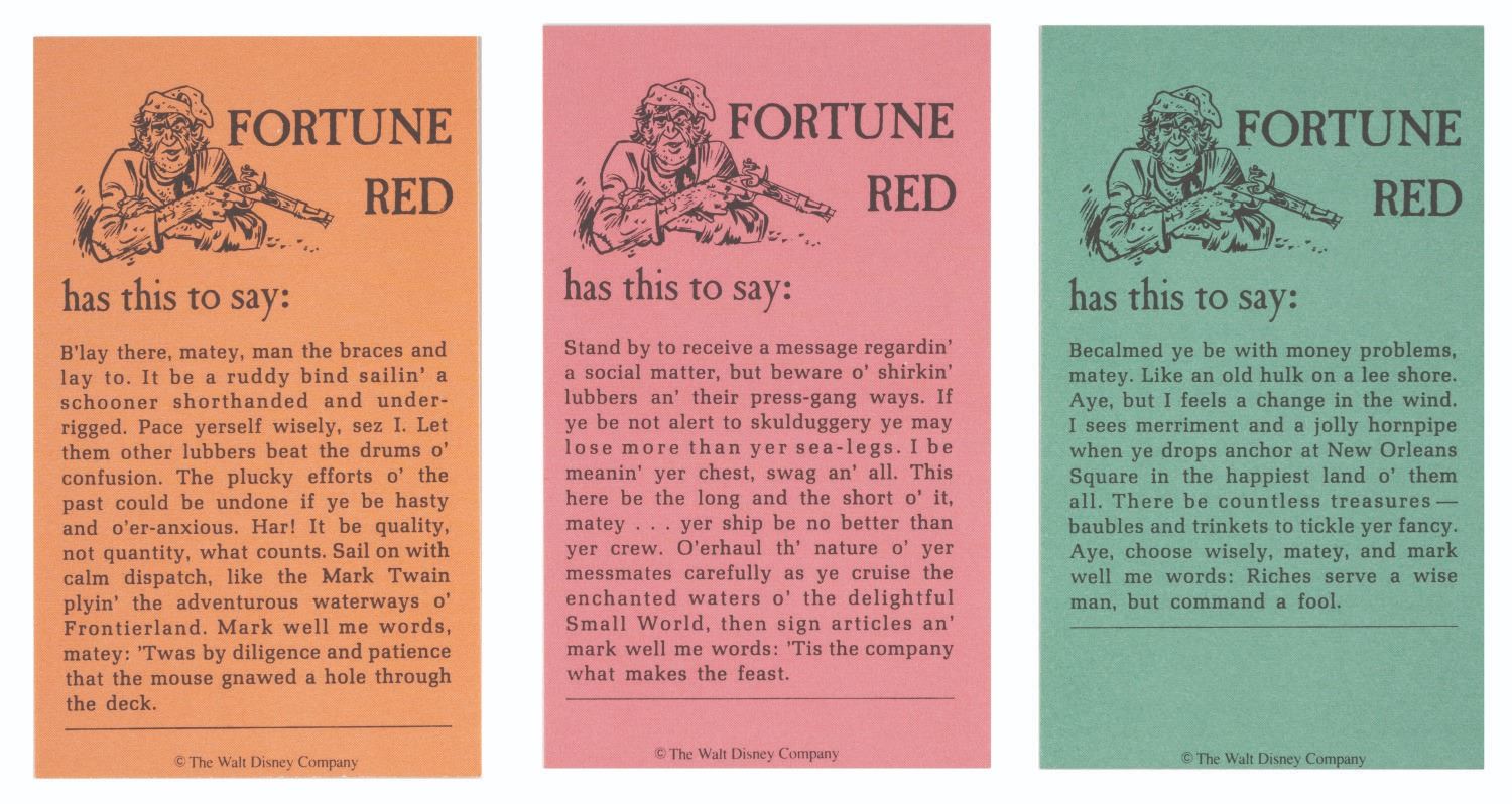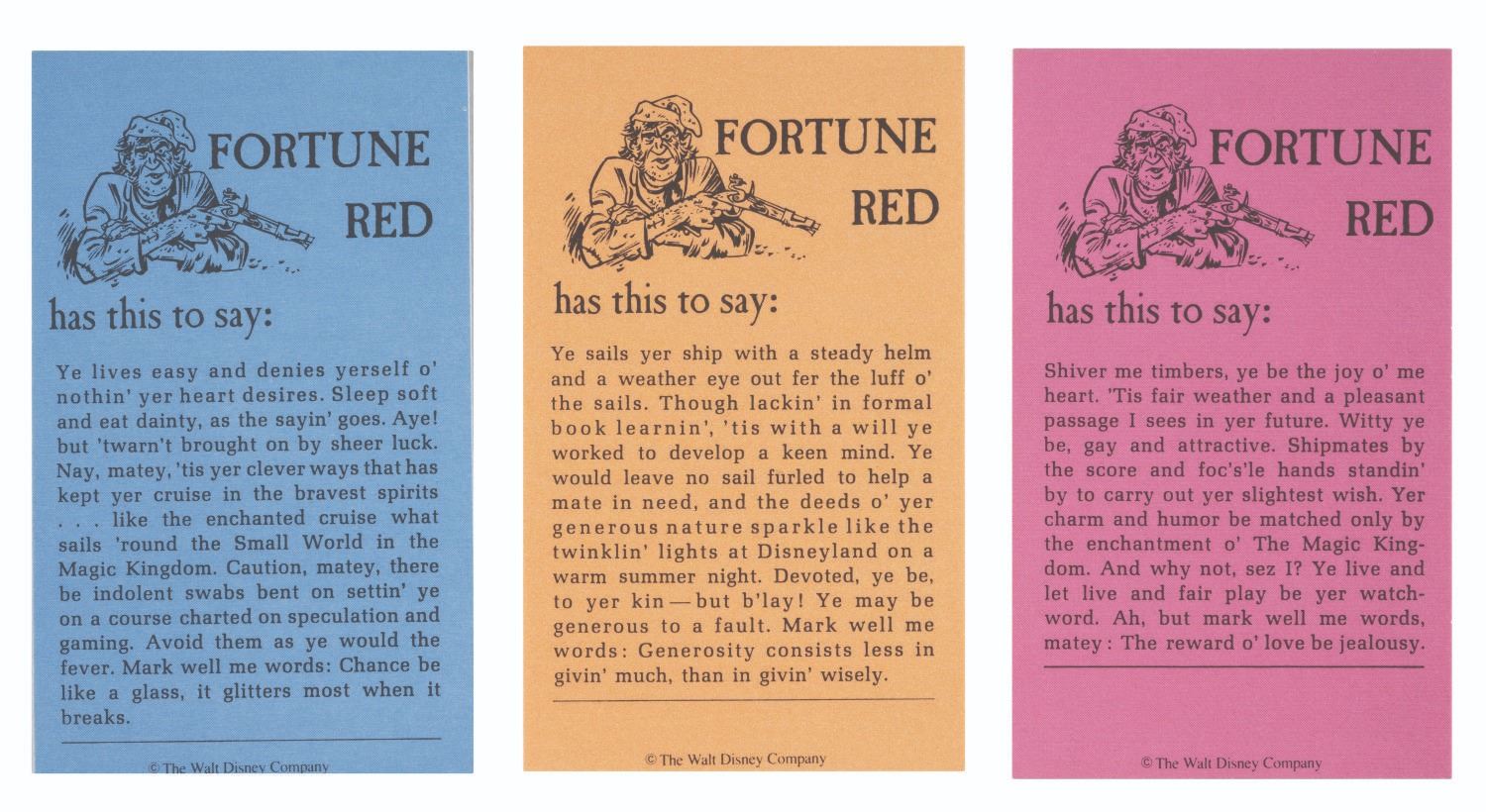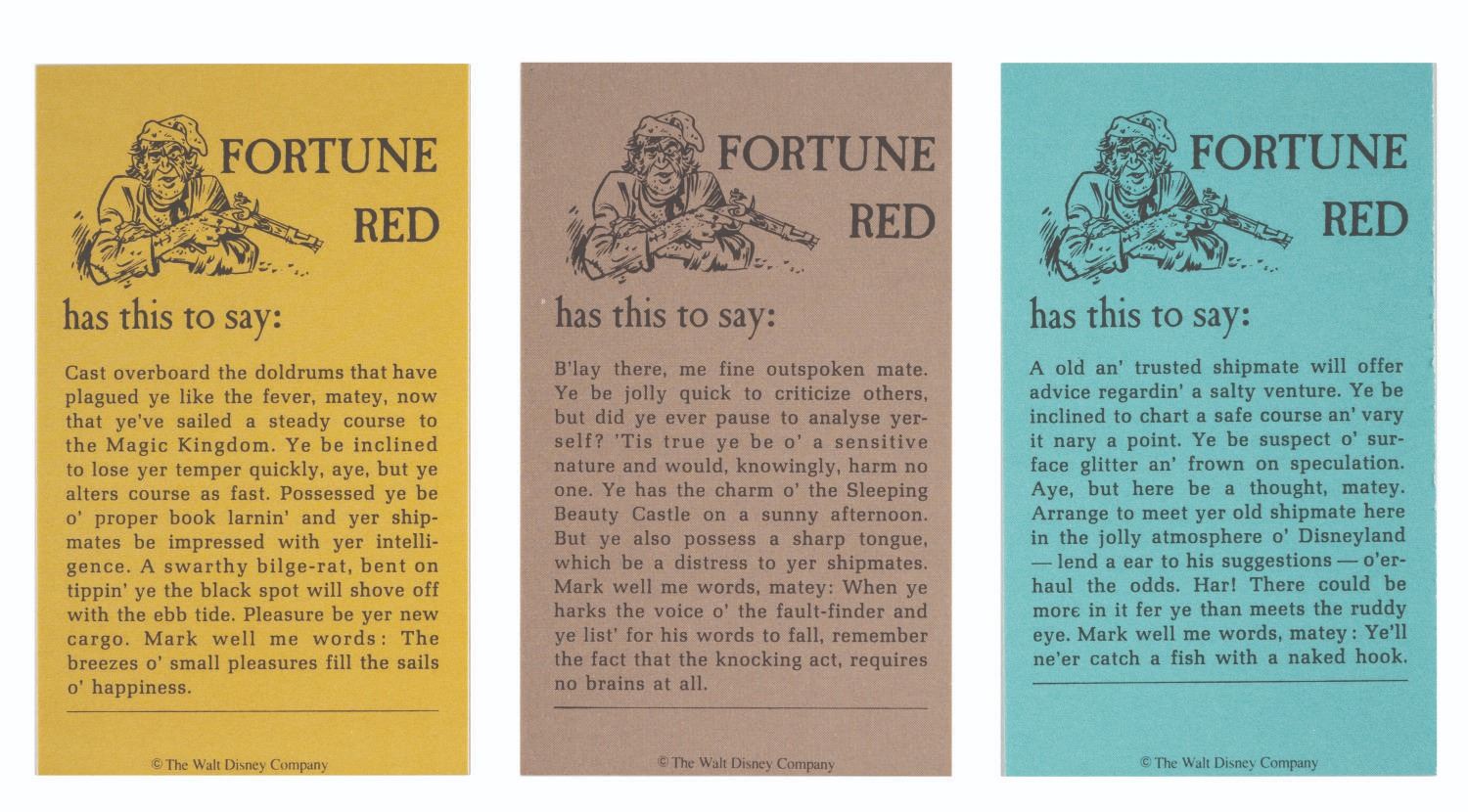 (Disneyland, 1990s) A complete set of cards from the "Fortune Red" machine located near "Pirates of the Caribbean" at Disneyland. In recent years, the cards were no longer printed on different colors of paper. This complete set of (24) colorful vintage souvenir cards has a unique fortune written in pirate speech, and includes (1) additional repeat card for a total of 25. Each card measures 4.25"x2.5" and is in very good condition with minor edge wear.