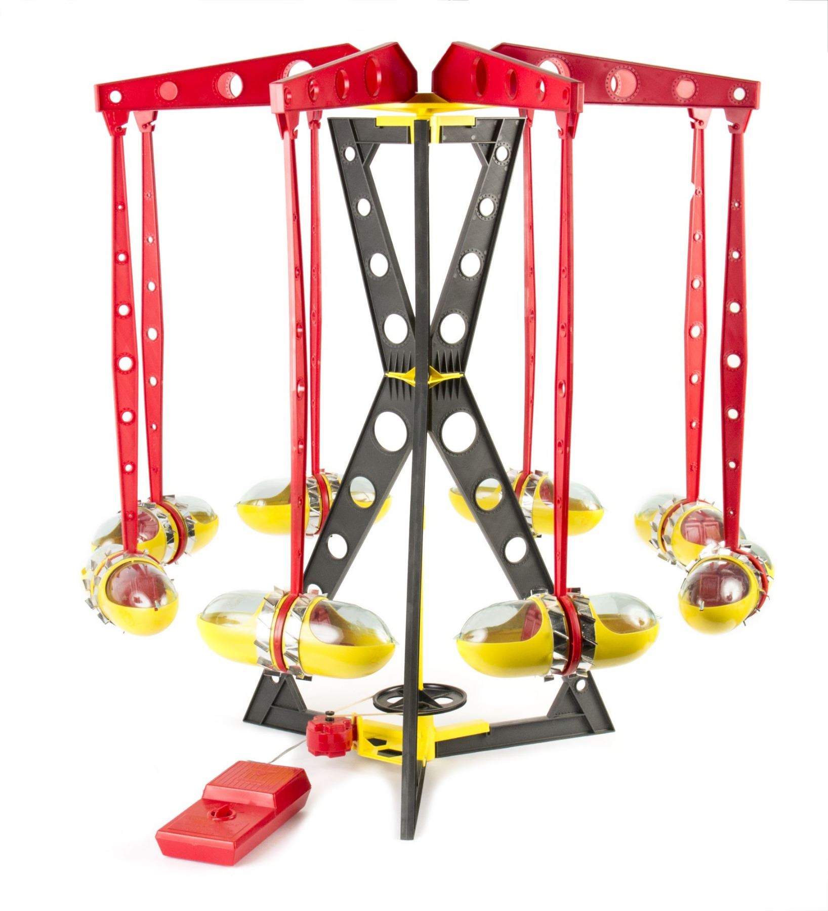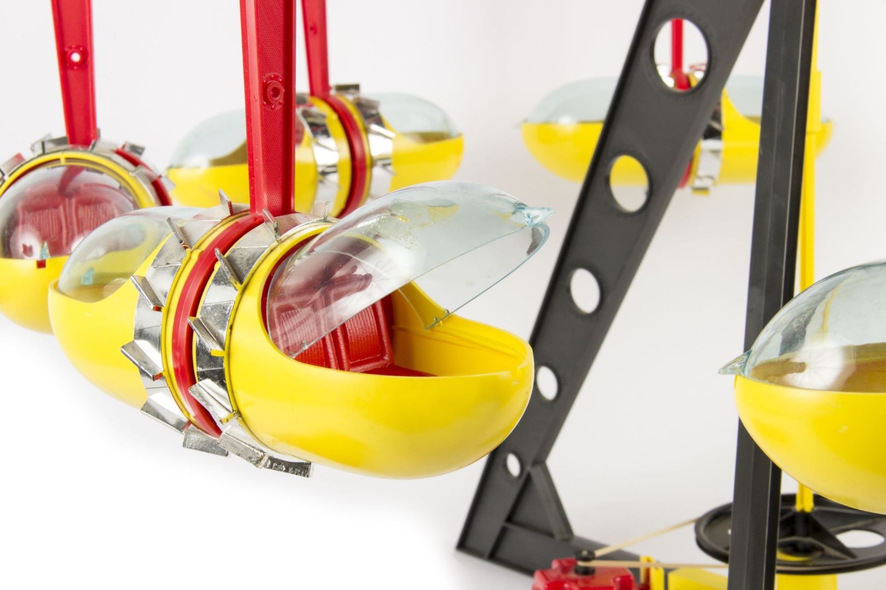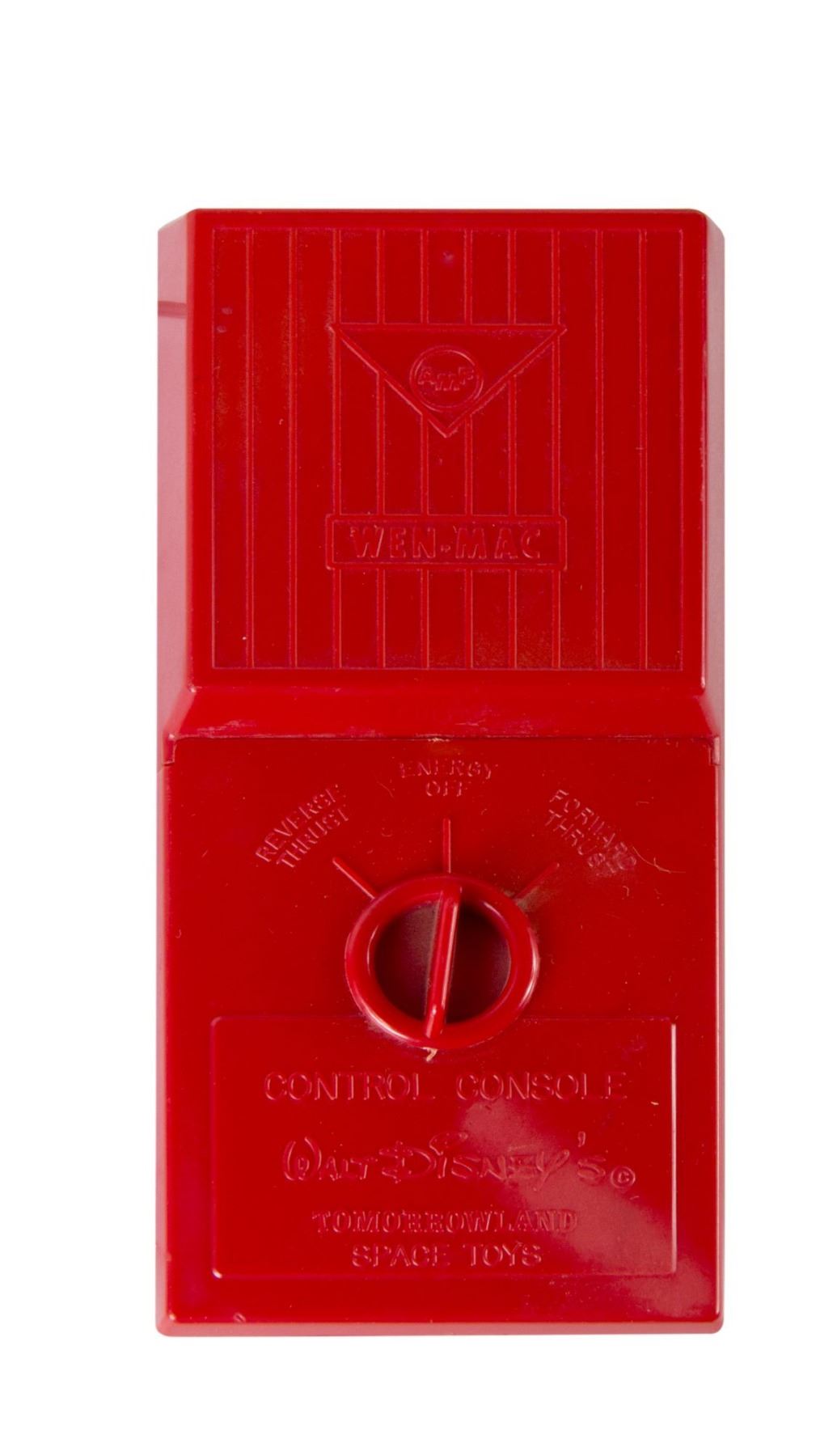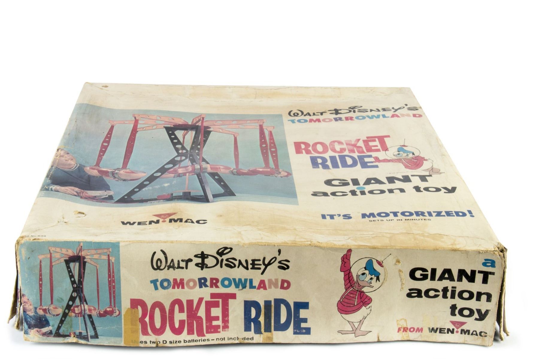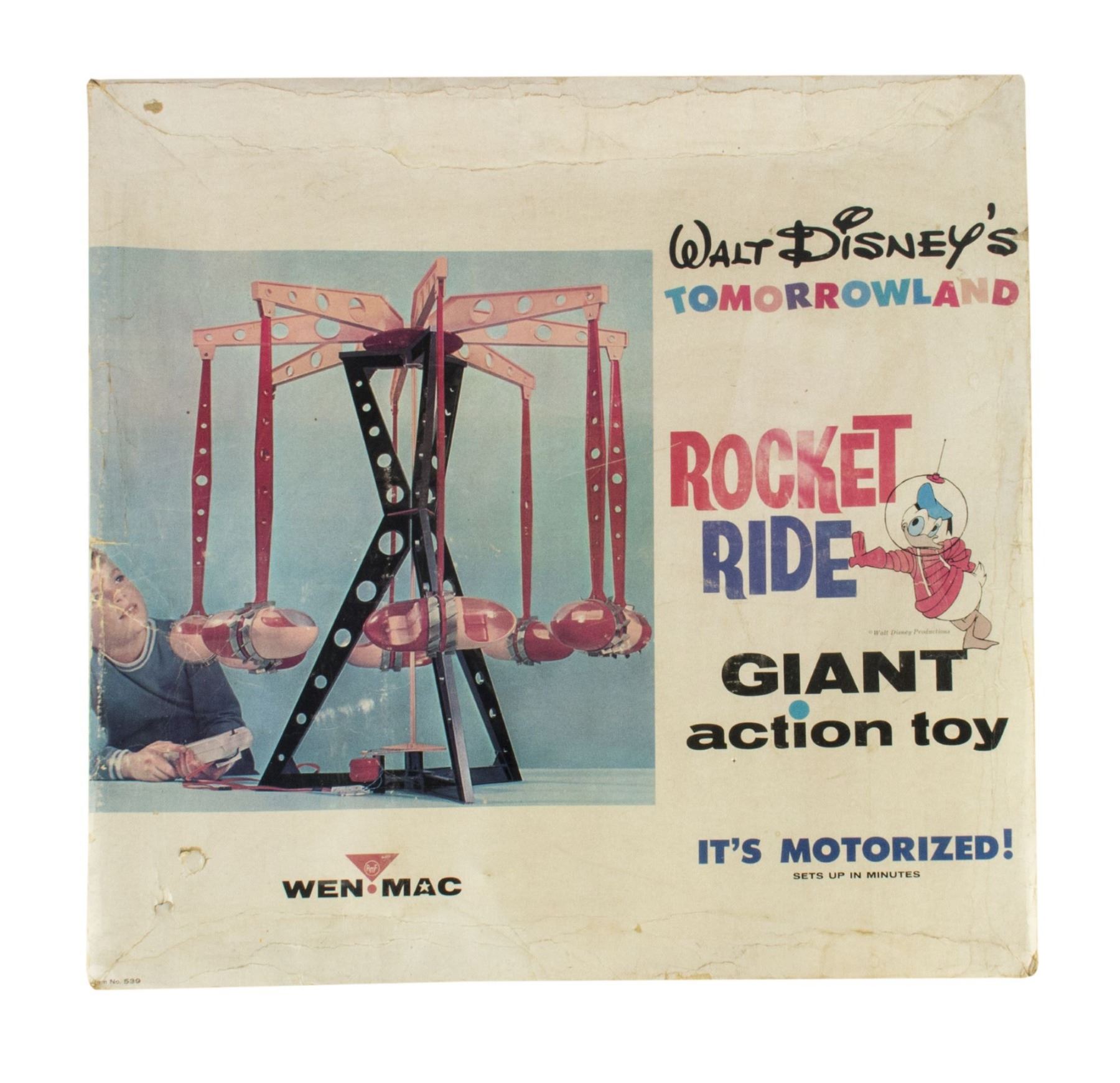 (Disneyland, c.1955) A very scarce early Disneyland toy, this "Rocket Ride" giant action toy is loosely based around Tomorrowland's "Astro Jets" attraction which would open in 1956. This large motorized toy is an impressive setup with great color and vintage look. This item is complete in its original box, including all parts as well as the original instruction manual. This item measures approximately 25" tall when assembled and is in very good condition with some wear to the box and instructions. Battery functionality has not been tested but appears to be in good working order.