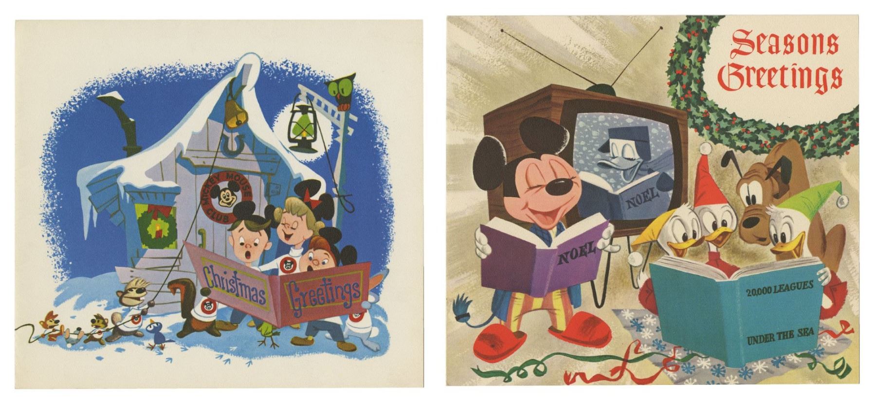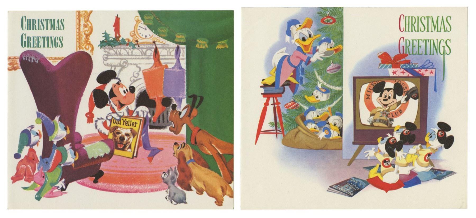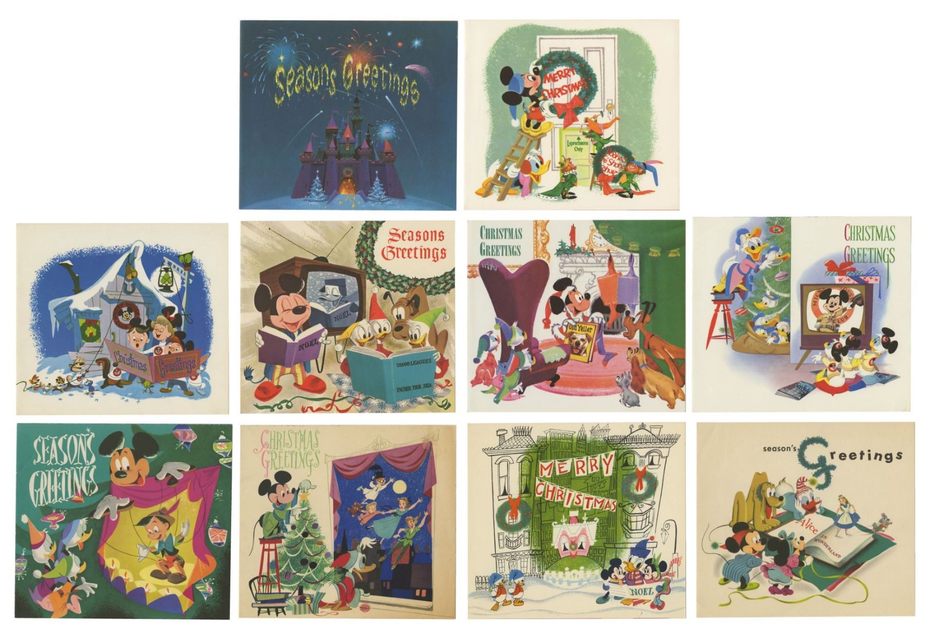 (Walt Disney Studios, 1950s) A complete set of all (10) Walt Disney Studios Christmas cards issued in the 1950s. The cards feature a wide variety of classic Disney characters such as Mickey and Donald, and also promote the newly opened Disneyland Park. The cards range in size but measure approximately 7"x8" each. The condition is very good with minor wear. Included with the cards are two original Walt Disney Christmas Card mailing envelopes.