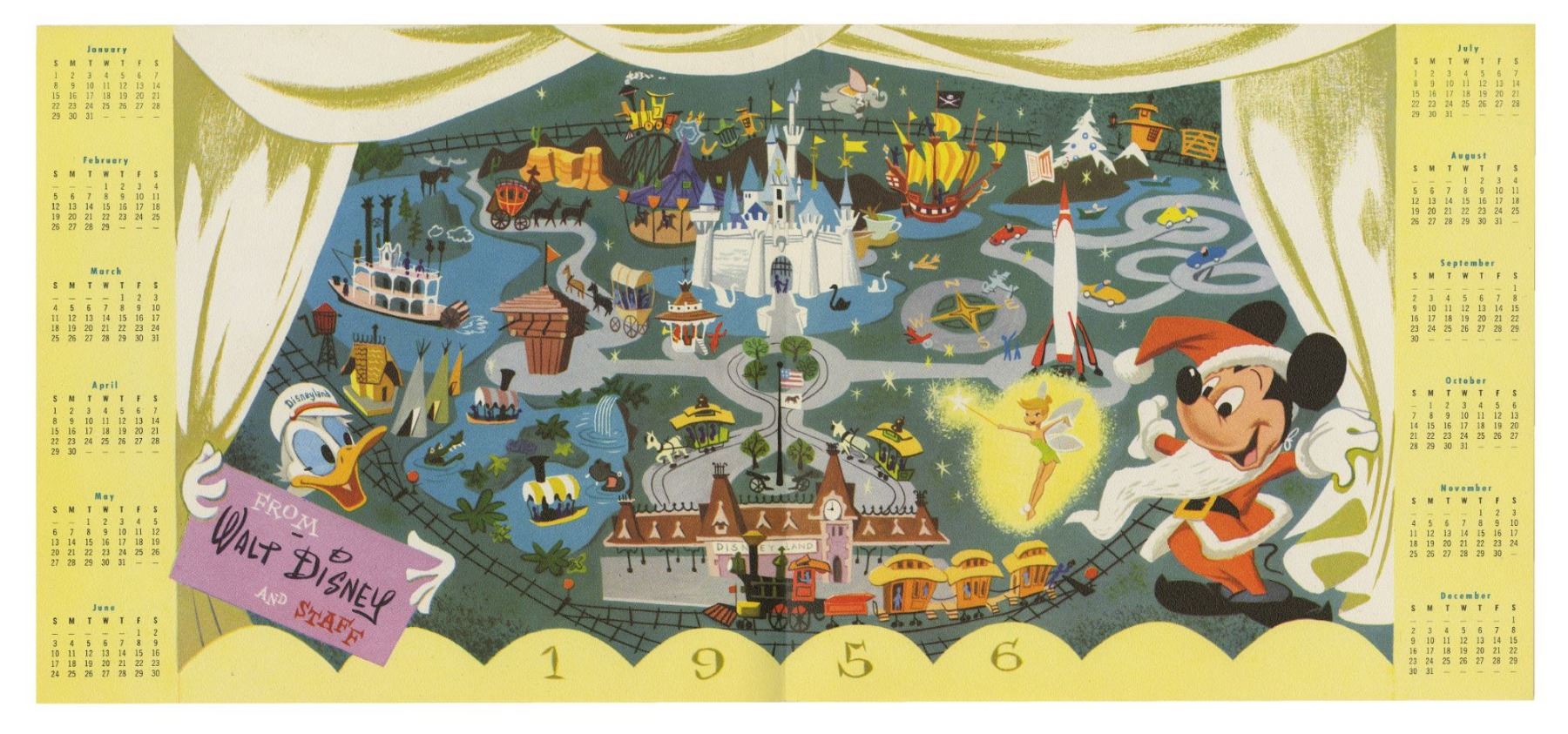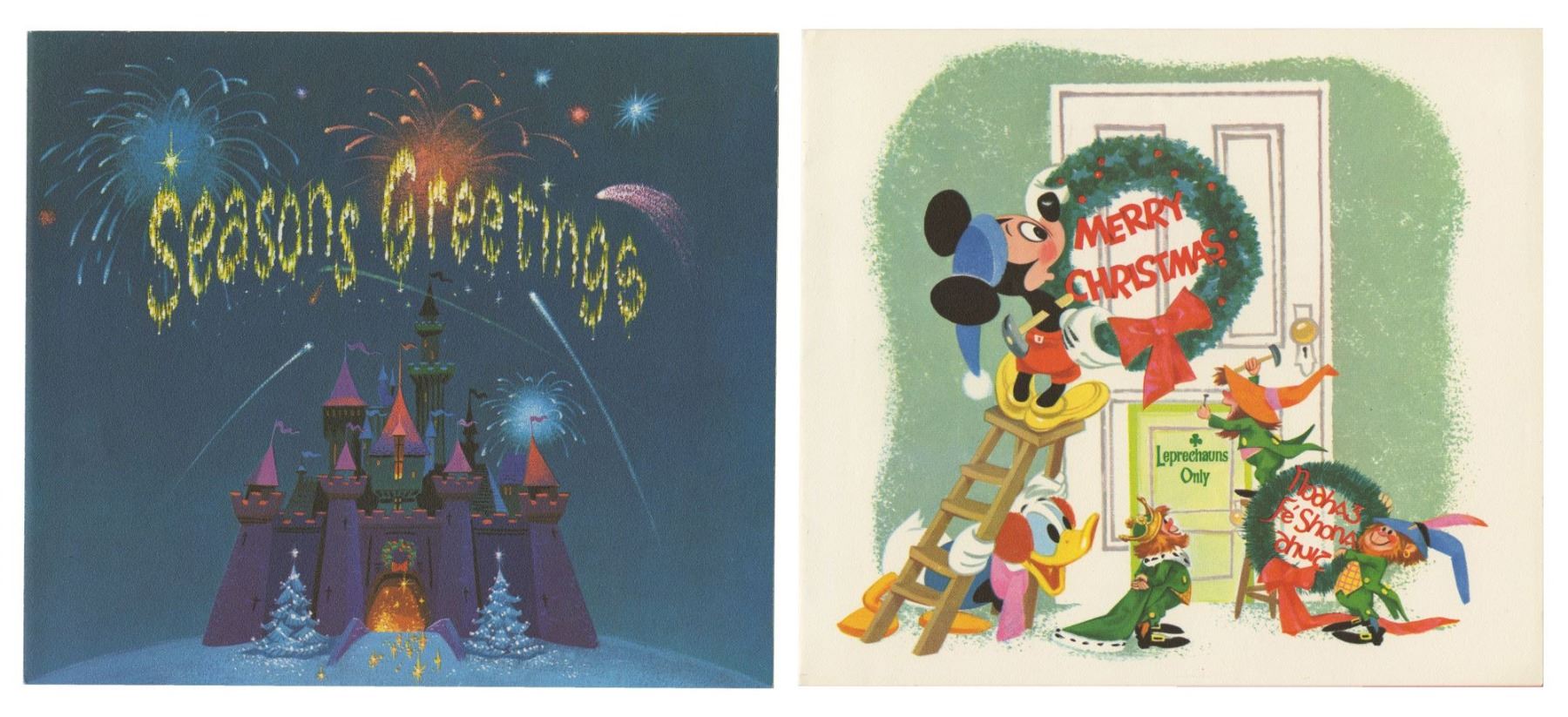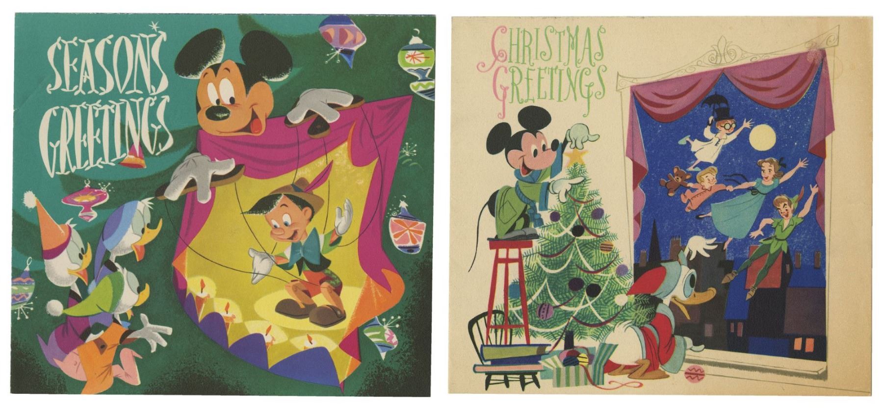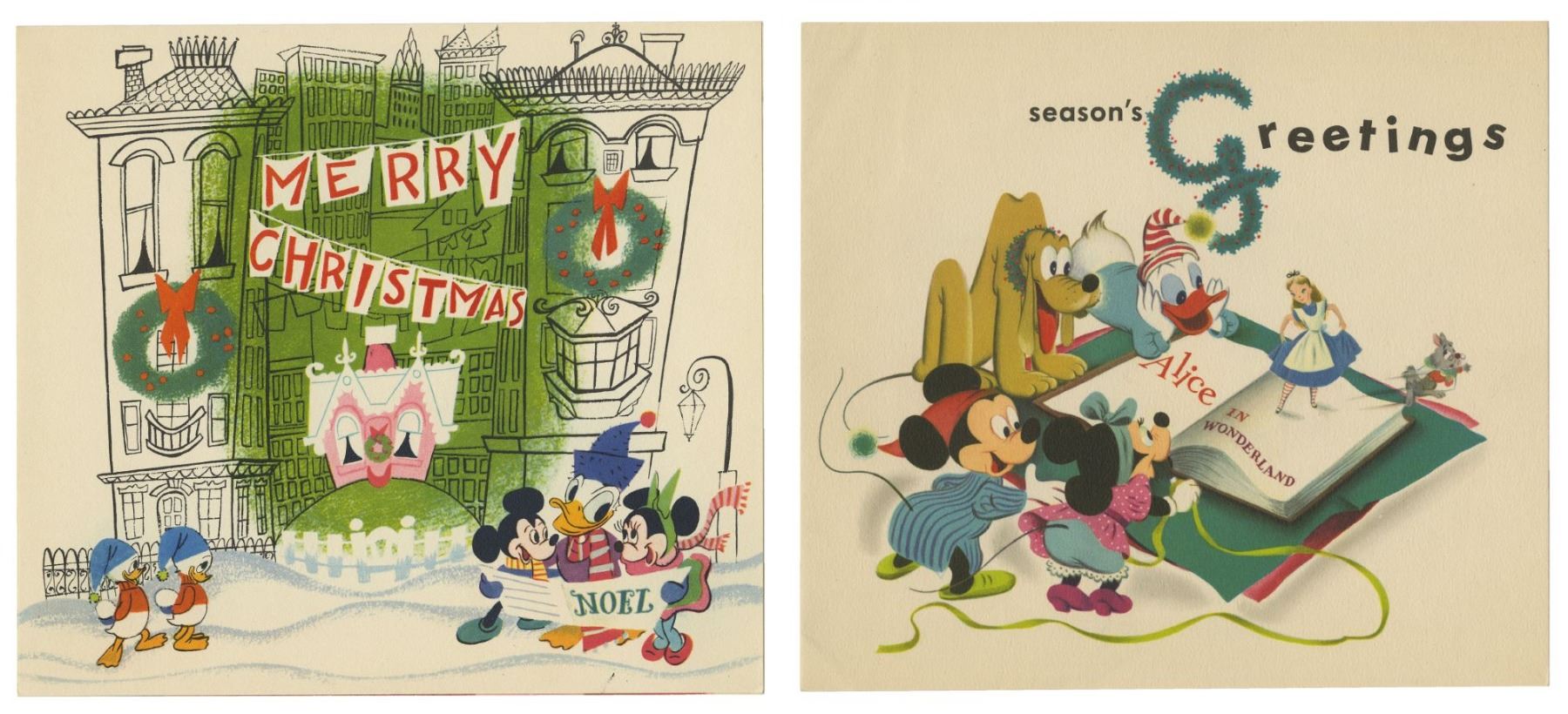 (Walt Disney Studios, 1950s) A complete set of all (10) Walt Disney Studios Christmas cards issued in the 1950s. The cards feature a wide variety of classic Disney characters such as Mickey and Donald, and also promote the newly opened Disneyland Park. The cards range in size but measure approximately 7"x8" each. The condition is very good with minor wear. Included with the cards are two original Walt Disney Christmas Card mailing envelopes.