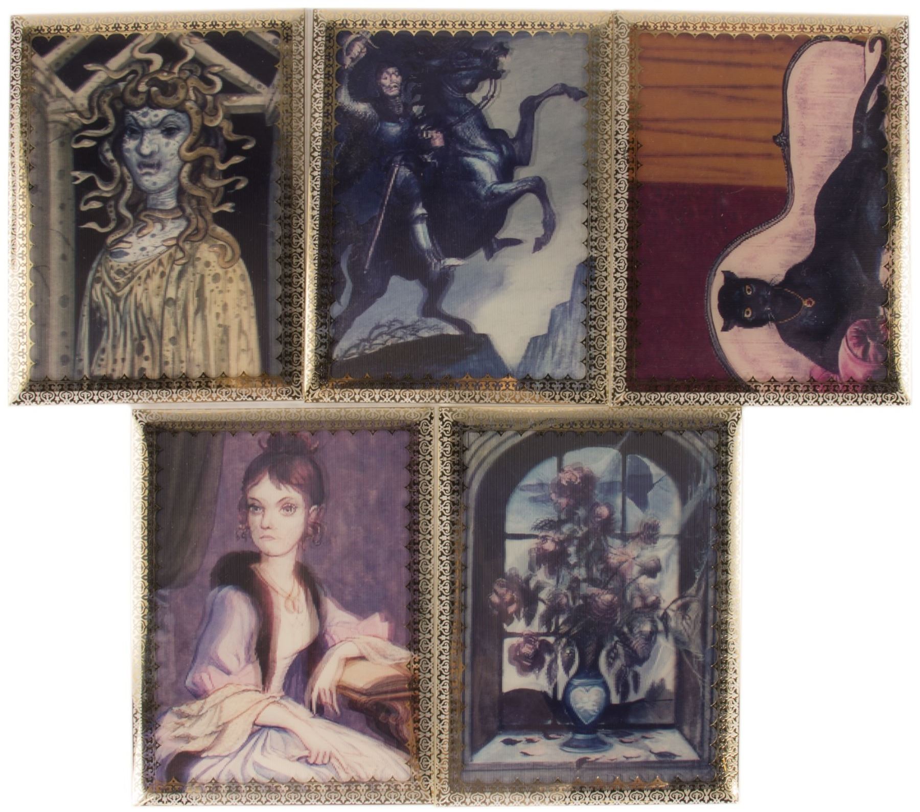 (Disneyland, 1999) A collection of (5) lenticular cards featuring changing imagery inspired by the Haunted Mansion's portrait corridor. These cards are a complete set of the five lenticular images that were created specifically for the 30th anniversary of the Haunted Mansion. Each card measures just under 5.5"x4.25". The set is in overall very fine condition with minor surface wear to the protective sleeves.