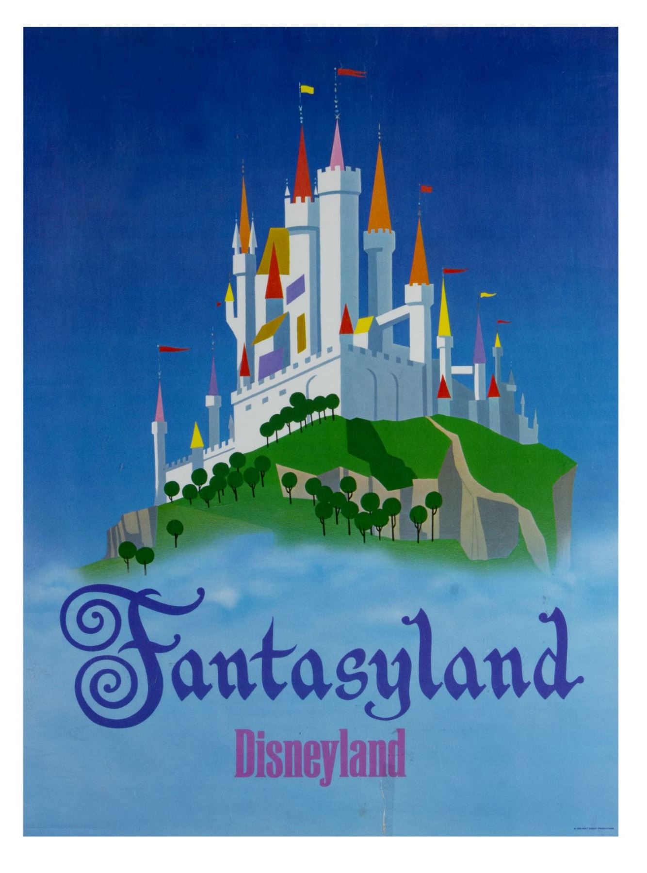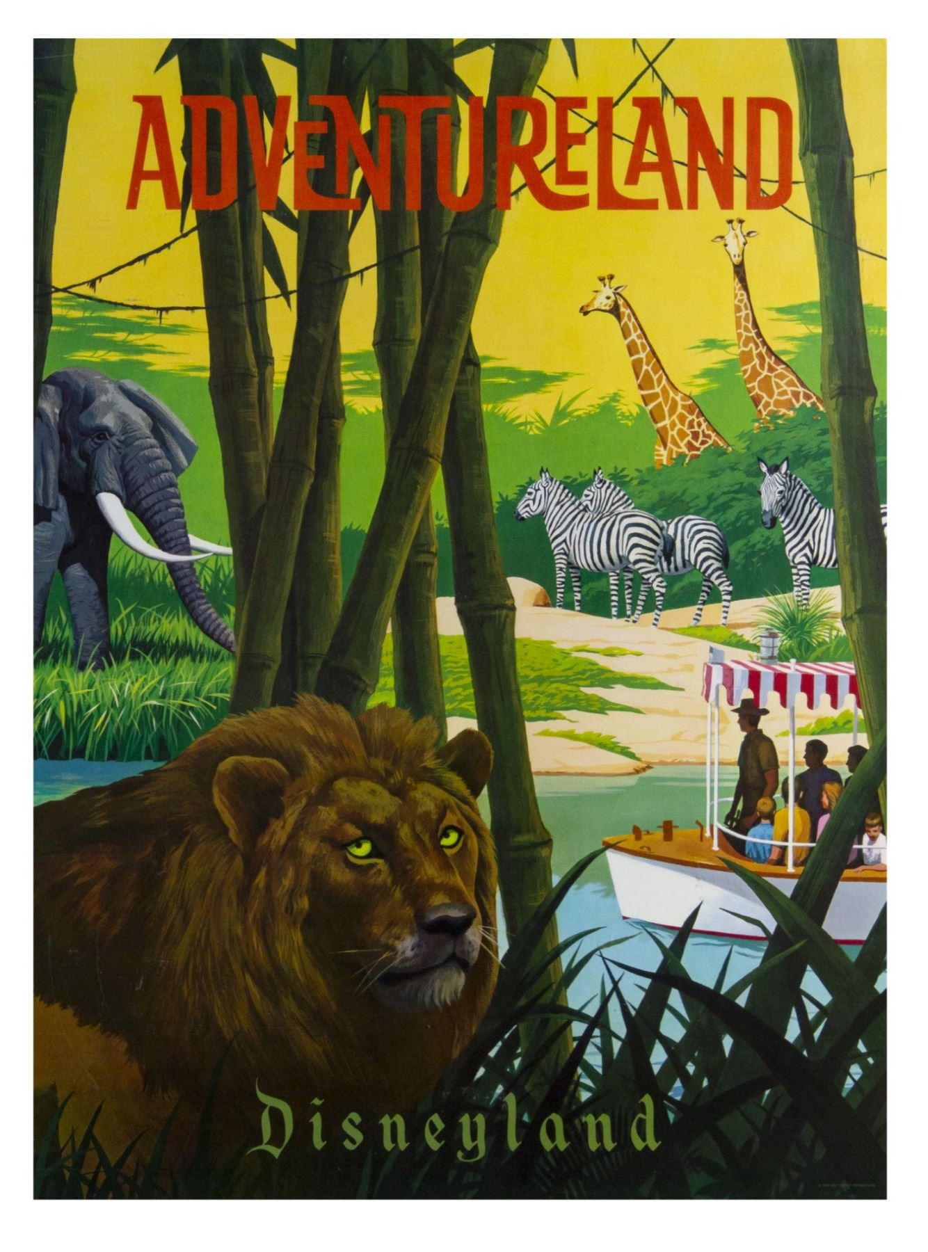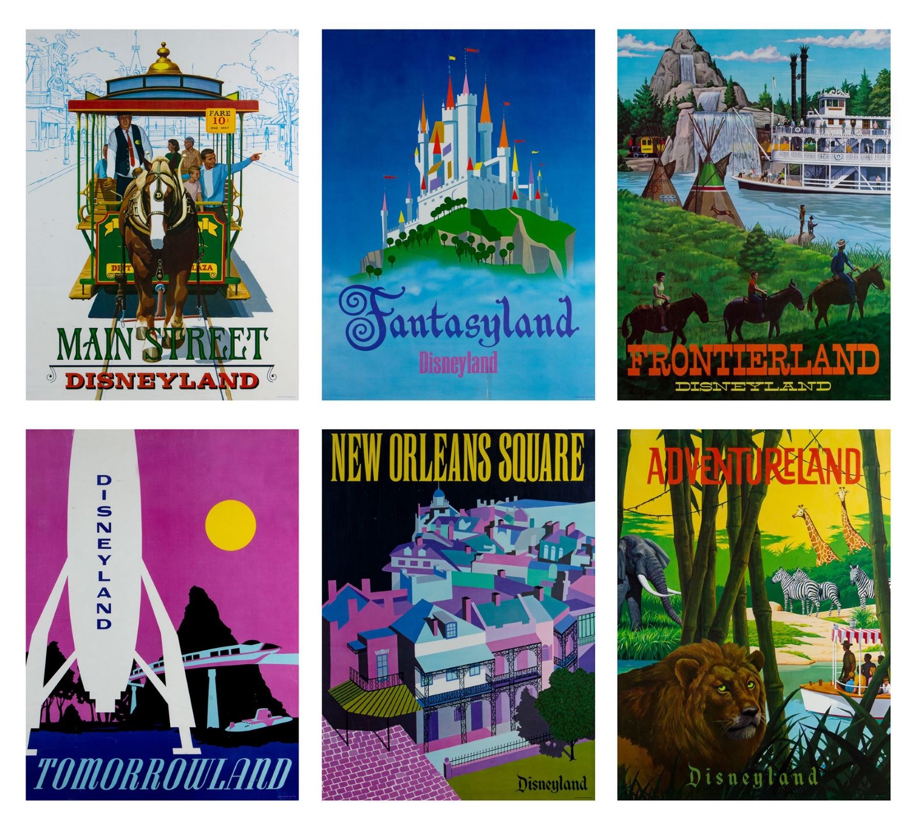 (Disneyland, 1966) A very scarce complete set of (6) "near-attraction" posters from the Summer of 1966. These beautiful printed posters were actually displayed in the park as attraction posters but also sold individually at the Main Street Emporium. The posters were only available that Summer and as such, are very hard to come by, with a complete set such as this being exceptionally rare. The posters measure 30"x22" each, and are in good condition with varying amount of wear including some minor creases, some scuffs from use, and a thin tear along the bottom-edge of the Fantasyland poster that was once repaired with tape on the back side.
