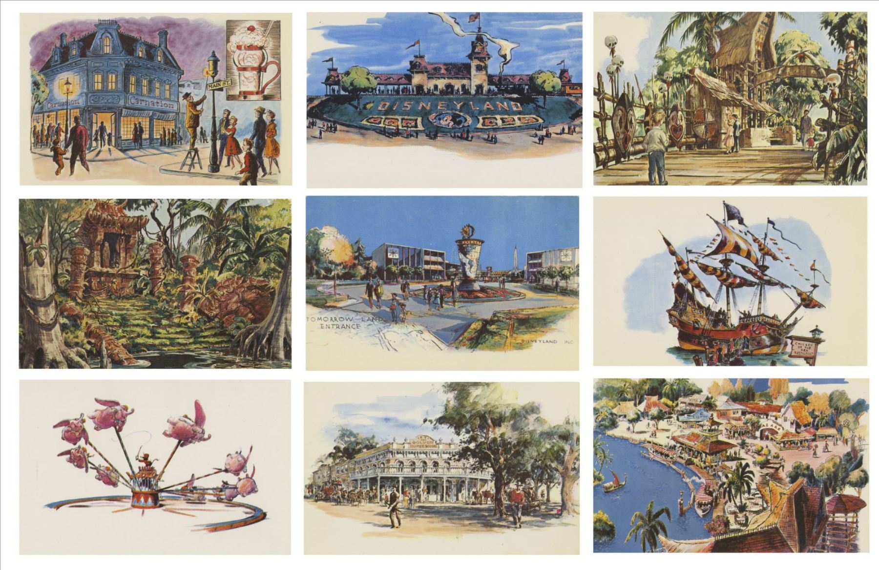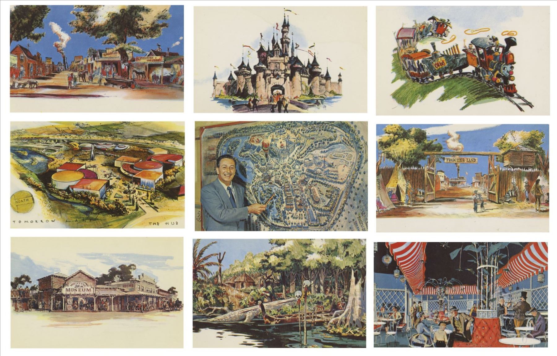 (Disneyland, 1955) A very rare complete set of 23 vintage Disneyland postcards. These cards are numbers 0001 to 0023 in the popular "The Nickel Tour" Disneyland postcard collecting books and are the first cards produced for the park. These are the iconic concept art postcards which feature some of the actual designs used in the creation of Disneyland. The cards measure 3.5"x5.5" and are in very good condition with minor wear. Cards 0001 and 0002 have been mailed.
