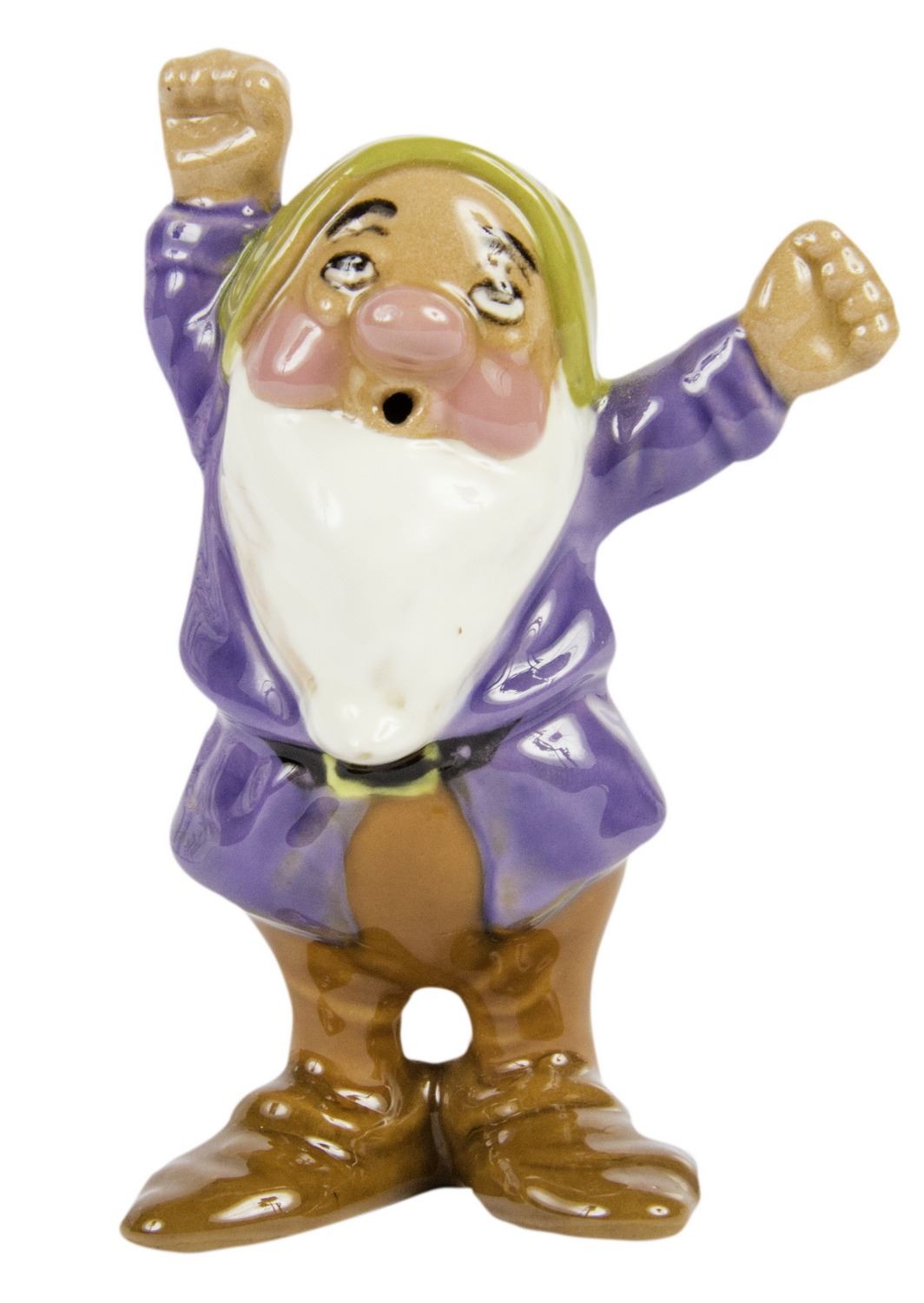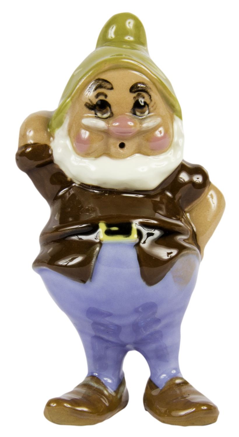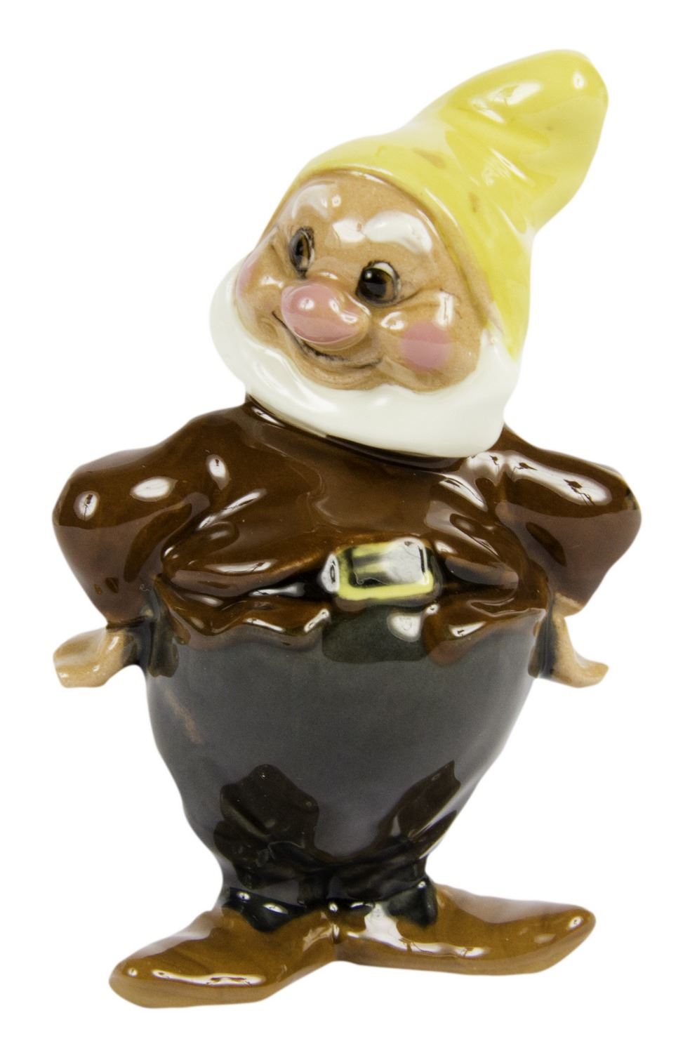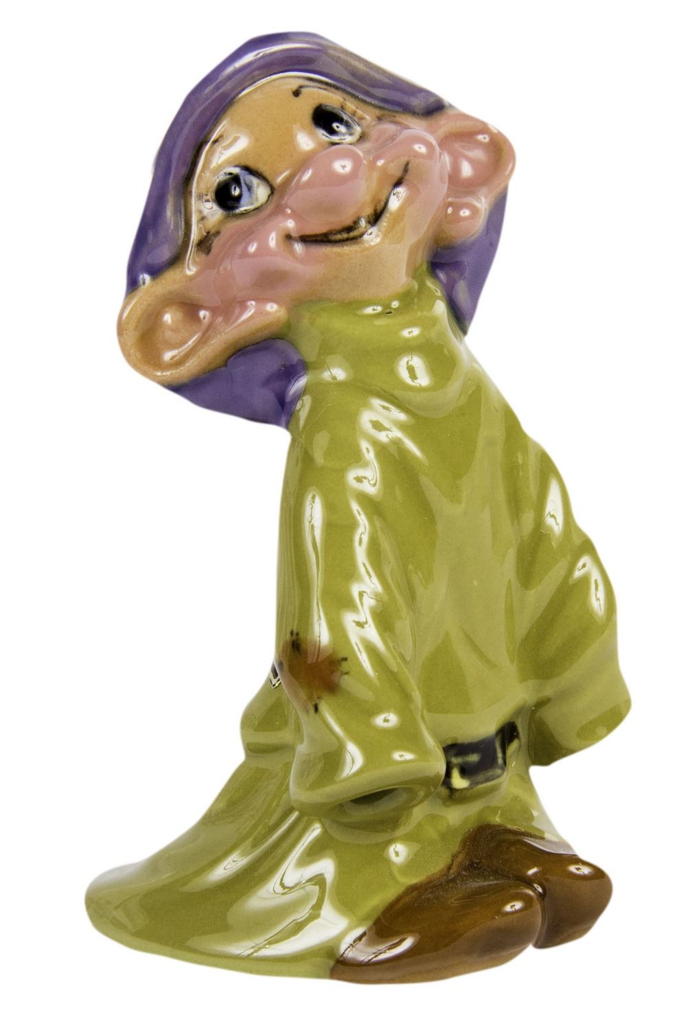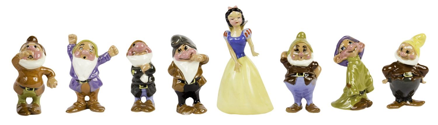 (Disneyland, 1955) An extremely rare complete set of (8) hand-crafted ceramic figures by Hagen-Renaker. Hagen-Renaker supplied Disneyland with some of the earliest ceramic souvenirs when it opened in 1955, and their items were often praised by Walt Disney for their quality and likeness to his characters. This set features Snow White and all seven Dwarfs, with each retaining their original foil Hagen-Renaker label on the back with the character names listed. Hagen-Renaker created sets in two sizes, with this being the complete larger set, which is extremely difficult to come by. Snow White measures approximately 6" tall while the Dwarfs measure approximately 3.25" tall. This set is in very good condition with little wear.