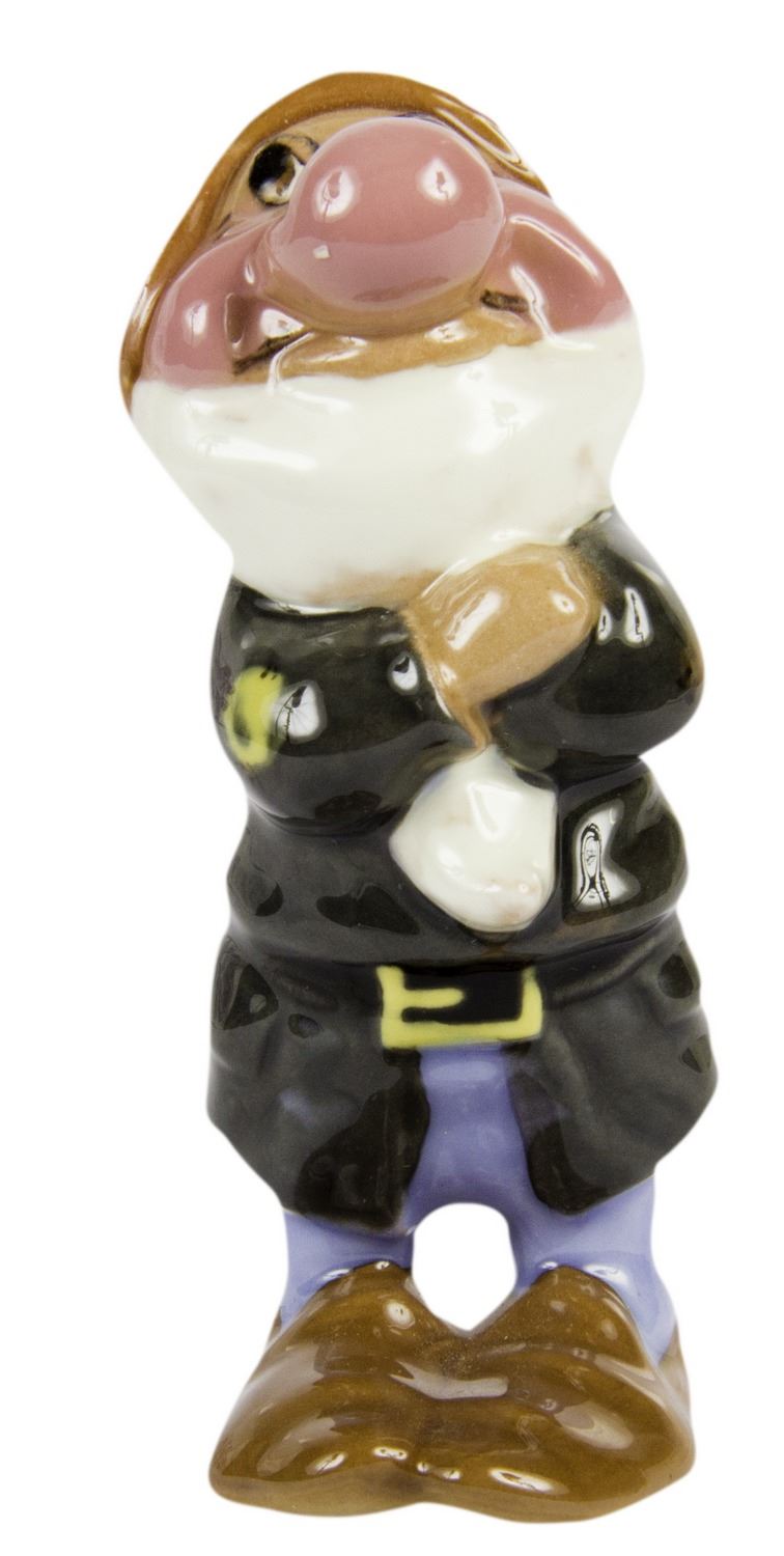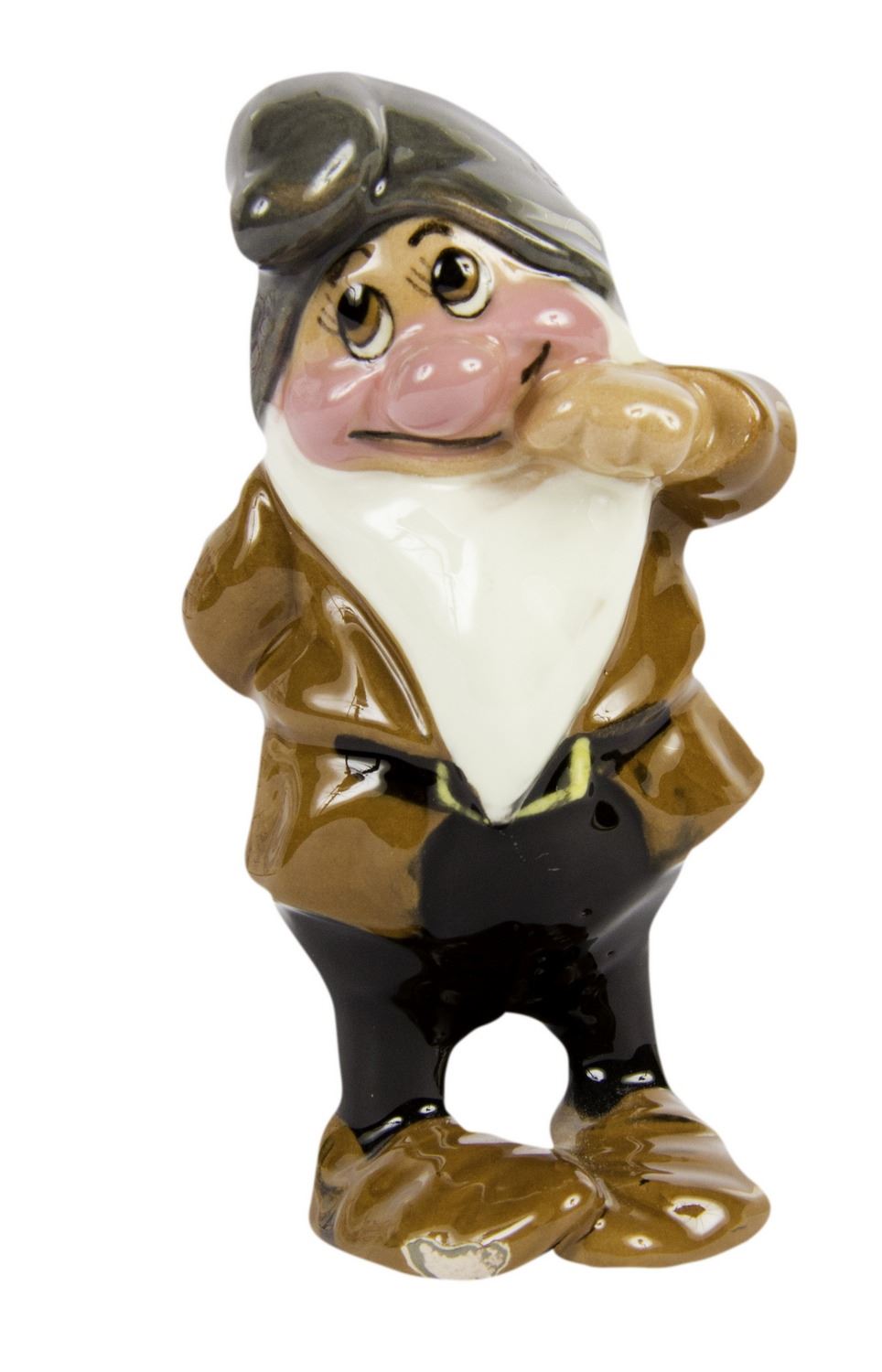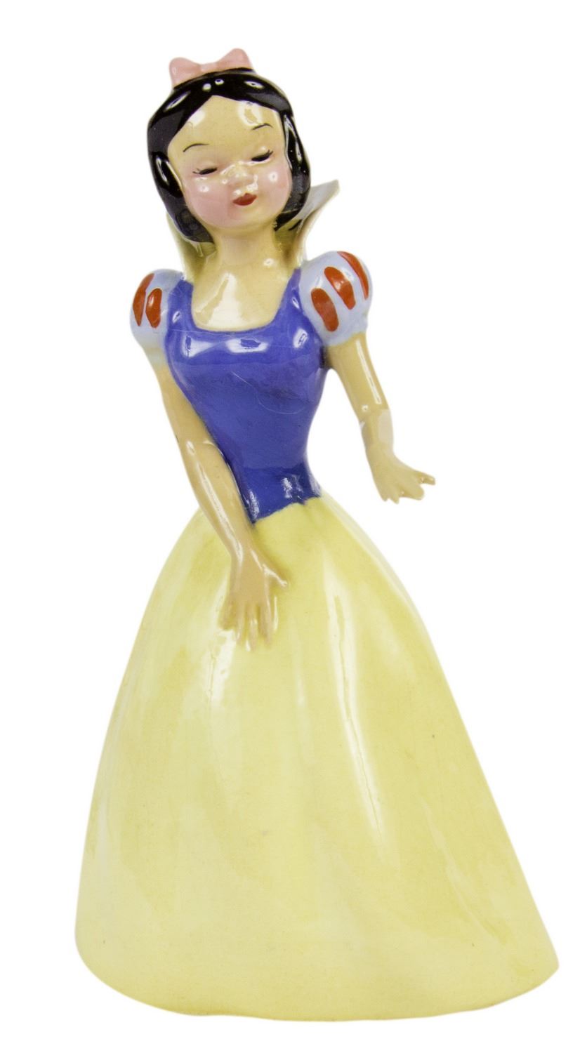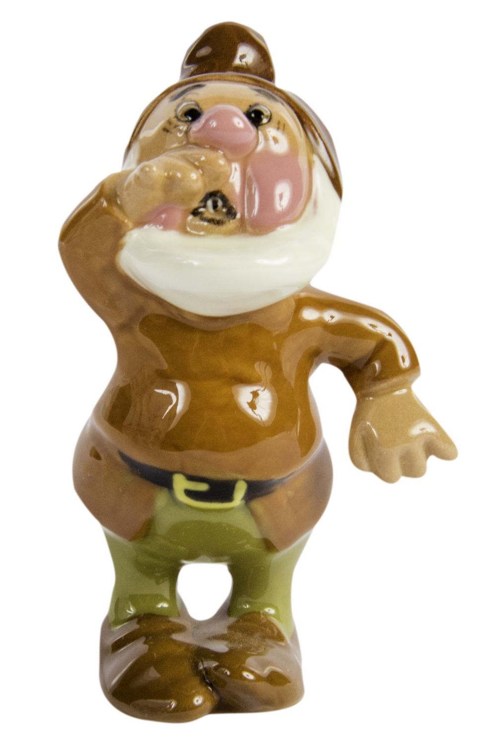 (Disneyland, 1955) An extremely rare complete set of (8) hand-crafted ceramic figures by Hagen-Renaker. Hagen-Renaker supplied Disneyland with some of the earliest ceramic souvenirs when it opened in 1955, and their items were often praised by Walt Disney for their quality and likeness to his characters. This set features Snow White and all seven Dwarfs, with each retaining their original foil Hagen-Renaker label on the back with the character names listed. Hagen-Renaker created sets in two sizes, with this being the complete larger set, which is extremely difficult to come by. Snow White measures approximately 6" tall while the Dwarfs measure approximately 3.25" tall. This set is in very good condition with little wear.