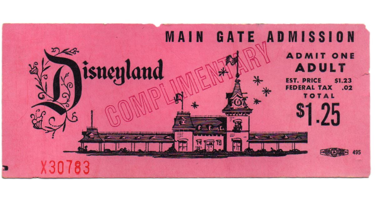 (Disneyland, 1960) Complimentary adult Main Gate admission ticket from 1960. These complimentary tickets would be given out by high-ranking Disney personnel and issued by City Hall for public relations. This unused ticket is still good for admission to the park today. Measuring 2 x 4.75 in. and in very good condition.
