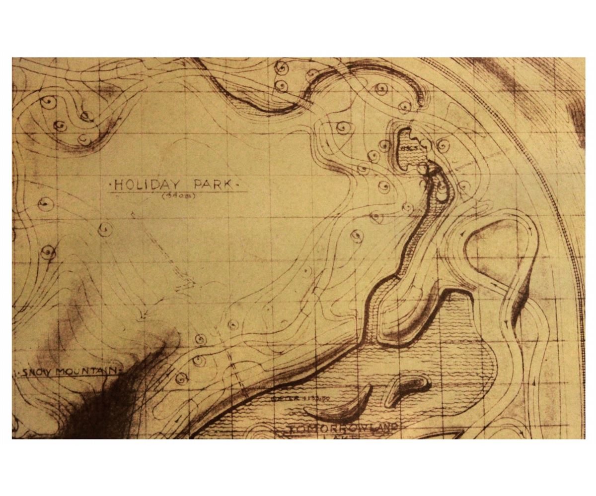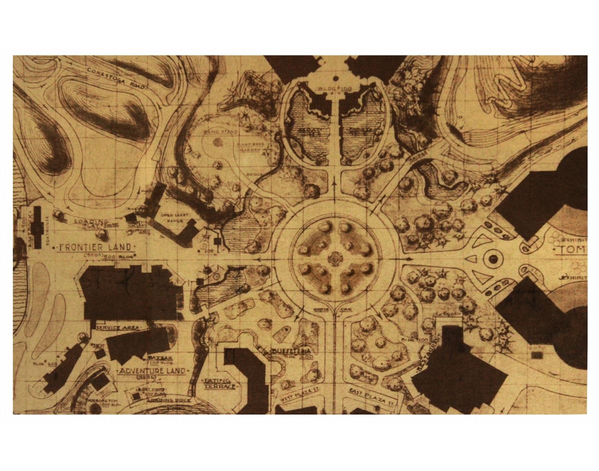 (WED, 1950s) An absolutely stunning artifact from the construction of Disneyland. This February 14, 1955 plot plan overview featuring the main section of the property is a rarity. It covers the last formative stages as construction of the park hurtled towards its opening, a mere five months later. It’s fascinating to still find at this late period, unfamiliar areas and attractions that never came to be; features such as an “Open Skeet Range”, “Arboretum” and “Archery Range”. Drawn by famed Disneyland planner, Marvin Davis, it is the ultimate park map in both detail and history. Construction artifacts are rare and brownlines such as this are almost non-existent. The process is similar to blue-printing where a scale mechanical drawing is photographically reproduced through a photo-chemical process. This technique was almost exclusively used by WED Enterprises during the planning and construction of the park. Rendered at 50’ feet to the inch, the piece measures 43” x 63” and is professionally framed. The brownline has been conservation restored, de-acidified and mounted on linen. Special shipping arrangements will apply.