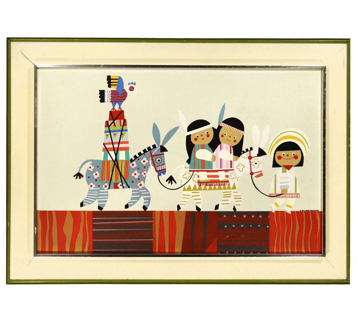 (Walt Disney World, 1970s) Beautiful silk-screened artwork that decorated the rooms at the Contemporary Village Resort. The artwork is taken from concept work by Imagineer Mary Blair. The artwork measures 20 x 30 in. Framed size is 26.5 x 36.5 in. and in good used condition with expected wear.