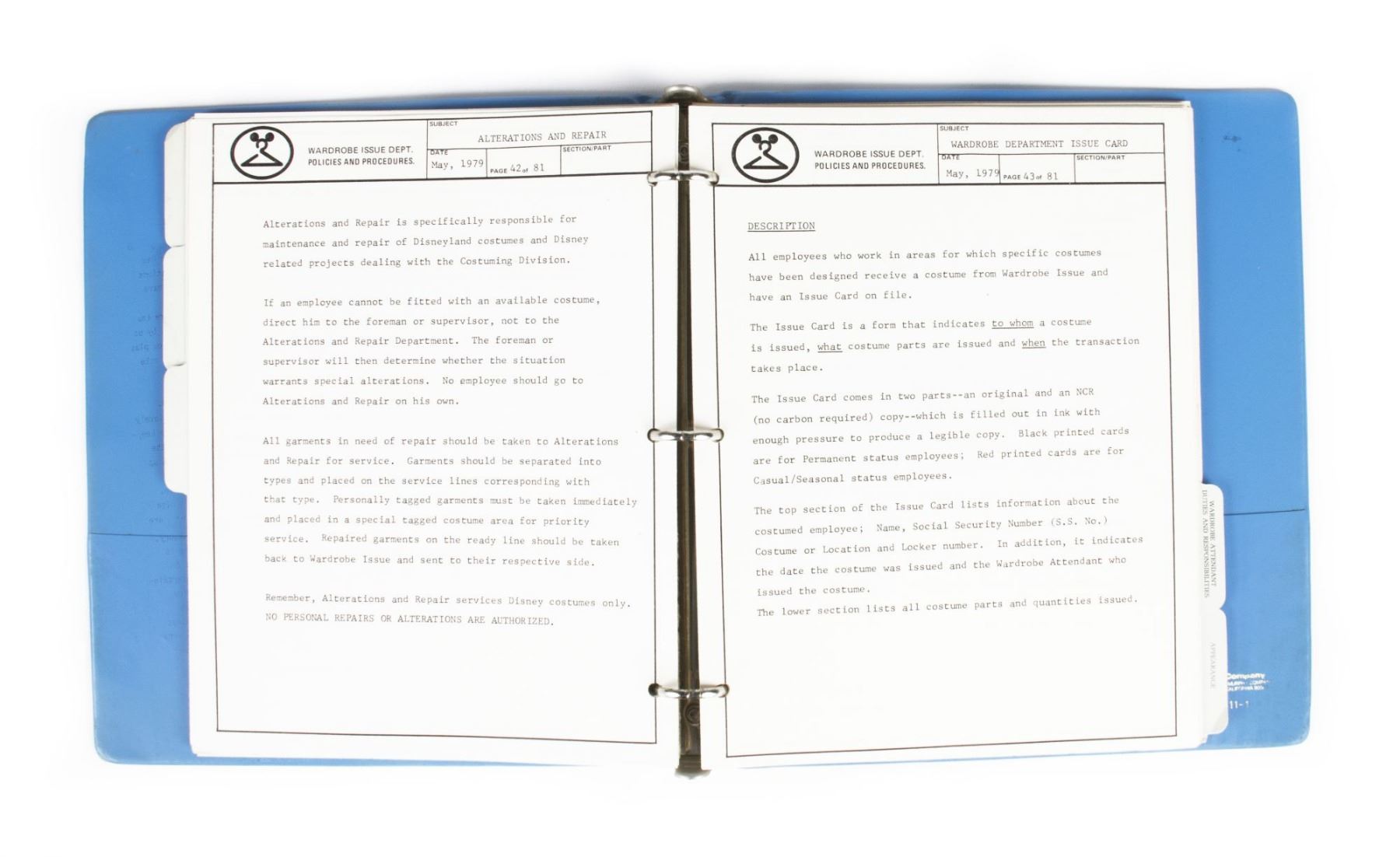 (Disneyland, 1980) A very rare Disneyland Costume Division training manual titled "The Wardrobe Storybook". The manual is separated into five sections: It's Not All Magic!, Wardrobe Locations, Wardrobe Issue - Policies and Procedures, Wardrobe Attendant Duties and Responsibilities, and Appearance. The manual itself is contained in a 3-ring binder with "The Wardrobe Storybook" printed on the front cover and spine. The back side of the binder says that the binder was prepared by Disneyland's Costume Division. Measuring 11.5"x10.5" and 1.5" thick, the manual is in good condition with some small spots of discoloration and wear throughout from use.