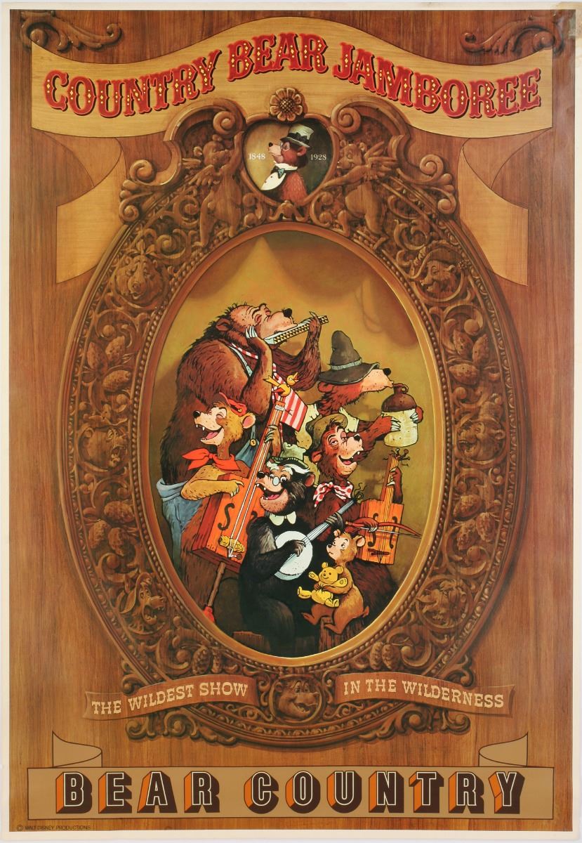 (Disneyland, 1972) Rare version of the "Country Bear Jamboree" attraction poster. This lithographic poster for the Disneyland "Country Bear Jamboree" attraction was designed by Marc Davis, Jim Michaelson, and Eddie Martinez. Most of the posters for this attraction were used both at Disneyland and Walt Disney World, however this particular poster had an additional silk-screened "Bear Country" placed along the bottom to advertise the newly created land at Disneyland and was only used in that park. Measures 53"x36". In very good condition.