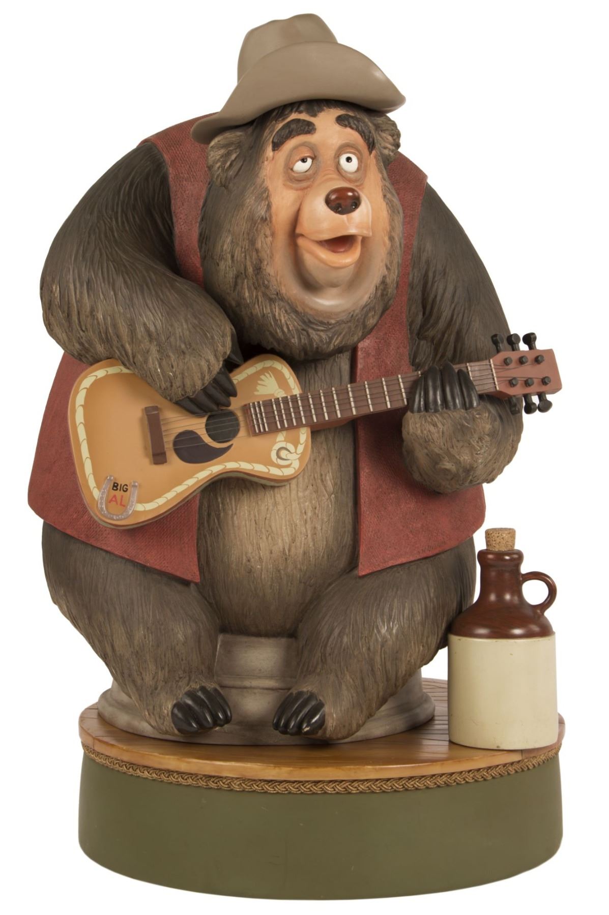 (Disneyland, 2005) A large "big fig" of Big Al from Disneyland's Country Bear Jamboree. The figure was designed by Kevin Kidney and Jody Daily for Disneyland's 50th anniversary and is accomplished in resin and metal with actual guitar strings. Big Al measures 19" tall and is in good condition overall with some scuffs in the color throughout the figure and base from previous display. The rare prop jar of moonshine is included, which is often missing.
