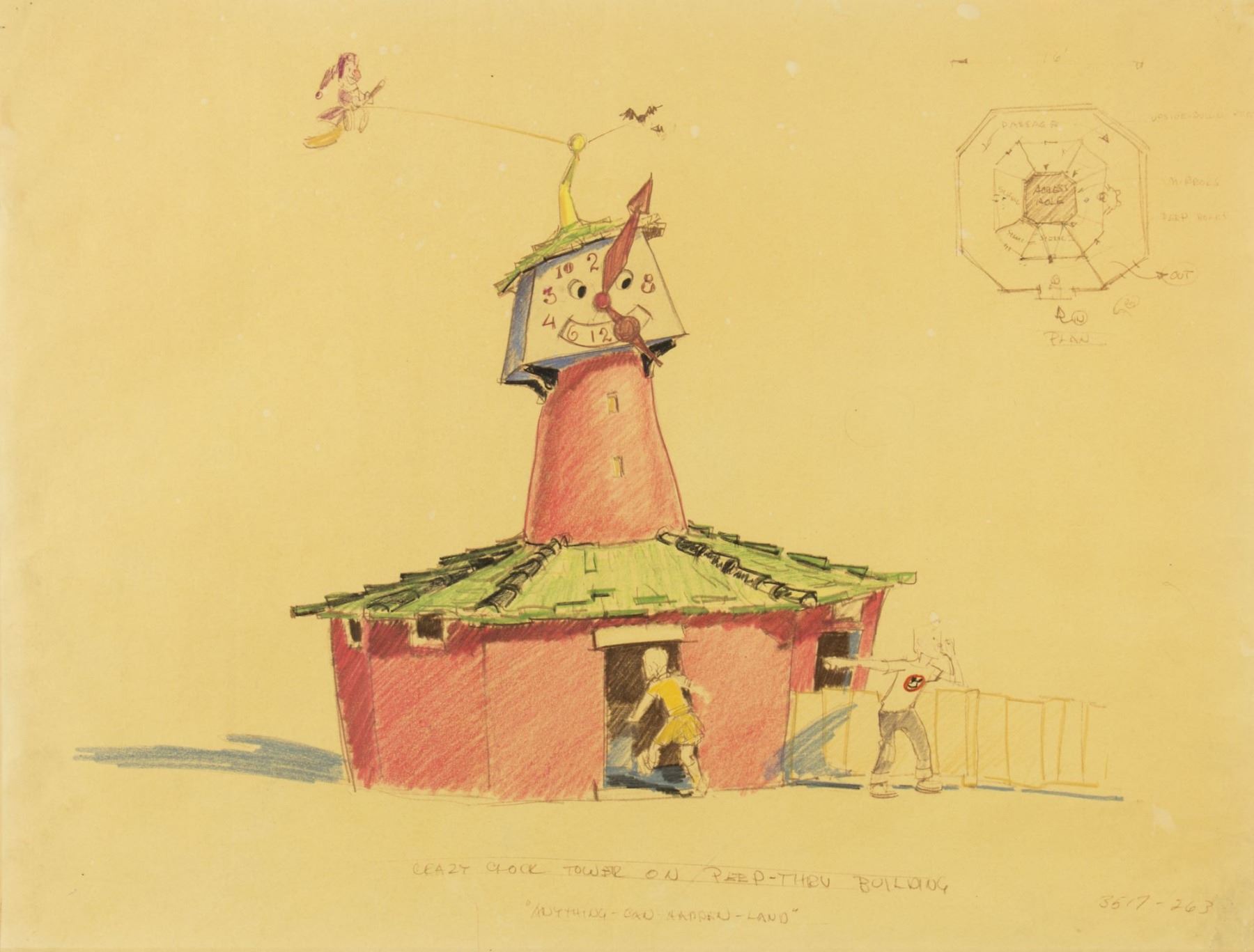 (Disneyland, c.1954) A hand-colored concept brownline by Imagineer Bruce Bushman. Titled "Crazy Clock Tower on Peep-Thru Building", this concept was created for Disneyland's unbuilt Anything-Can-Happen-Land. This brownline features Bushman's initials in pencil on the reverse and measures approximately 18.5"x24.5". The condition is very good with minor edge-wear and discoloration.