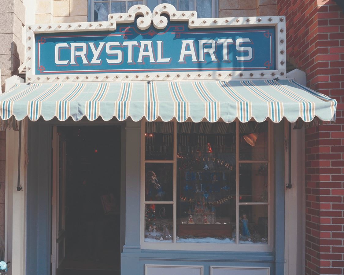 (Disneyland, 1970s-90s) An extremely rare original entrance sign displayed on the store front of the Crystal Arts glass shop in Disneyland's Main Street. Measuring 30.5" tall, 102" long, and 1" thick including the lip around the border, the sturdy metal sign is in good park used condition. It exhibits surface wear, paint loss, weathering, spots and patches of oxidation, and concentrated oxidation and corrosion to the bottom lip of the reverse. This is a chance to own an incredible and enduring piece of Disneyland history. This item may require special shipping arrangements, please inquire for details and estimates.