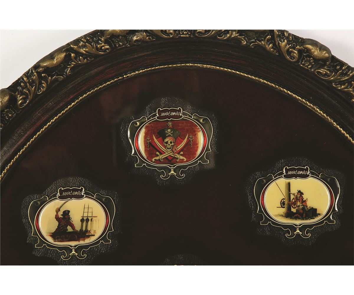 (Disneyland, 1990s) Exclusive limited edition made for the Imagineering division at Disneyland. The custom oval frame houses a set of (12) Pirates of the Caribbean pins with Marc Davis facsimile signature on brass. Each pin measures 2.5”x3”. The overall frame size is 27”x21”.