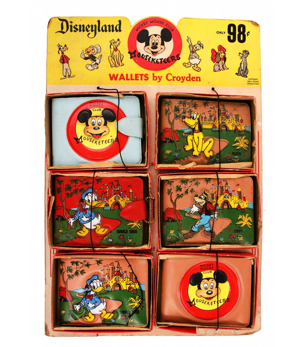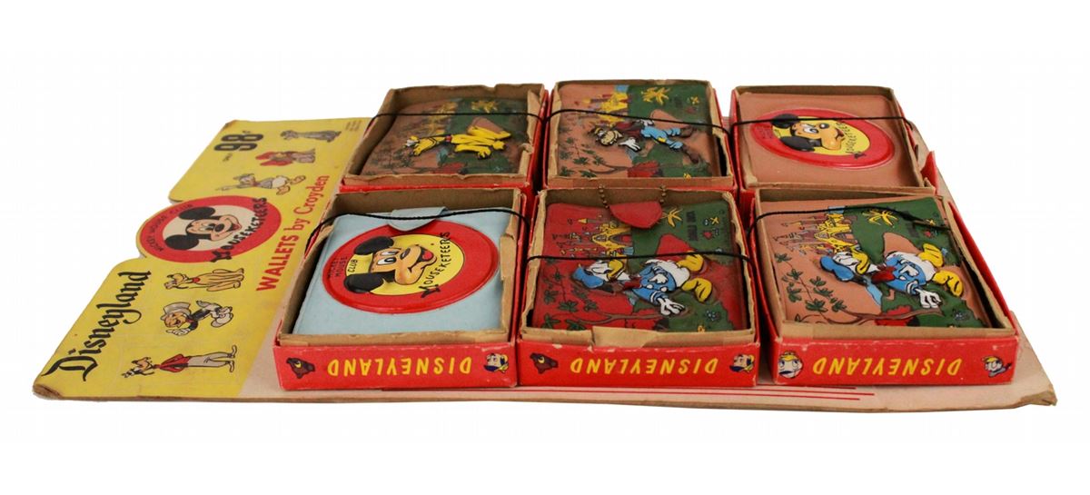 (Disneyland, 1957) A nice original point of sale store display with a full set of Disneyland and Mouseketeers themed wallets in their original boxes. Measuring 10 x 15 in. overall and in very good condition.