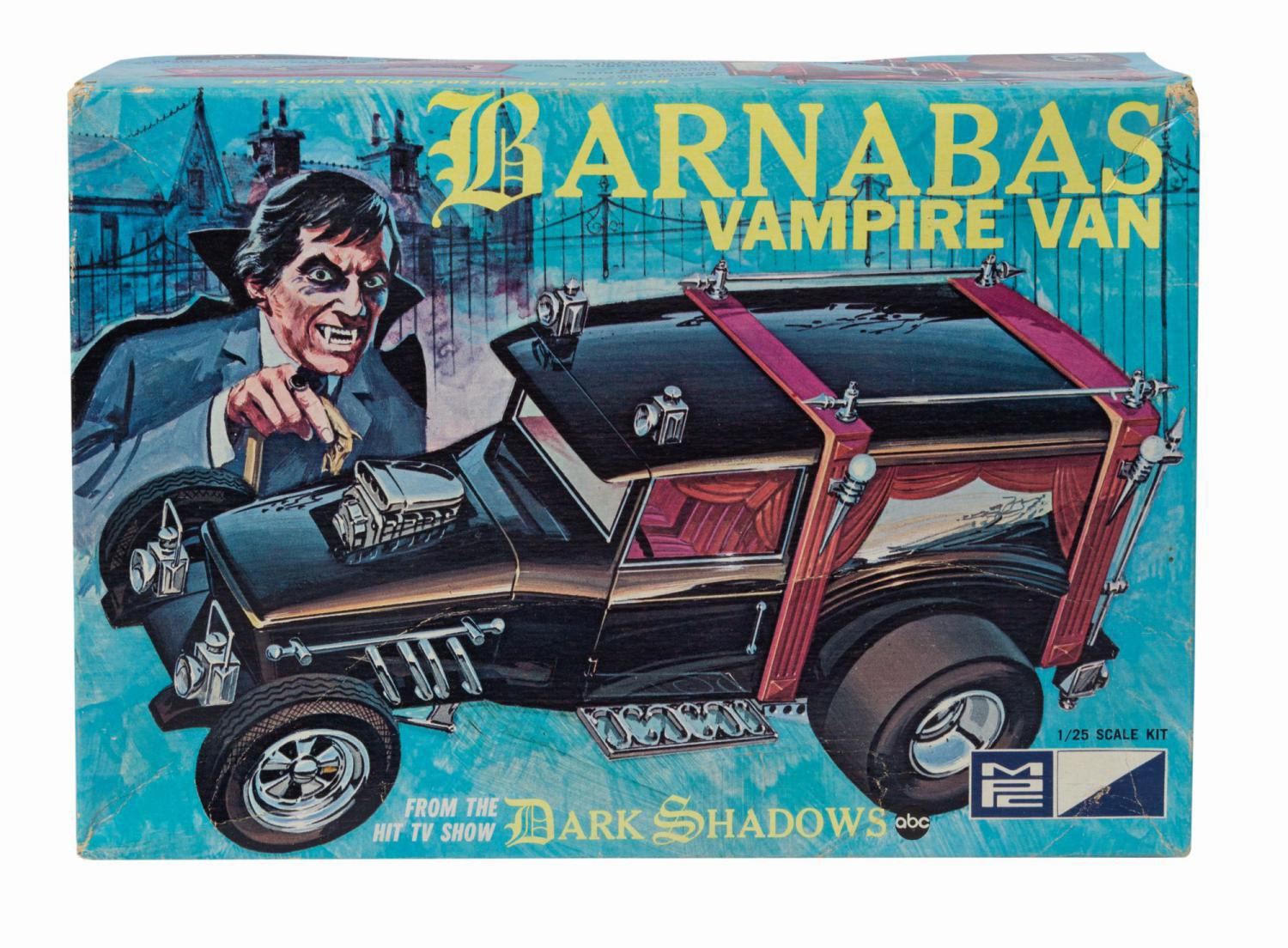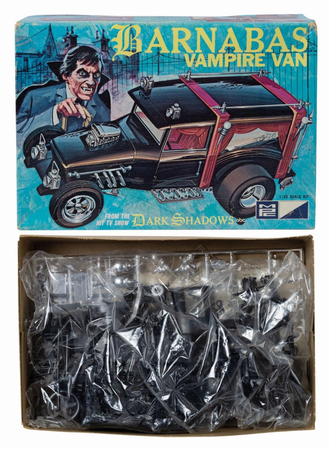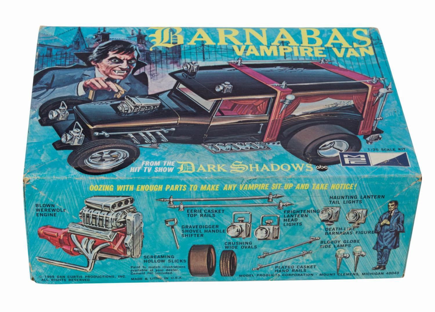 (MPC, 1969) A vintage Dark Shadows Barnabas Vampire Van model kit manufactured by MPC. The 1:25 scale model features eerie accoutrements such as a hearse-styled body with opening rear doors, curtained windows, and side torch lights. Most of the plastic model components are still attached to their sprues and factory sealed in a plastic bag. Measuring 6.5"x9.25" and 3.5" deep, the original box is in very good condition, exhibiting some stress lines and corner wear to the lid with an unobtrusive printing error on the right panel. The base of the box is creased on one side. The model components themselves are as-new.