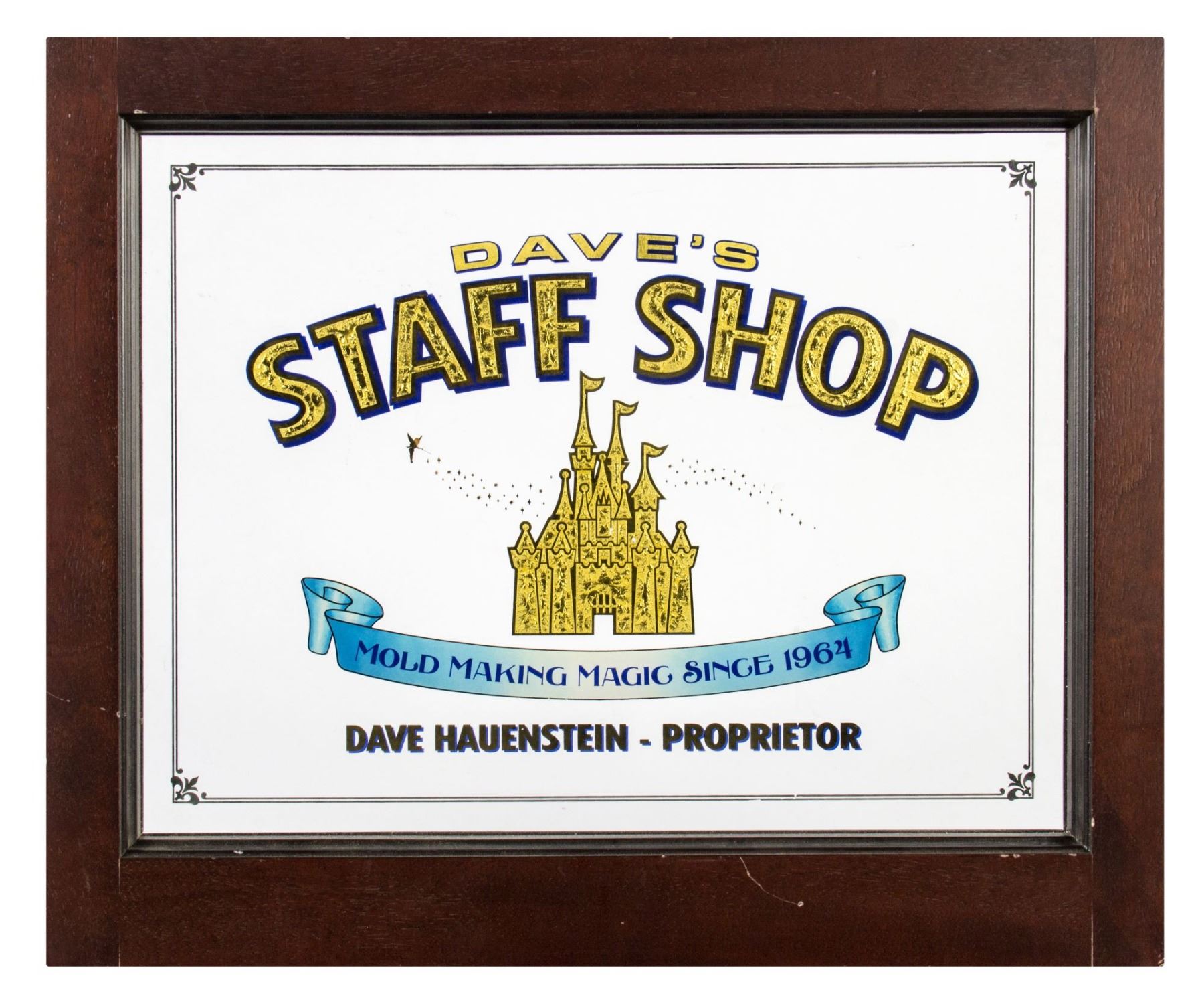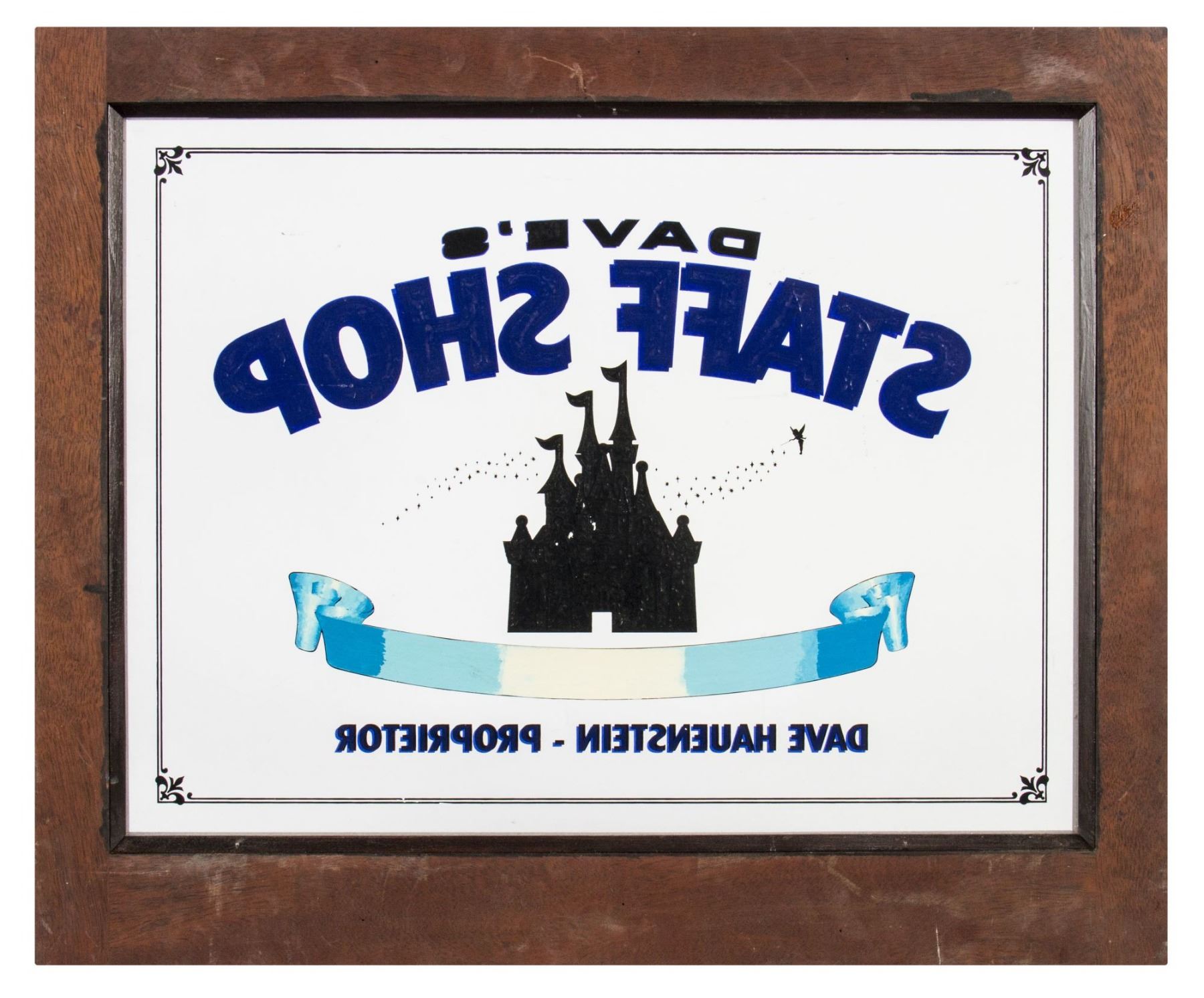 (Disneyland, c.1980s) A decorative window that was specially created in the style of Disneyland's Main Street windows for Dave Hauenstein of Disneyland's employee "Staff Shop". Dave was a Disneyland employee for 43 years and this window was custom created for Dave in honor of his years of service to the park. This painted glass window measures 18"x22" and is in very good condition with some minor wear to the frame from use.