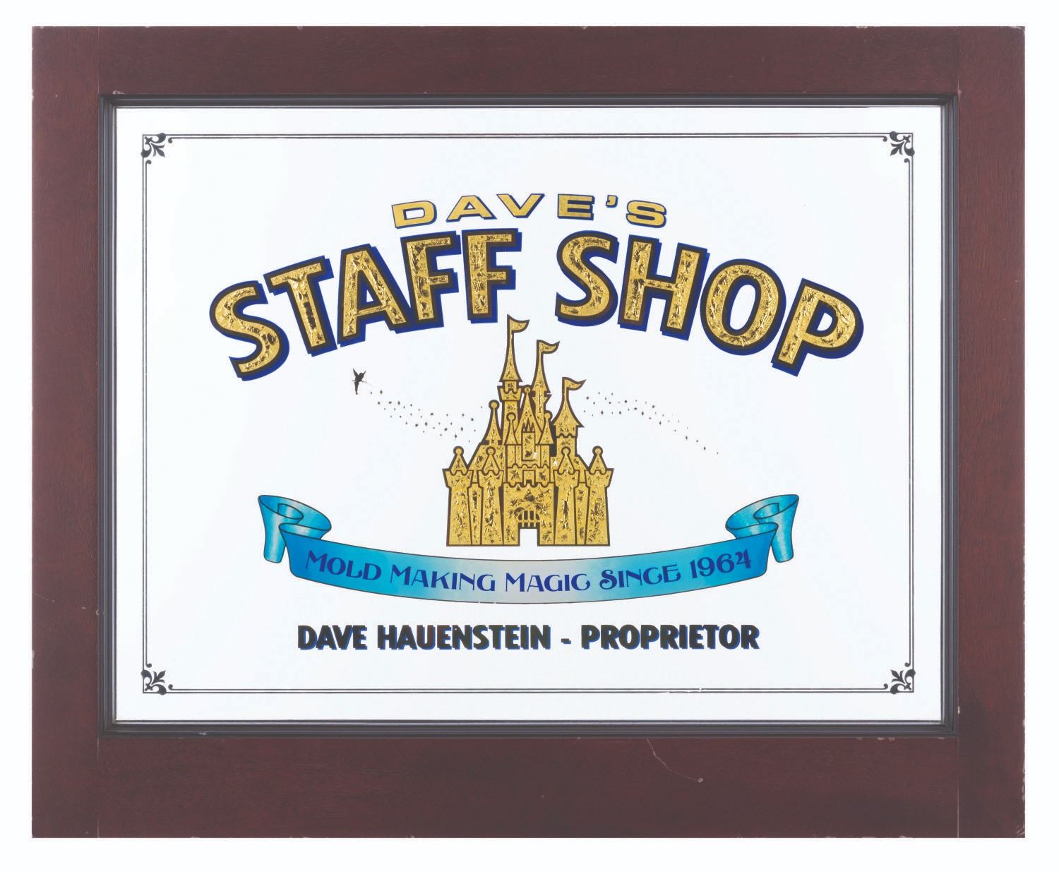 (Disneyland, 1980s) A decorative window specially created in the style of Disneyland's Main Street windows for Dave Hauenstein of the Park’s employee "Staff Shop." Dave was a Disneyland employee for 43 years and this window was custom created for Dave in honor of his years of service to the Park. This painted glass window measures 18" x 22" and is in very good condition with some minor wear to the frame from use.
