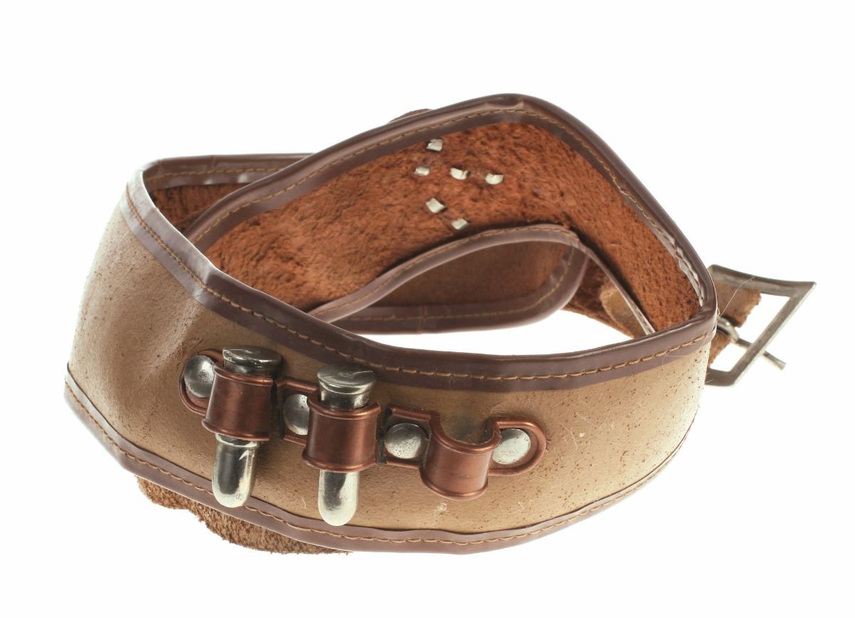 (Disneyland, 1950s) Fantastic Davy Crockett leather holster, ammo belt, and pair of cap guns. Includes (2) faux bullets for the holster. Set is in good condition with some wear from use.