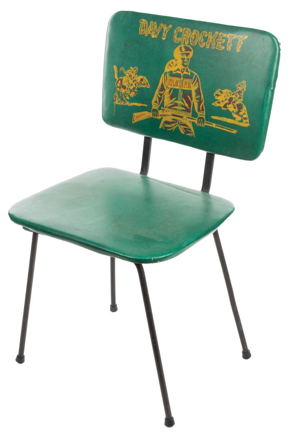 (1950s) A Davy Crockett child's chair with vinyl padded seat and back. Measuring 14"x12"x25" high, the chair is in fine condition, with light wear and oxidation to the metal legs, a single .25" hole in the otherwise like-new vinyl, and a stripe of flaw in the left side of the painted image that appears original to production.