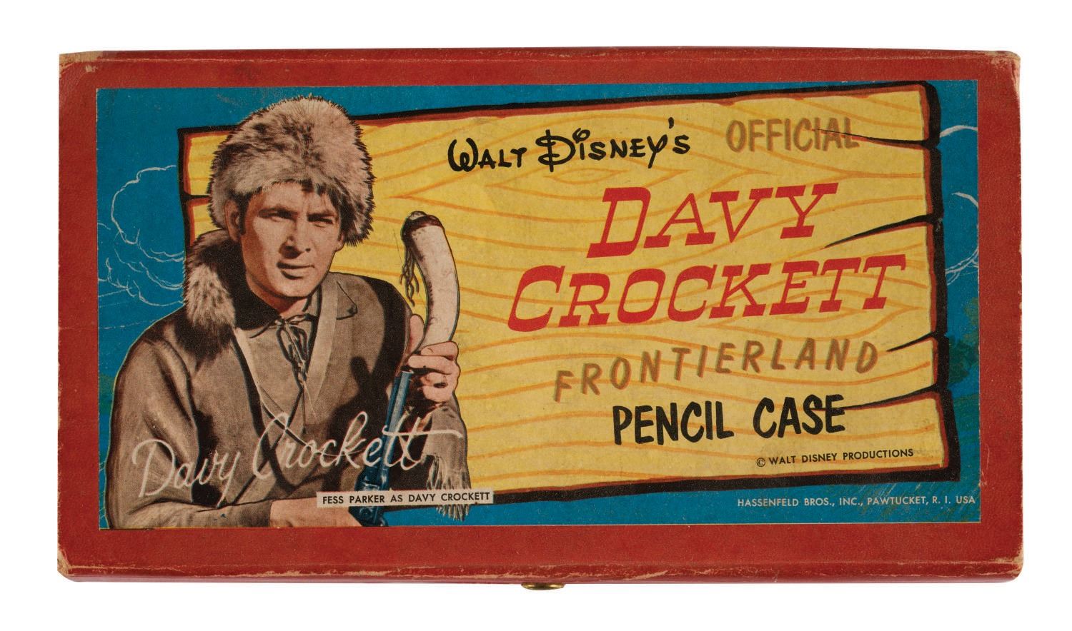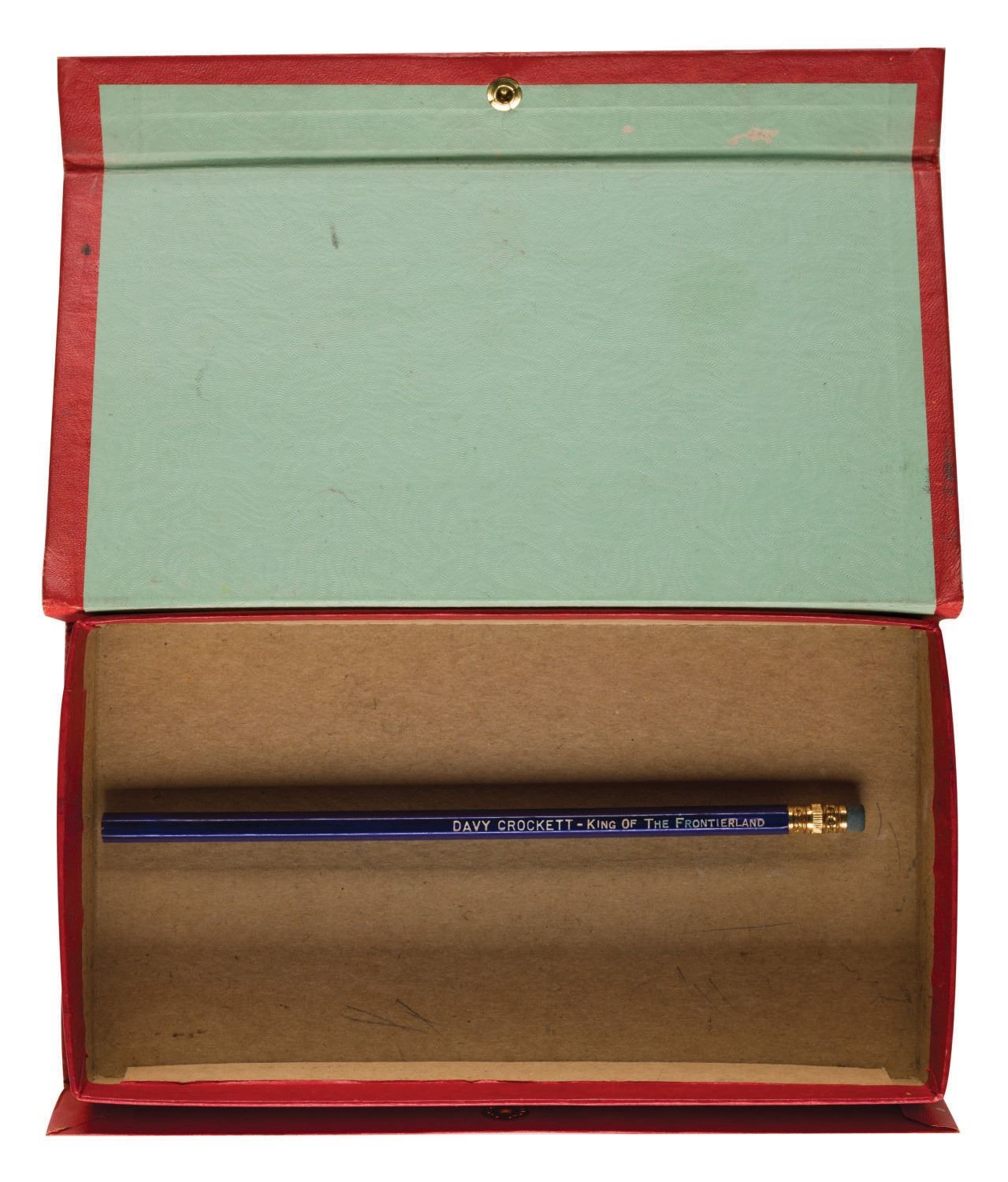 (Hassenfeld, 1950s) A Walt Disney's Official Davy Crockett Frontierland Pencil Case by Hassenfeld Bros. The box with hinged lid features a snap fastener, colorful image of Fess Parker, and comes with one original and unused 7.5" Davy Crockett – King of The Frontierland pencil. Measuring 8.75"x4.75"x1.5", the cardboard pencil case is in good condition, despite missing interior divider tray, minor creases, and wear to edges, corners, and along folds.