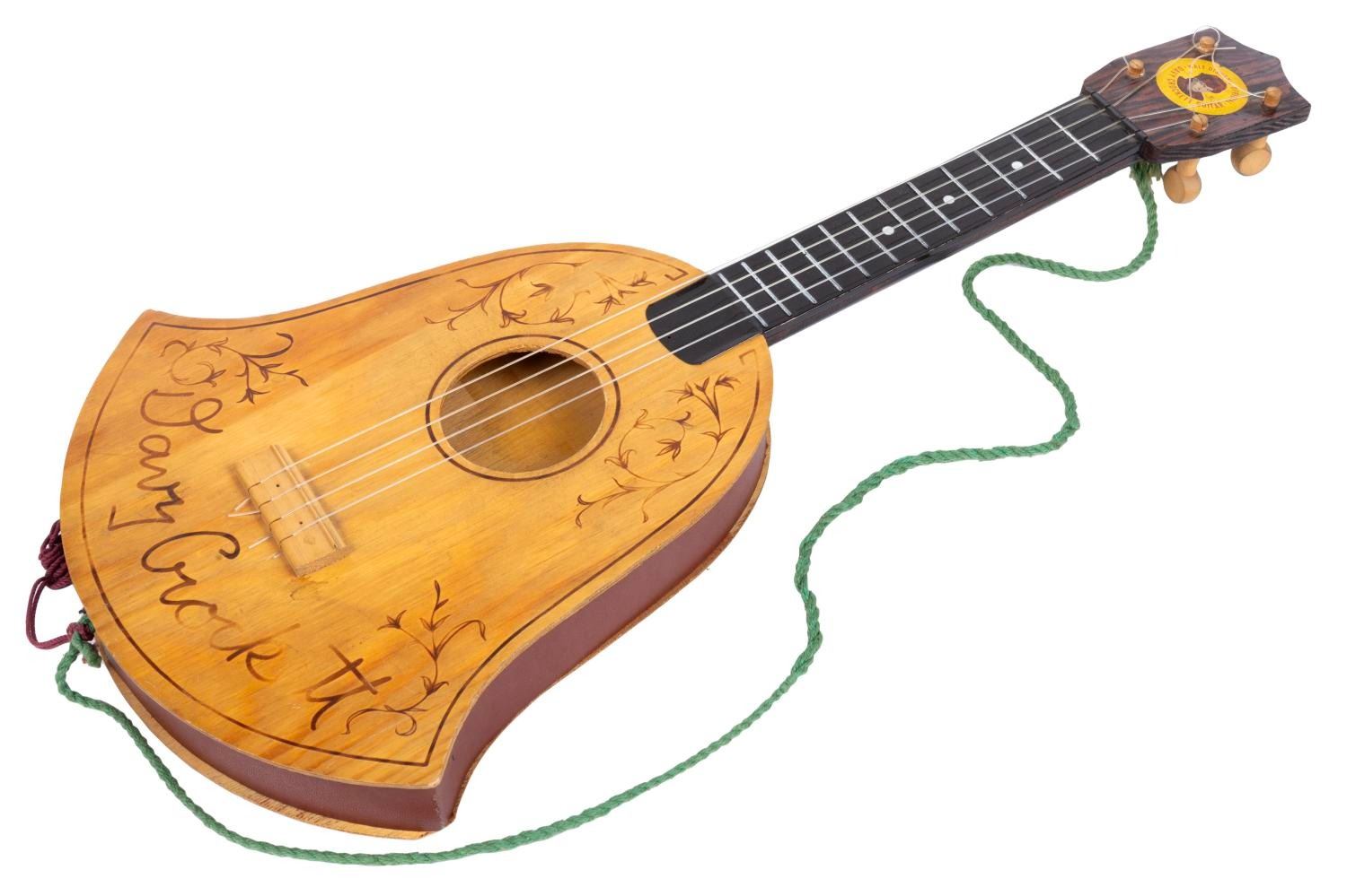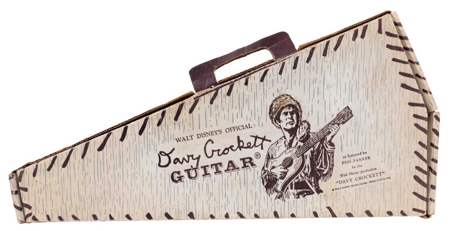 (Peter Puppet Playthings, 1955) A Walt Disney's Original Davy Crockett Guitar with the original box by Peter Puppet Playthings, Inc. The guitar features a wood body, plastic strings, and metal fingerboard, and is missing the pick, book of songs, and instructions. Measuring 24.5" long, the guitar is in very good condition with slight fading to the letters on the body, and little wear overall. The box is in good condition with slight wear to the edges and corners.