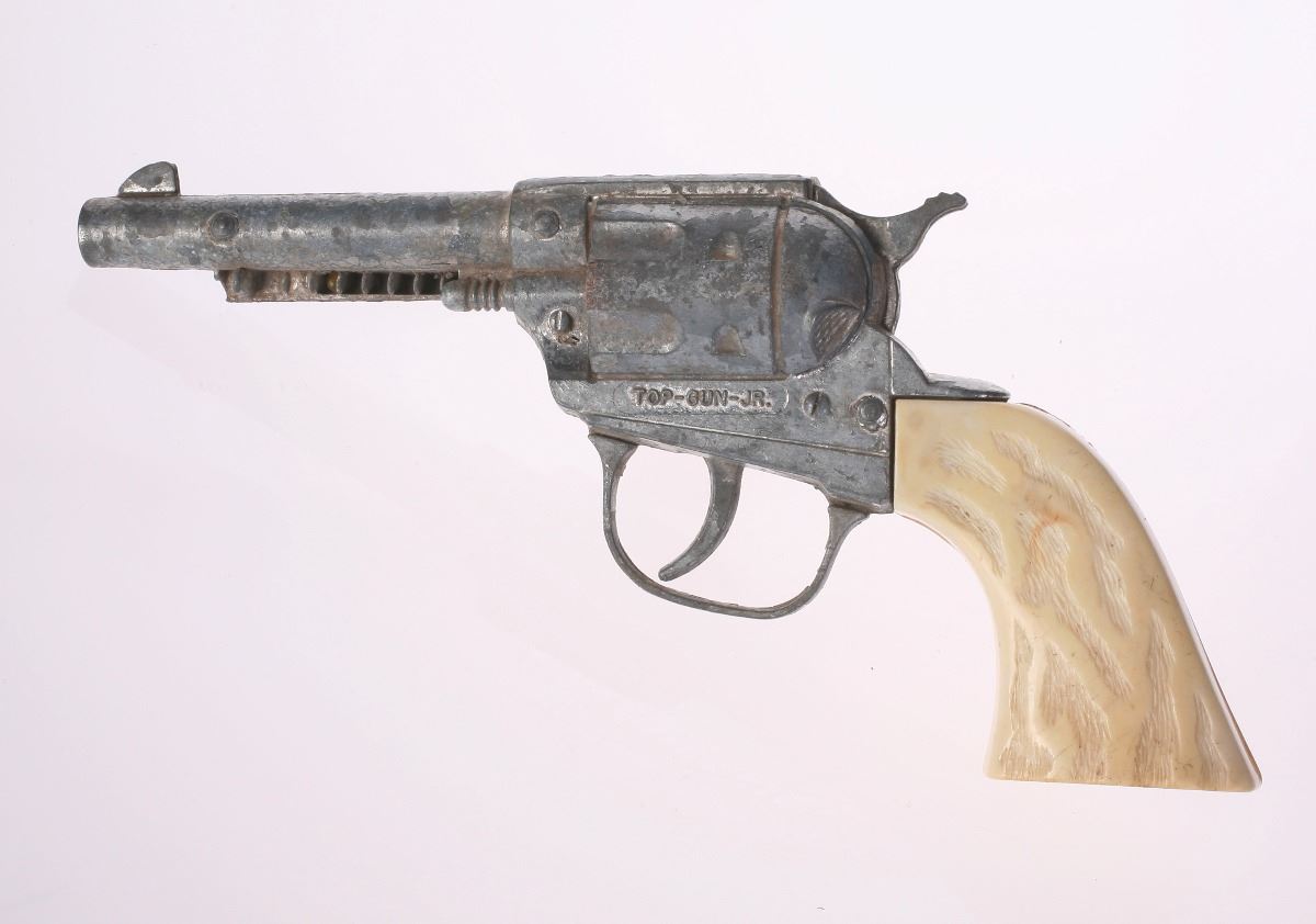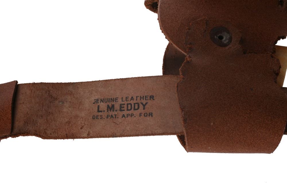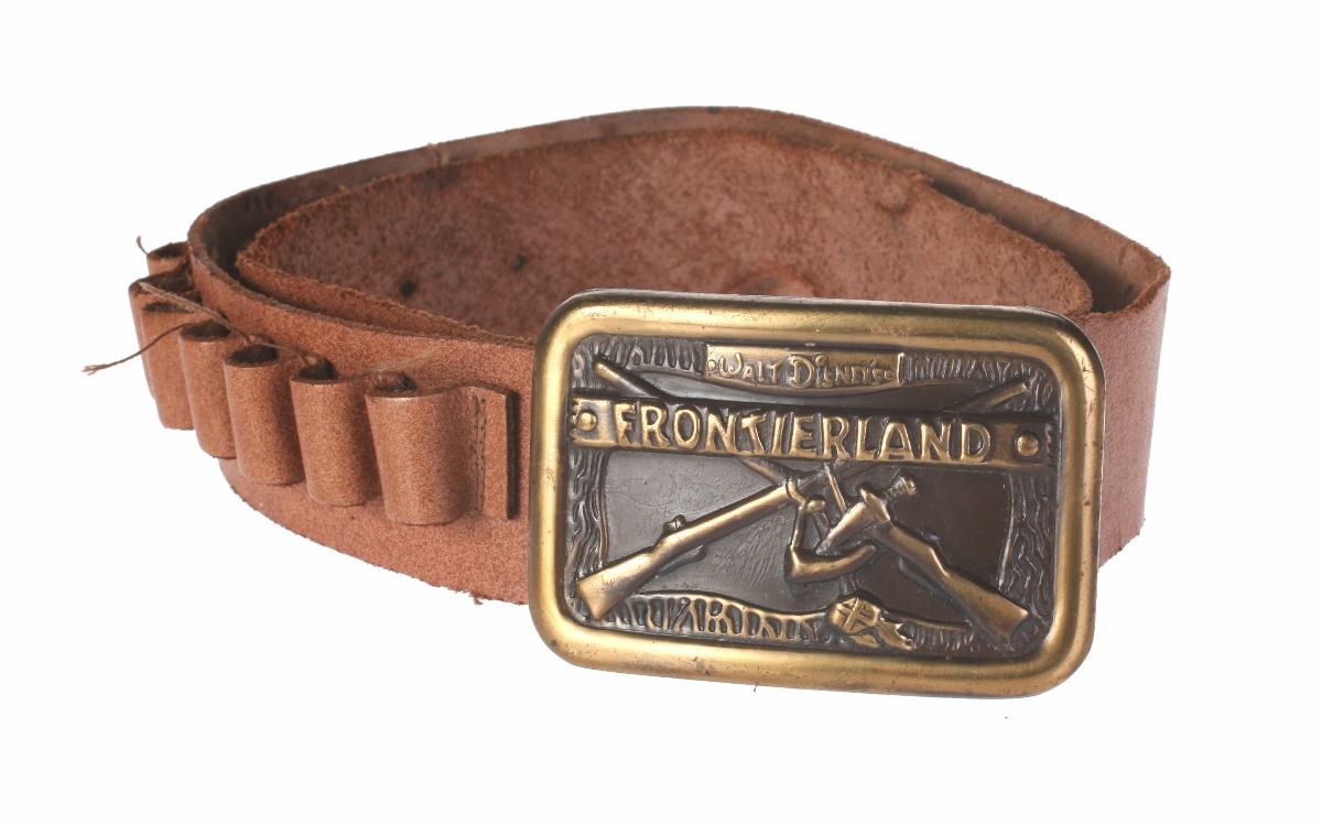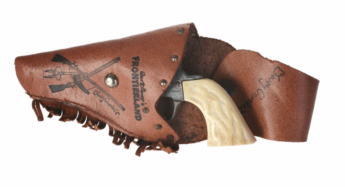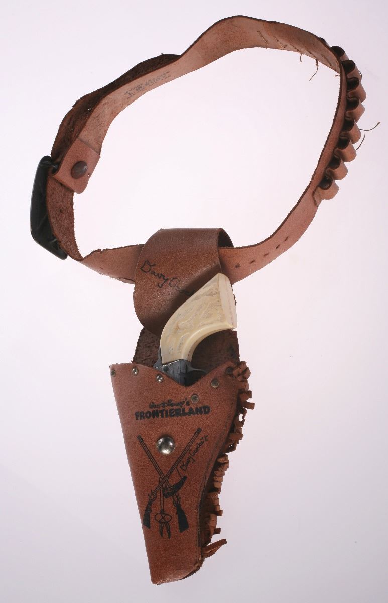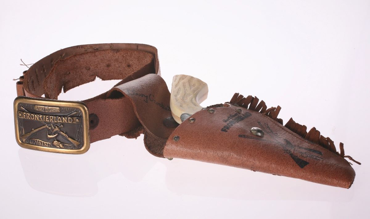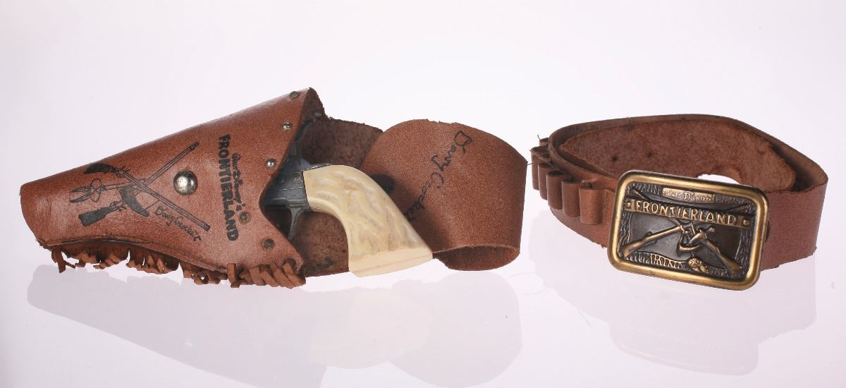 (Disneyland, 1950s) Charming Davy Crockett memorabilia set from Frontierland including a toy gun, holster, and belt with buckle. Holster and belt buckle contain excellent Frontierland imagery on the front. Holster measures 4.5"x1.5" and 10" tall. Belt measures approximately 36" long. Set is in good condition with some general wear from use and some holes and tears to the leather items.