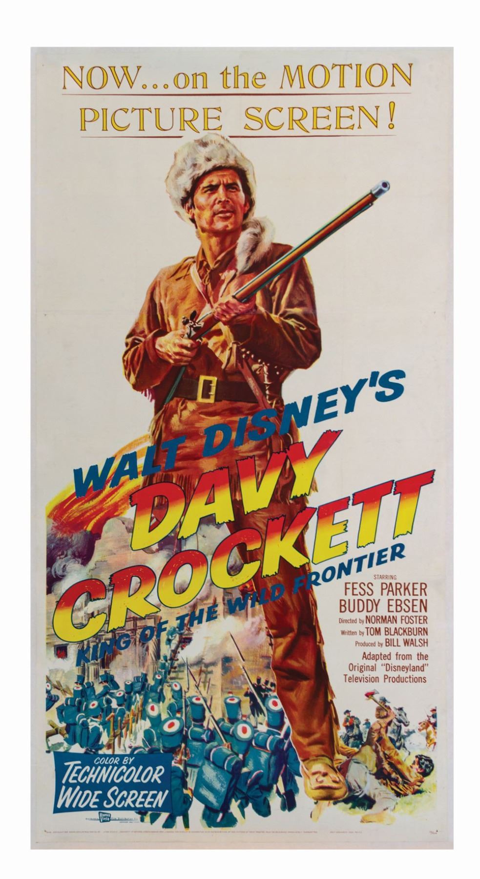 (Disney, 1955) A very rare original 3-sheet poster for Davy Crockett, King of the Wild Frontier. This theatrical release combined the first three episodes of the wildly popular Fess Parker television series into one stand-alone story. This poster is scarcely seen in such an impressive size, and beautifully depicts Parker in his role as Davy Crockett. The poster measures 78.75"x41" and is in good condition with minor creasing and surface wear. The poster has been linen-backed for its preservation.