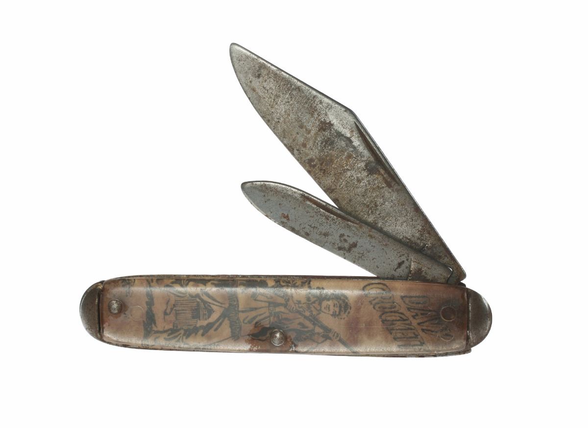 (Disneyland, 1950s) Souvenir Davy Crockett pocket knife with decorative handle. Measuring 3.5" long and in good condition.