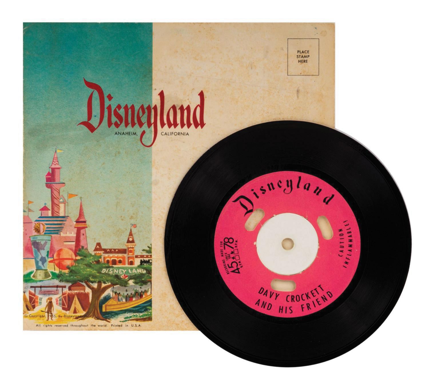 (Disneyland, c.1955) A "Davy Crockett and His Friend" 6-inch Disneyland 45rpm record. Recorded at the short-lived recording booth at the entrance of the Main Street Arcade, the approximately 2-minute recording features pre-recorded Donald Duck audio introducing a young Park guest who recorded himself singing the Ballad of Davy Crockett within the unique recording booth at the Park. It is contained in the mailing sleeve with colorful Magic Kingdom motif. Measuring 6" in diameter, the 45rpm record is in fine condition with minor surface wear.