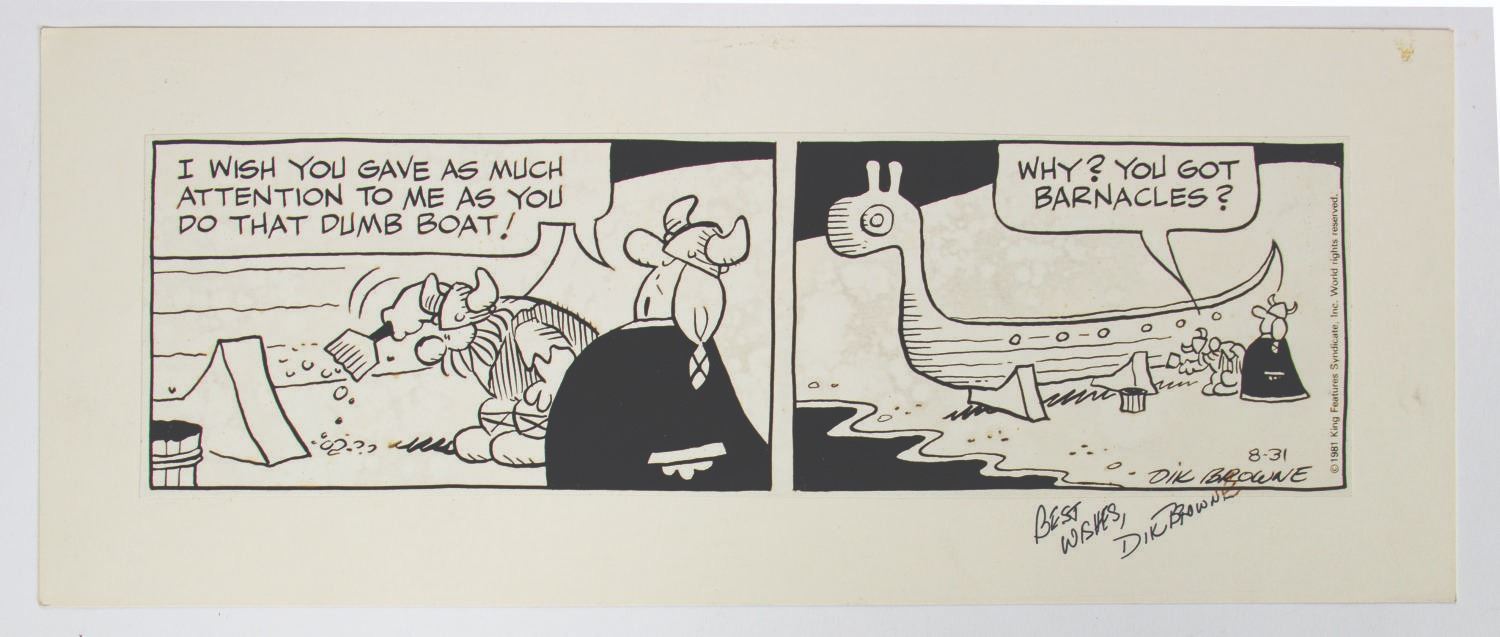 (1981) A presentation Hagar the Horrible comic strip signed by creator and artist Dik Browne. The piece consists of a photographic reproduction of the two-panel daily Hagar strip dated 08/31/1981 mounted to a larger section of lightweight artboard. Browne has inscribed and signed in black ink at bottom right, "Best wishes, Dik Browne." Measuring 6.25"x15.25" overall, the piece is in very good condition with a small adhesive stain at top right and a smudge at center right. The last two letters in Browne's signature are on the photo and have slightly faded and browned with age.
