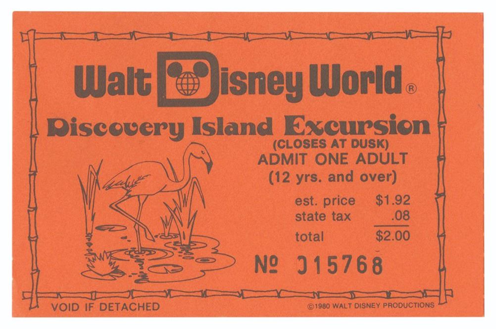 (Discovery Island, 1980) A rare Discovery Island Excursion adult ticket from 1980. The ticket features a bamboo border and a flamingo balancing on one leg. Measuring approximately 2.25"x3.25", the ticket is in very good condition with minor wear.