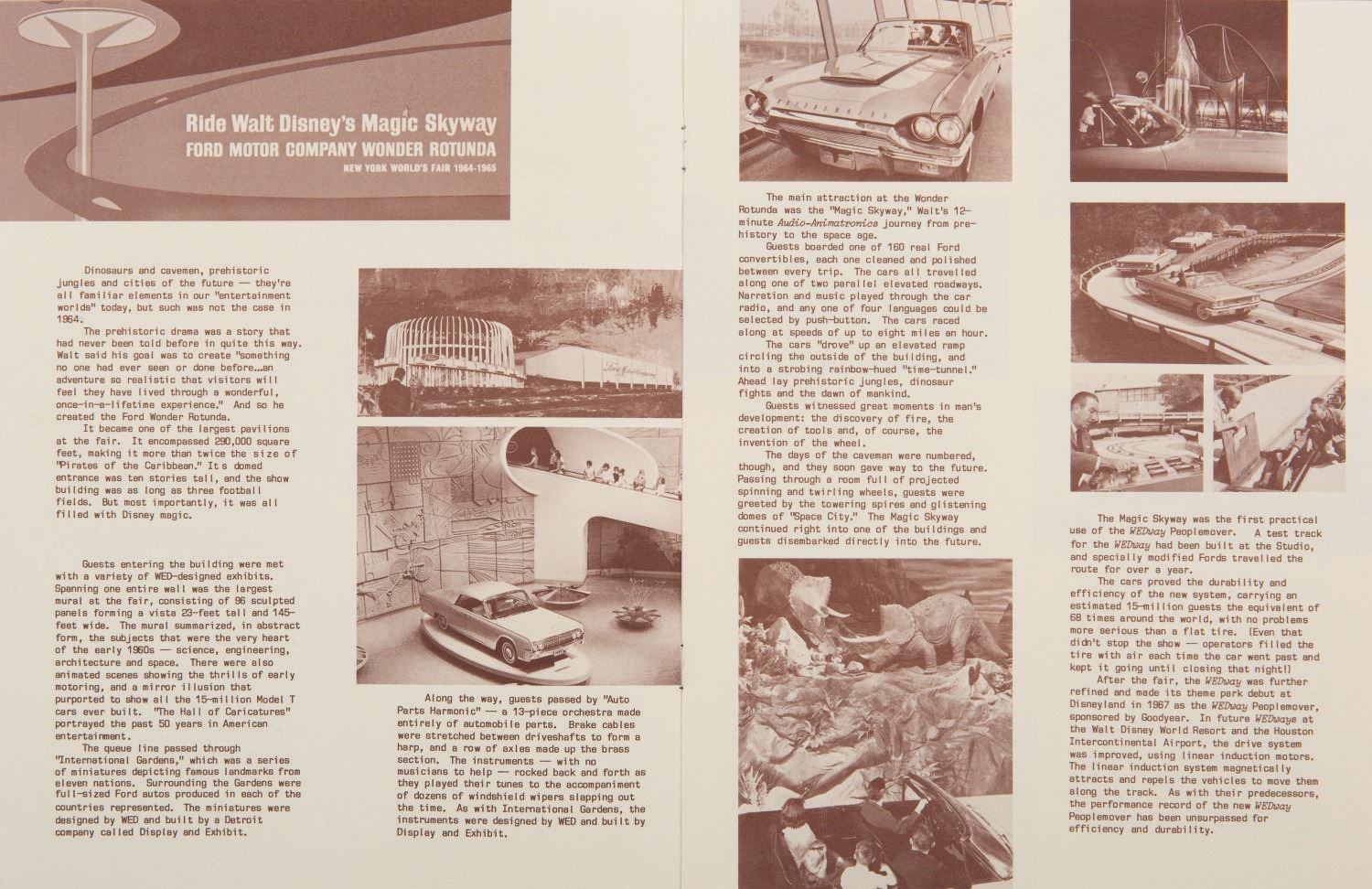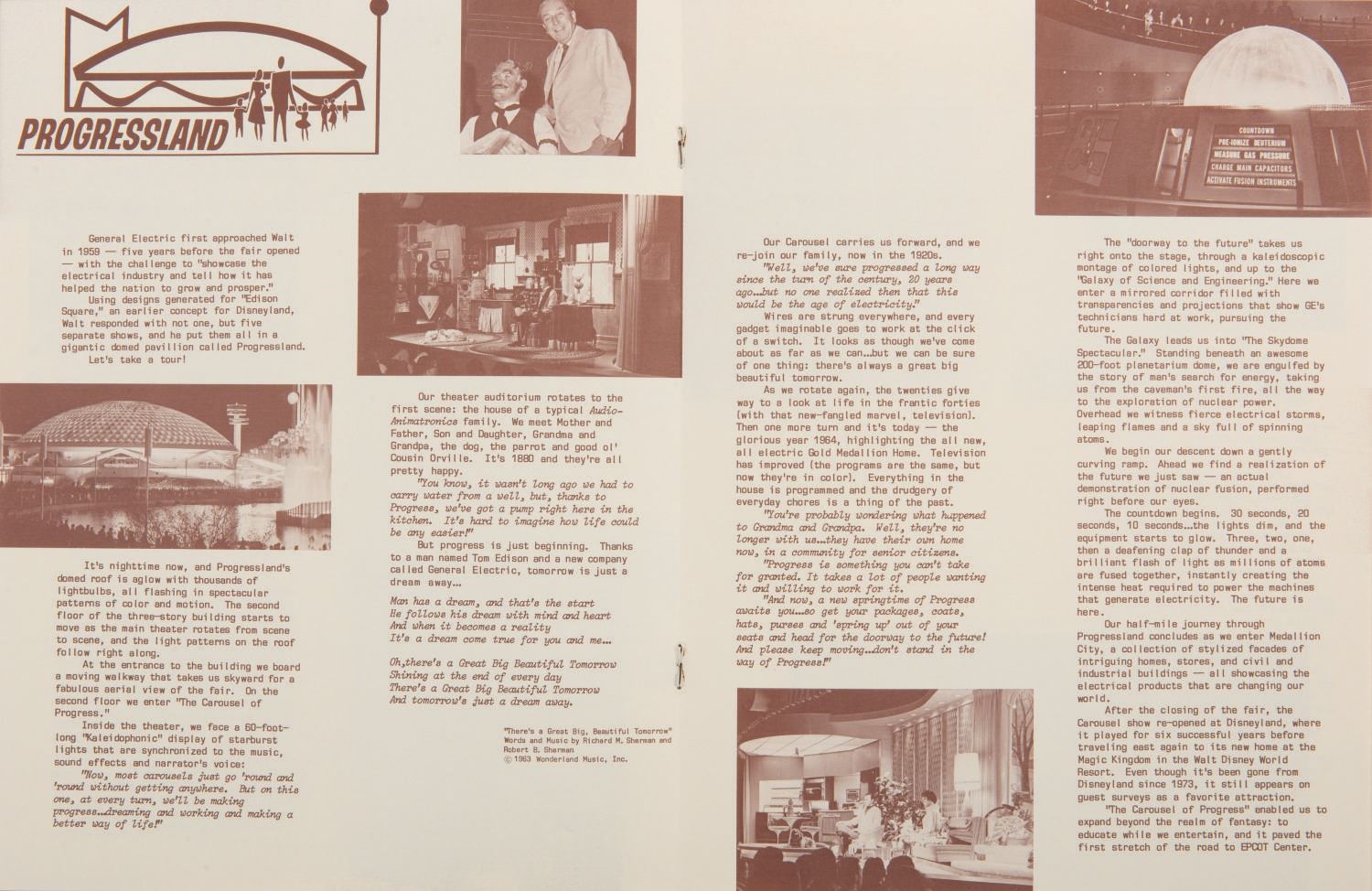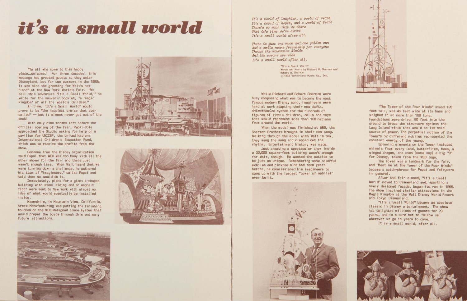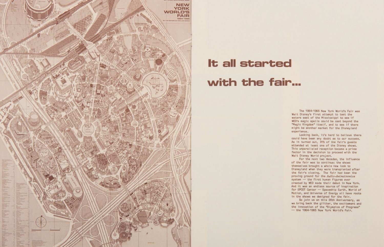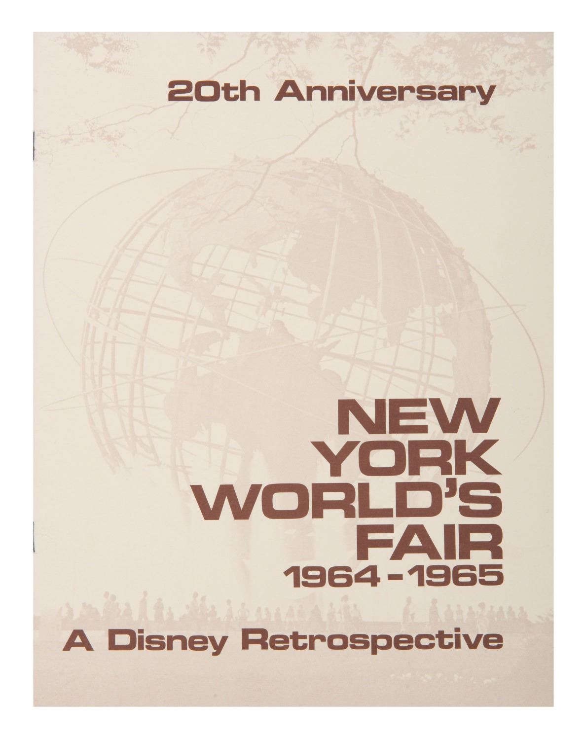 (Disney, 1984) A 20th Anniversary New York World's Fair Disney Retrospective booklet. The 9-page, staple-bound booklet published by Walt Disney Productions takes a look back at each Disney show including in the fair; Disney's Magic Skyway, Progressland, Great Moments with Mr. Lincoln, and It's a Small World. Measuring 11"x8.5", the short publication is in fine condition.