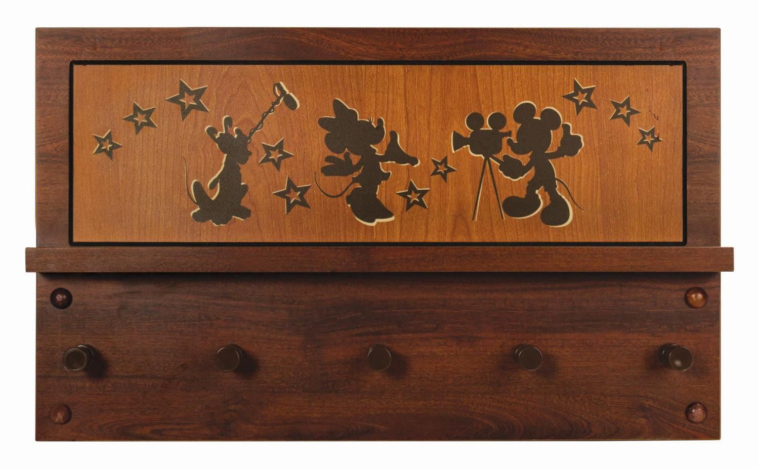 (All-Star Movies Resort, c.1999) A themed guest room coat rack from the Disney All-Star Movies Resort at Walt Disney World. Constructed of particle board with a wooden laminate finish, the coat rack features five plastic pegs for hanging, a short central shelf, and a decorative panel depicting silhouettes of Mickey Mouse, Minnie Mouse, and Pluto making a movie. Racks like these hung in every guest room in the resort until a recent refurbishment. Measuring 12.5"x21" and 2.25" deep, the piece is in very good condition with a small scratch at lower left, and scattered surface wear. The reverse of the rack is equipped with holes for wall mounting.