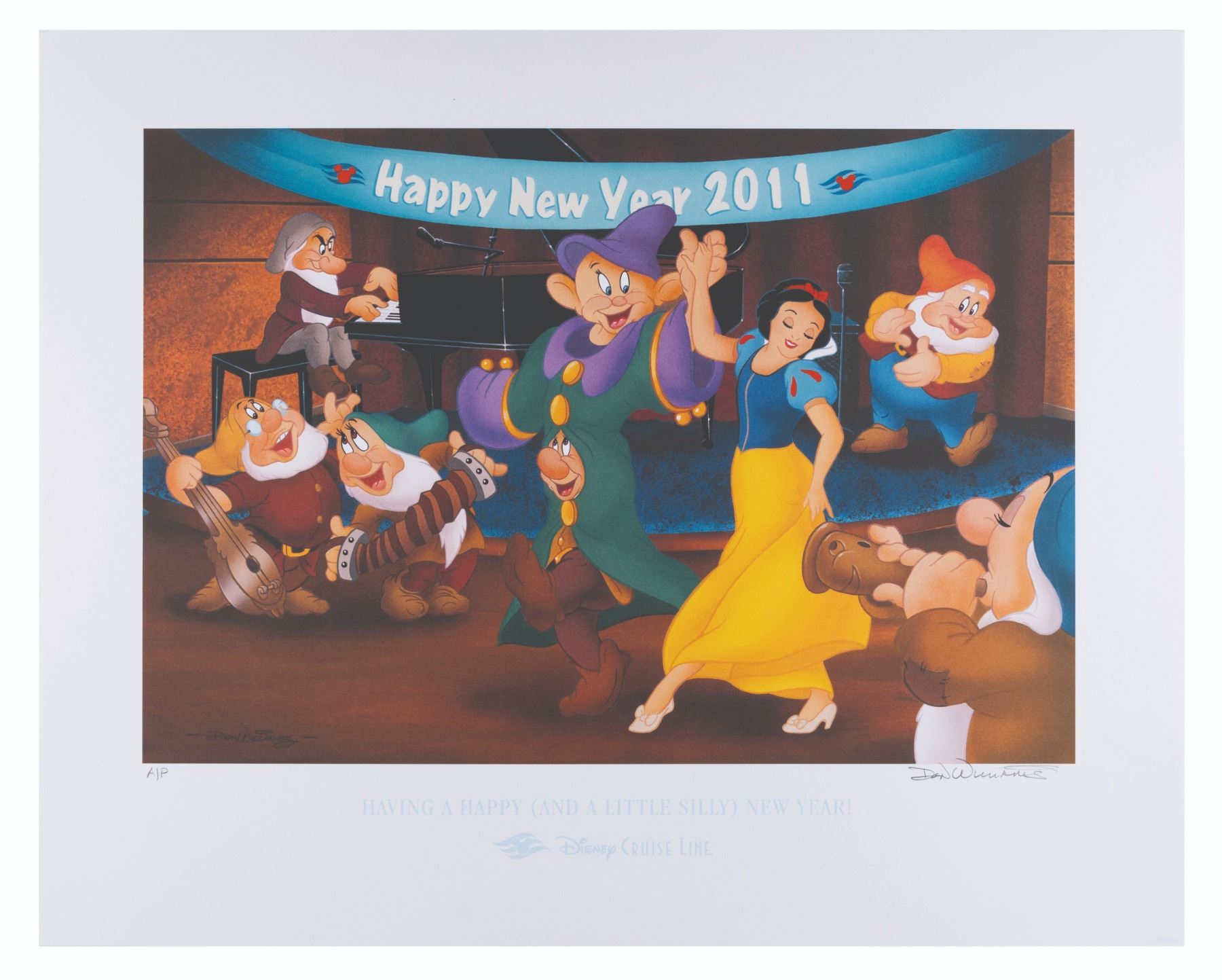 (Disney, 2010) A lithograph of Snow White and the Seven Dwarfs dancing on New Year's Eve, 2010. Titled "Having a Happy (And A Little Silly) New Year!" the piece commemorates those who celebrated the New Year aboard a Disney Cruise Line ship. Released in a limited edition of 2,200 plus 50 artist's proofs, this lithograph is signed in pencil by the artist Don Williams and marked "AP." With an image size of 11" x 16" on 16" x 20" acid-free paper, the art is in fine condition.