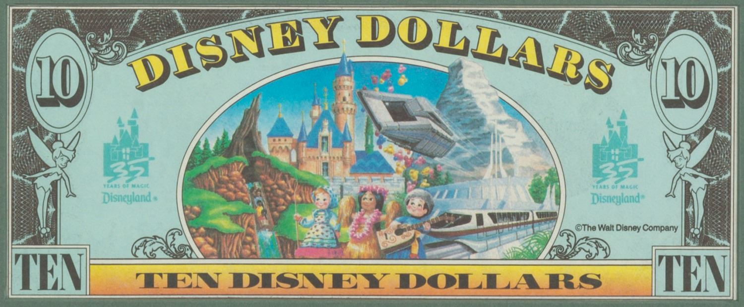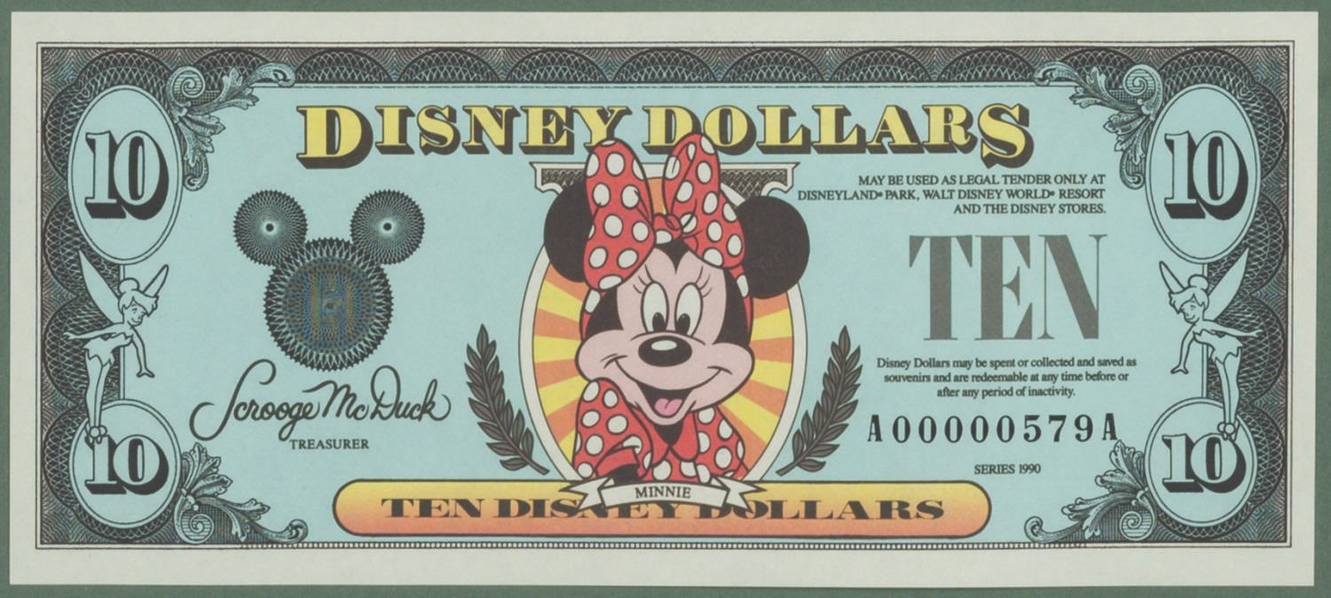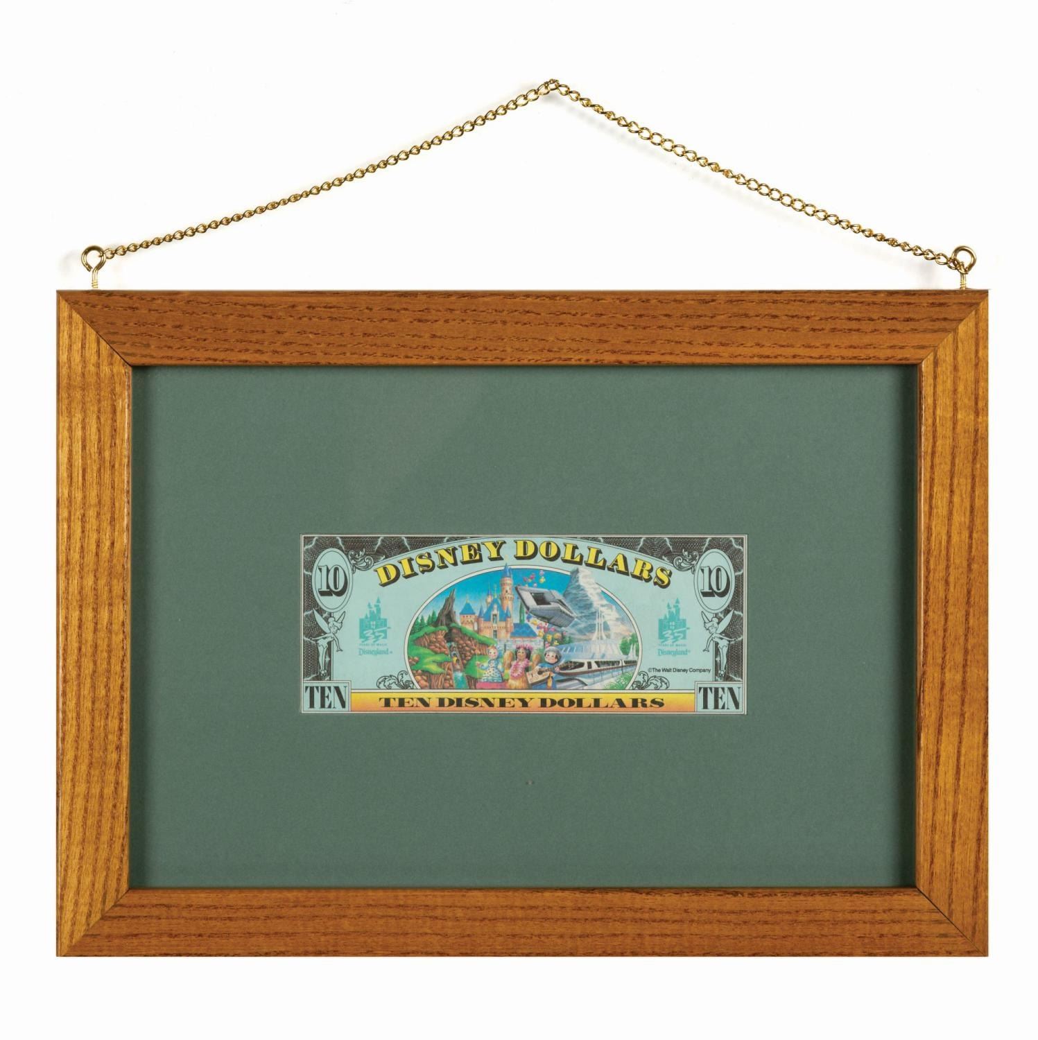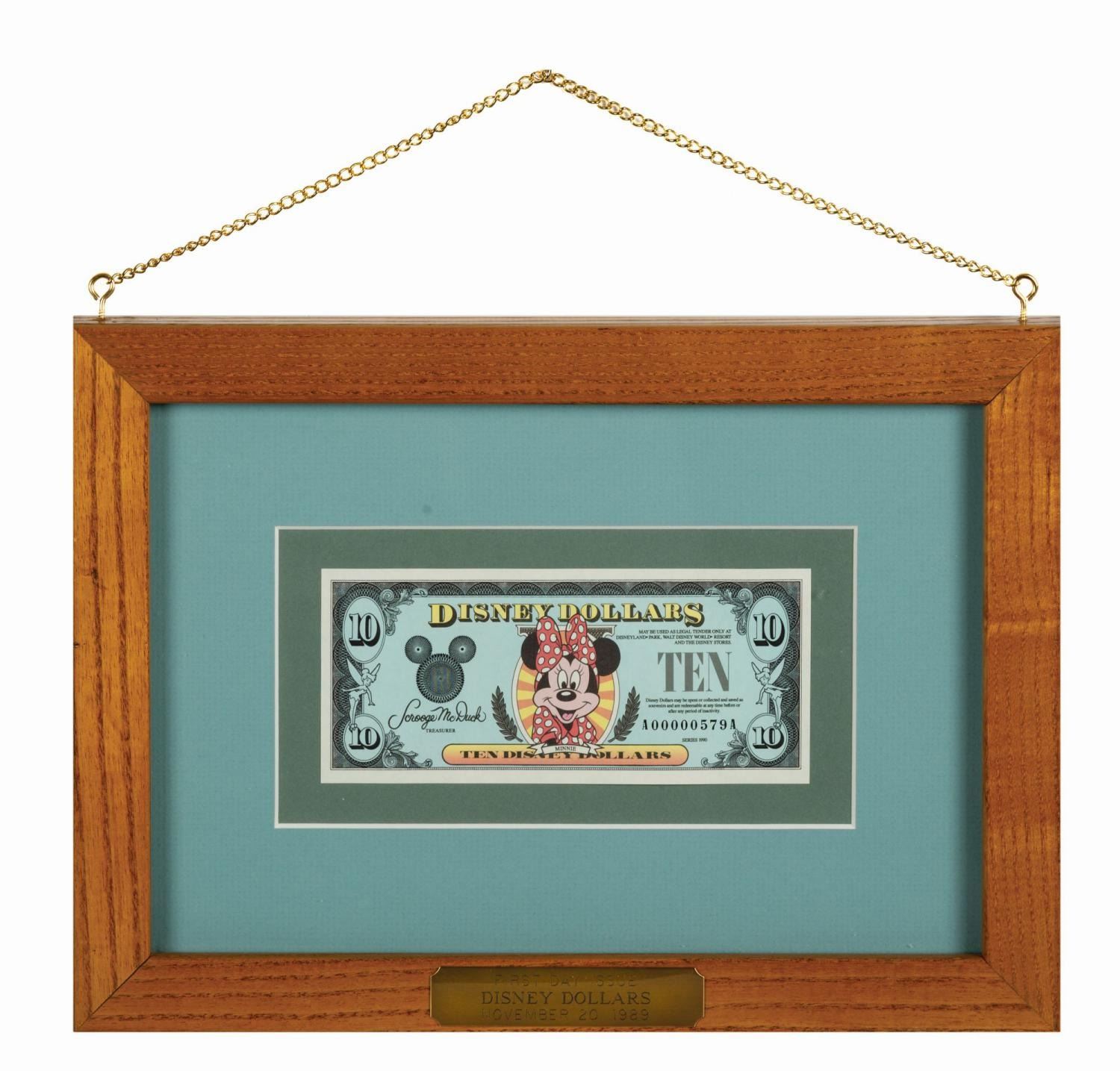 (Disneyland, 1989) A rare first day of issue Disney Dollar $10 denomination note. This note was printed at Disneyland and released into circulation on November 20th, 1989. Bearing a low serial number (A00000579A), the bill features a Portrait of Minnie Mouse on the face and commemorative imagery including that of the newly opened Splash Mountain as well as celebratory Disneyland 35th anniversary graphic (ahead of the festivities) on the back. It is presented in a double-sided glass frame showcasing both the front and back through the mat, with an engraved identification plaque, and chain for hanging. Measuring 2.75"x6.25" within the 9.25"x12.5" frame, the note is of fine grade.