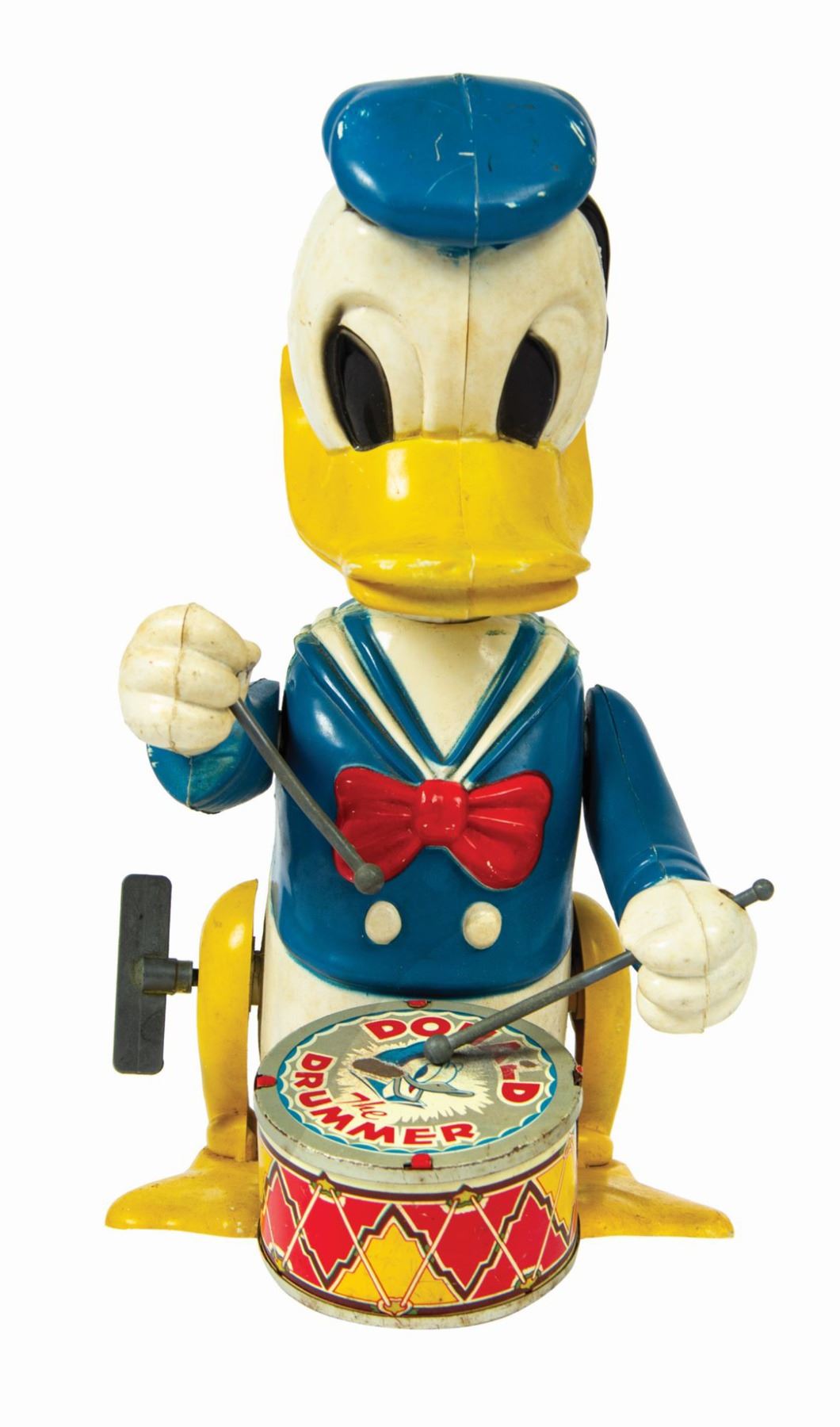 (Disney, c.1950s) A mechanical wind-up toy manufactured by Marx of Donald Duck as a drummer. The Donald Duck figure is constructed of plastic with a tin litho drum, metal drumsticks, and a metal winding key. An internal wind-up mechanism causes the body and head to move up and down while the arms play the drum. The toy winds up and the mechanicals operate with manual assistance but would require service to restore full functionality. Measuring 10”x5” and 7” deep, the toy is in good condition and exhibits some scratching, soiling, and paint loss. The rear segment of one drumstick has broken off and is no longer present.