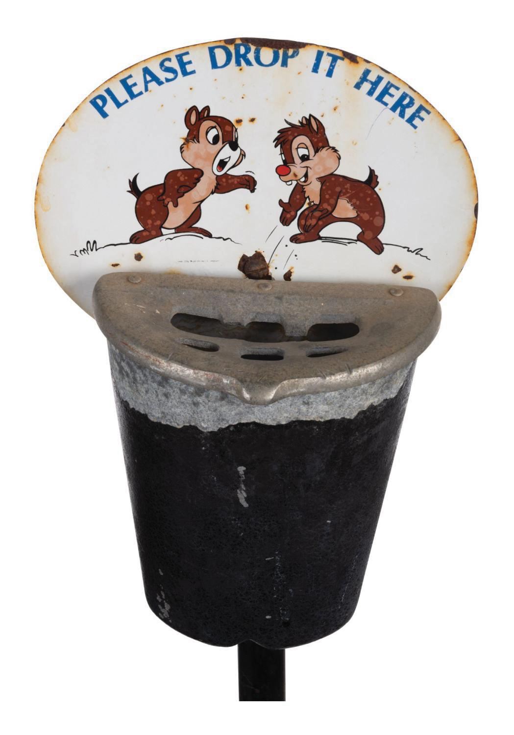 (Disney, 1986) A smoking stand, once used in the outdoor dining and break areas by Walt Disney Studios and Imagineering employees. The metallic smoking stand features a hinged lid concealing the dump ashtray, intended to contain ashes within, and features the popular Chip and Dale encouraging staff to "please drop it here." The piece represents a bygone era of the Company, when tobacco use was much more common than today. Measuring 40.5" tall with a base diameter of 10.25", the smoking stand displays in very good used condition, exhibiting some surface wear and oxidation throughout, as well as some denting to the hinged aluminum lid.