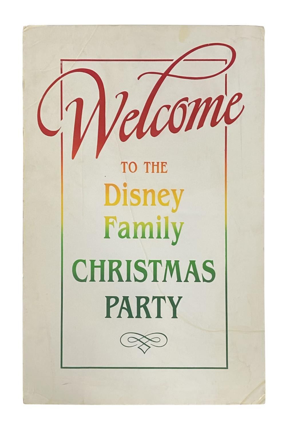 (Disney, c.1980s-90s) An original entrance sign created to welcome guests to the Disney Family Christmas Party. The Disney Family Christmas Parties were holiday celebrations that also encouraged employees to bring a gift to be given to an underprivileged child. The sign is screen printed on foam board and measures 26"x16". It is in fair condition with some discoloration from use, and a few creases throughout.