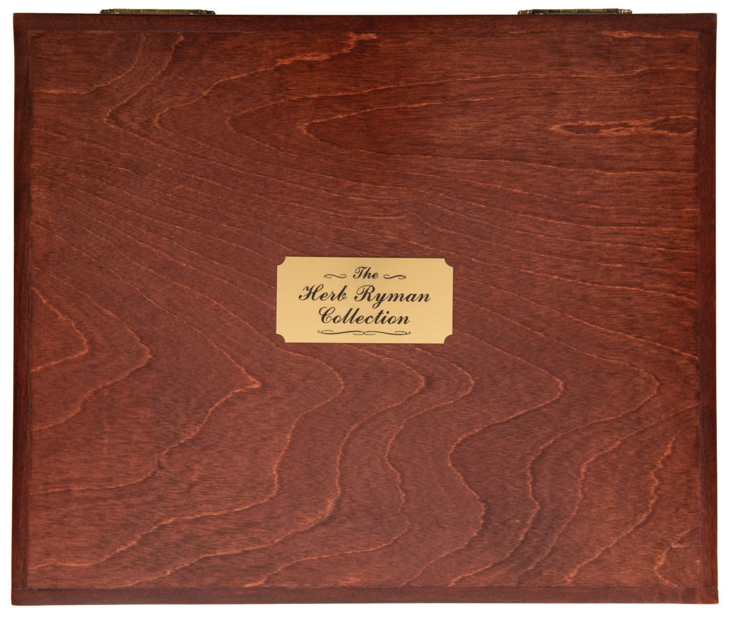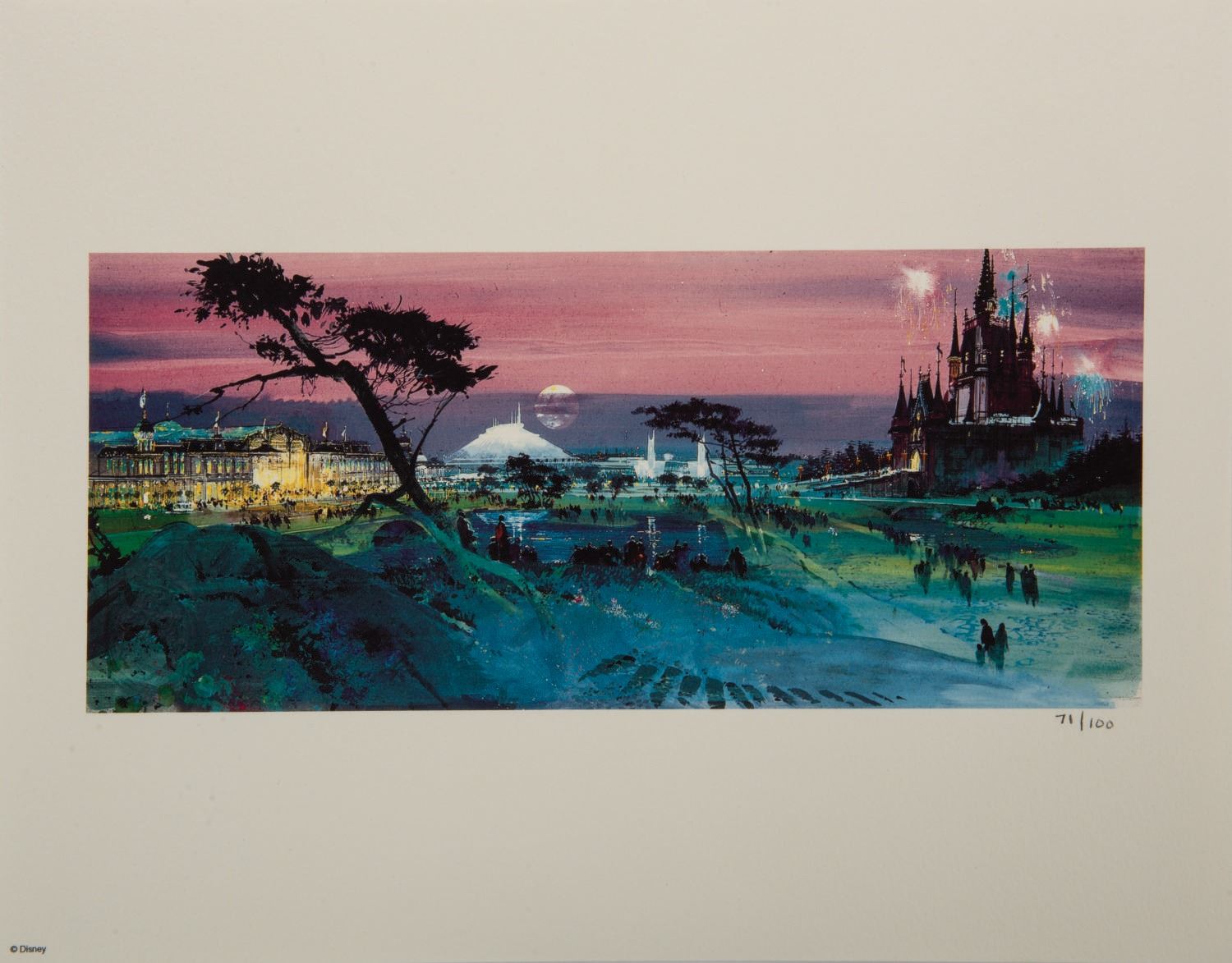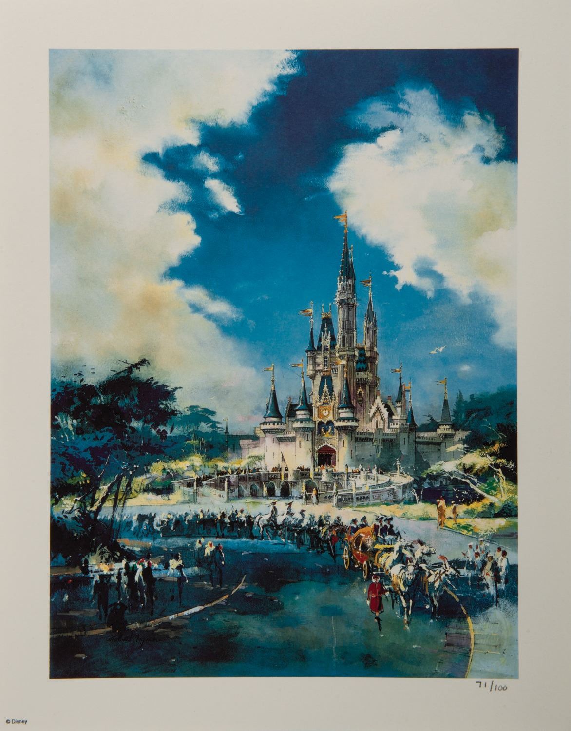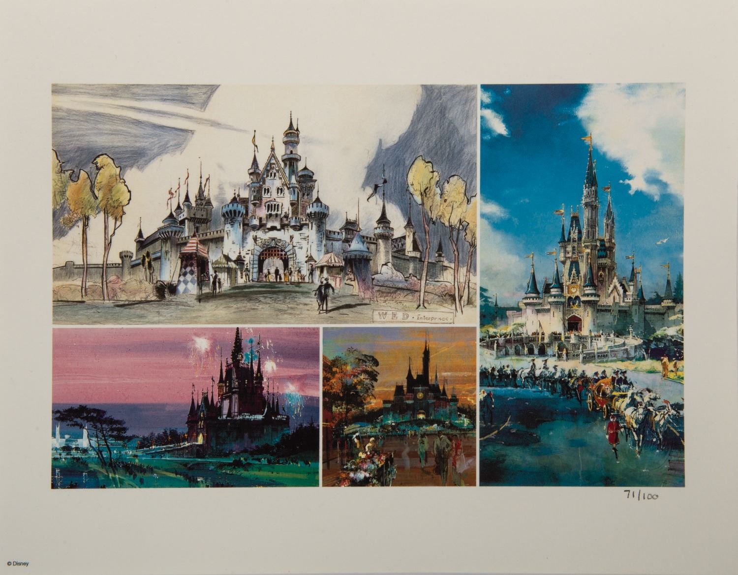 (Disneyland, 2000) A Boxed Set of (5) giclee lithographs featuring Herb Ryman's concepts for the castles from Disney Parks around the world. Released exclusively through The Disney Gallery, the artwork is presented inside a finely crafted wooden box with plaque, and lightly bound to a velvet board by a black ribbon with white archivists' gloves for handling are included. . Measuring 16"x13" and 3.5" deep, the contents and box displays in fine condition.